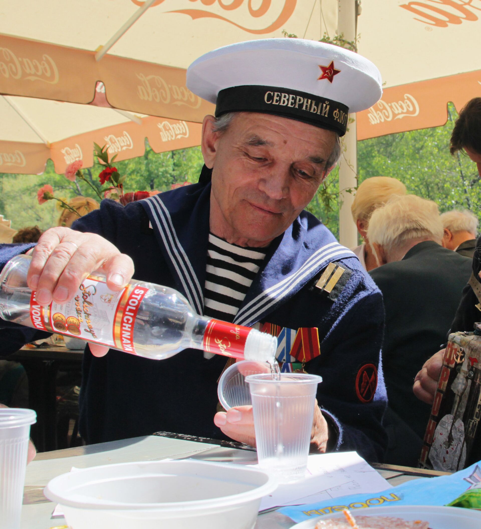 El expresidente del Consejo de la Federación —Cámara Alta del Parlamento—Serguéi Mirónov bebe un vaso de vodka a la manera cosaca —de una espada 'shashka'— durante su visita a la región de Rostov en 2005