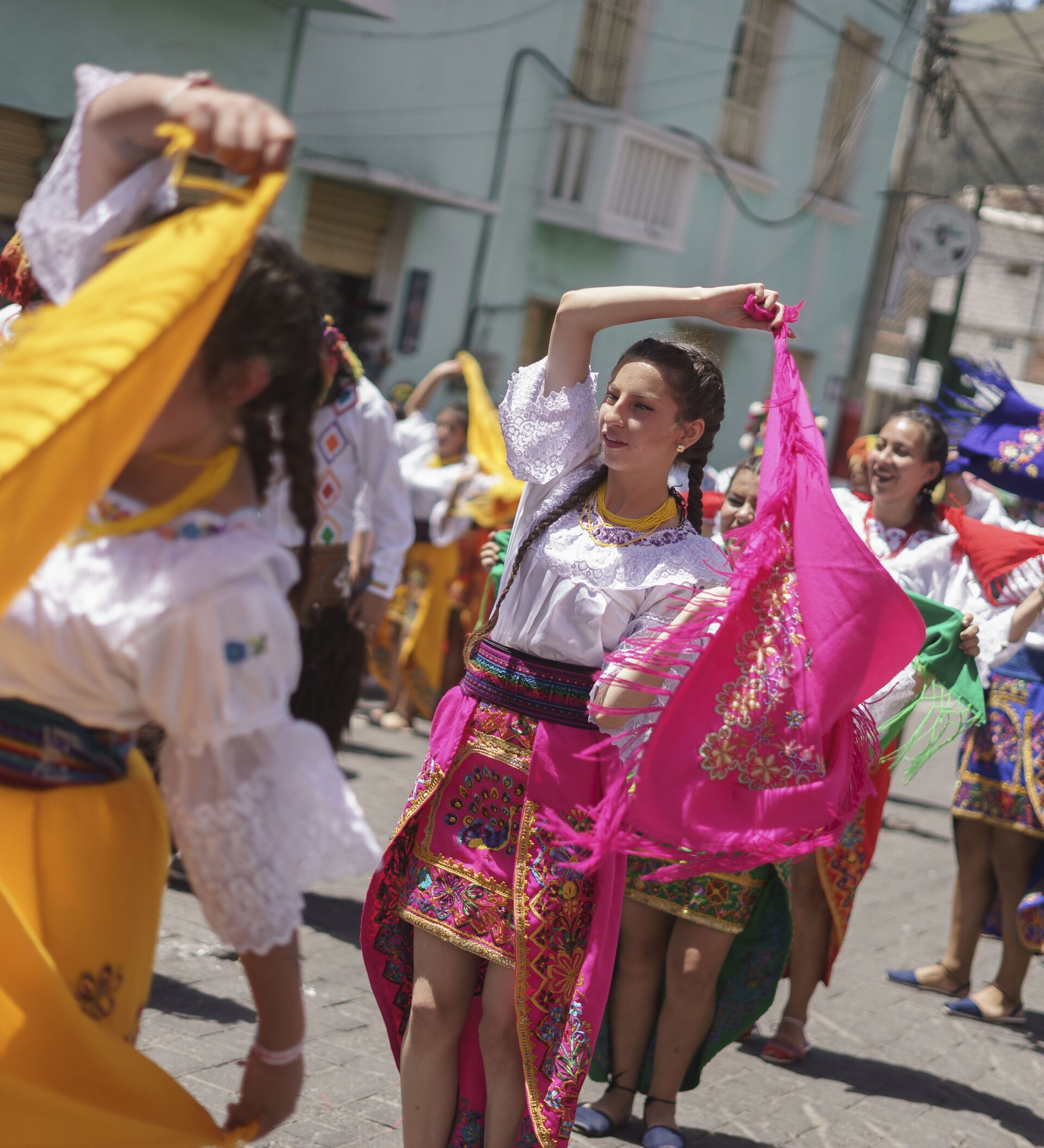 El domingo 11, en cambio, es la fiesta masiva, la comparsa mestiza en la que participan aproximadamente 60 grupos no solo de Ecuador, sino de Colombia y Perú que se esfuerzan por ganar los aplausos de una numerosa audiencia apostada por más de cinco horas en las calles de la pequeña ciudad.