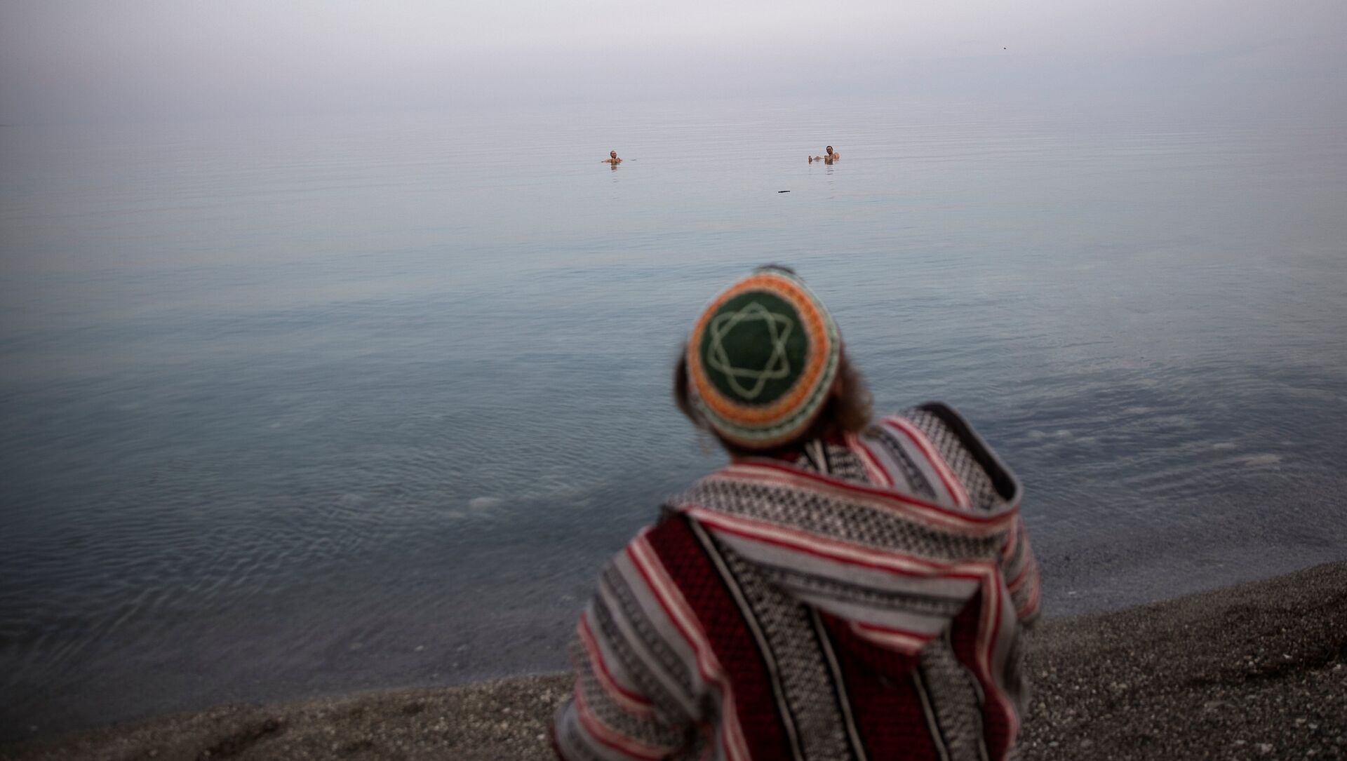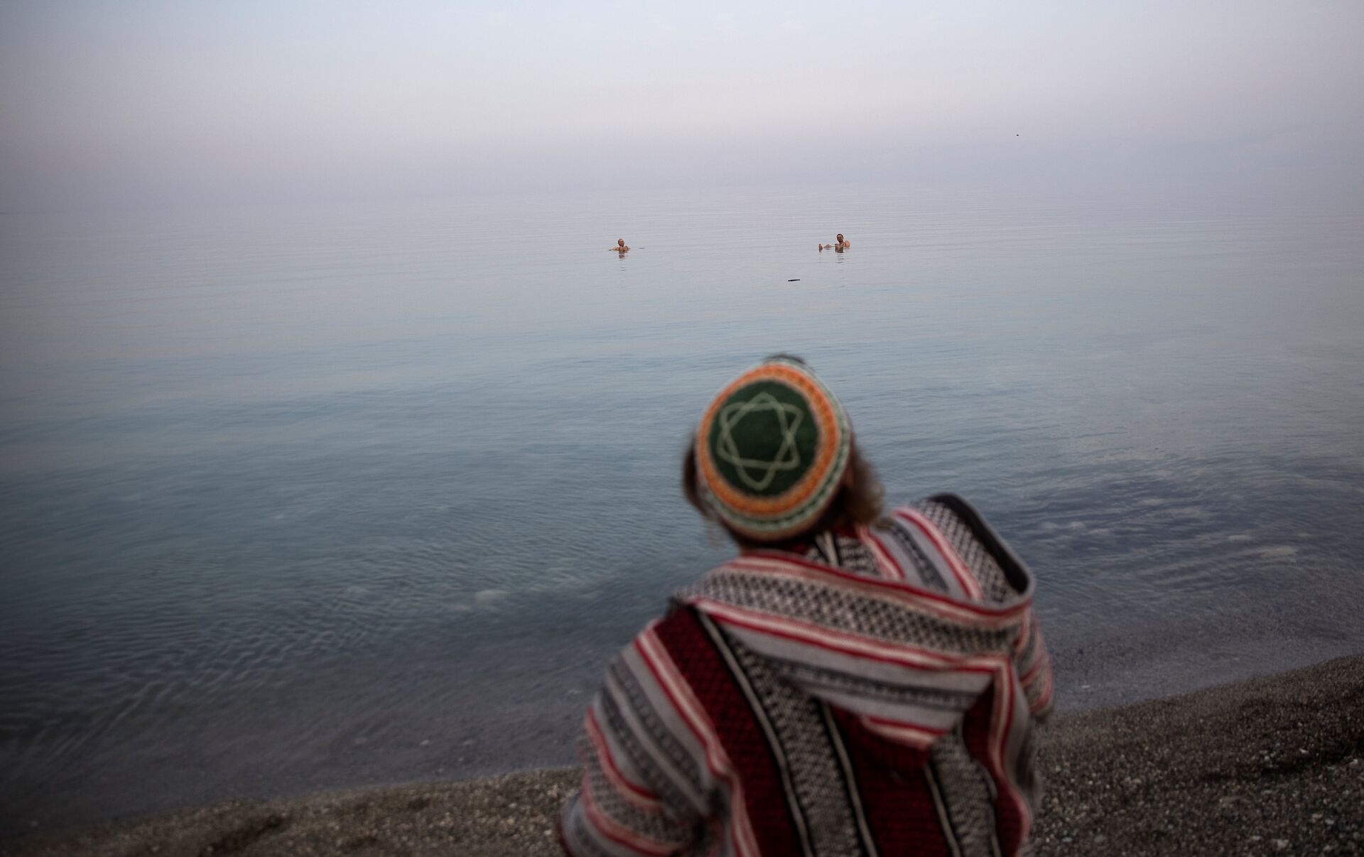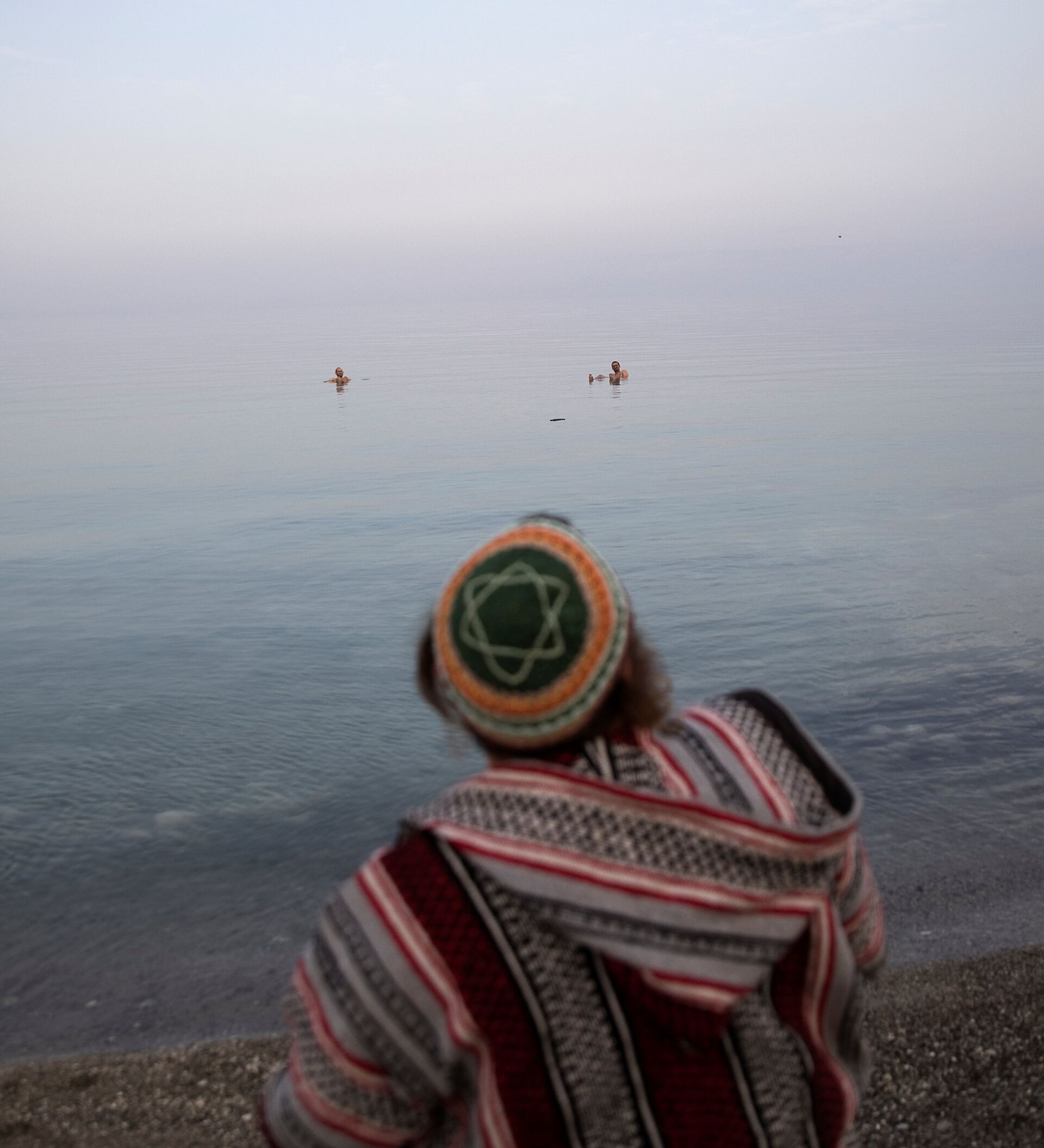 Una persona con un pañuelo palestino descansando a la orilla del mar Muerto, cerca de Metzoke Dragot.