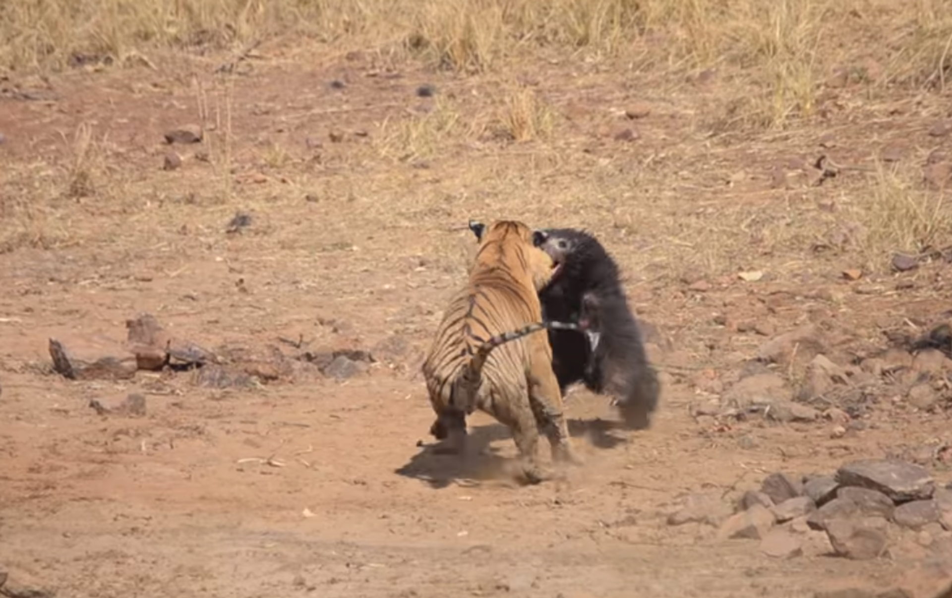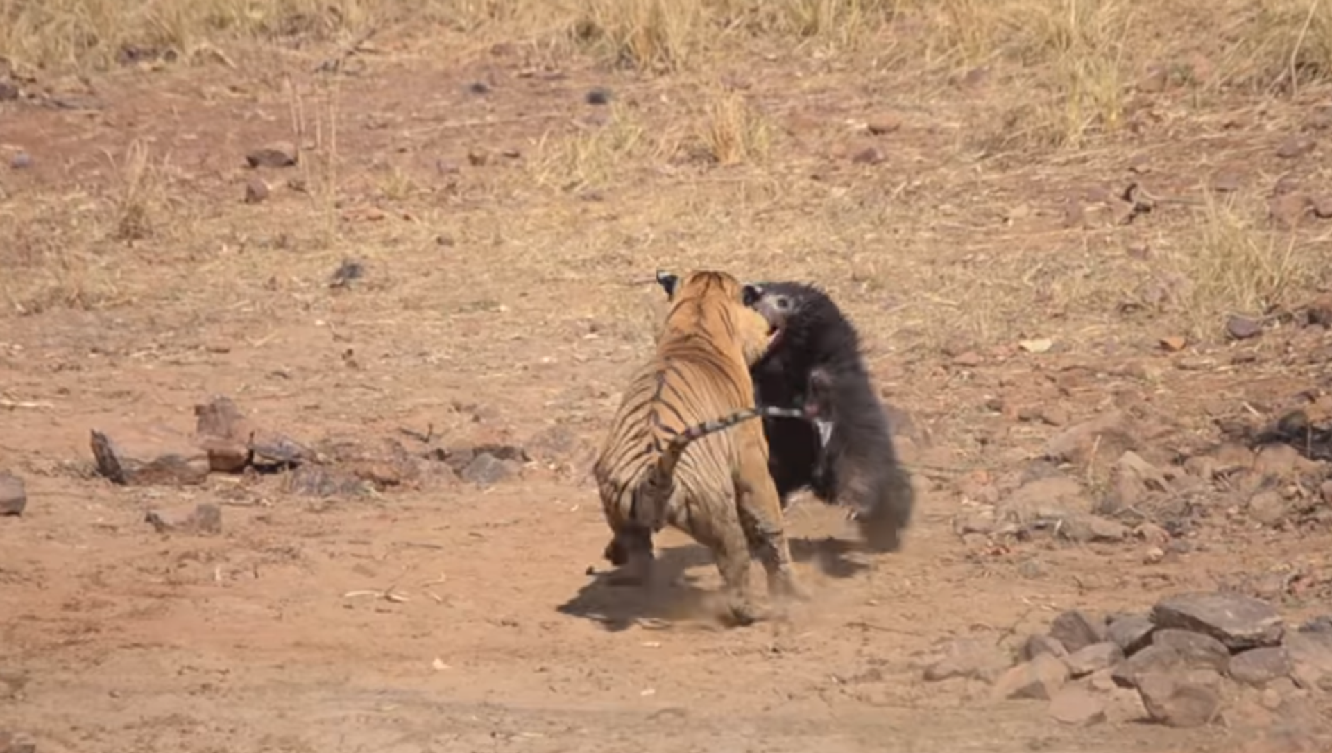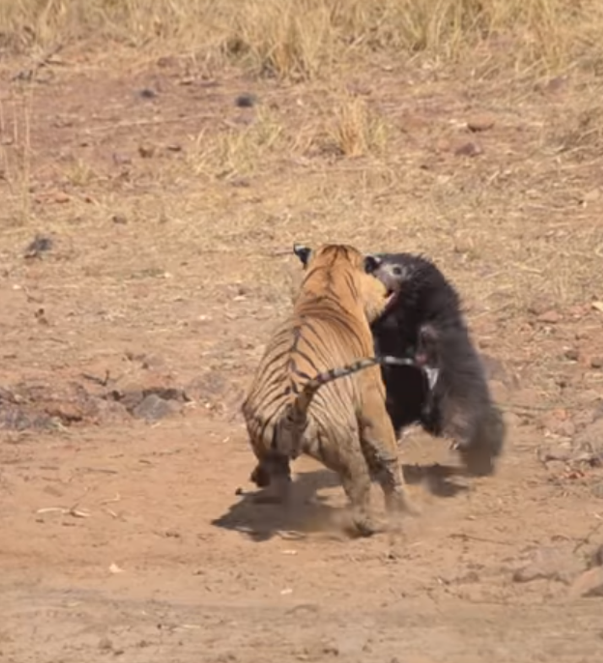 De acuerdo con la cadena NDTV, el incidente se produjo en el Parque Nacional de Tadoba. El naturalista Akshay Kumar destacó que el tigre —de 7 años de edad— fue el que atacó primero a la osa y su osezno, que se acercaron hasta un estanque para saciar la sed. Sloth Bear Chases Off Tiger