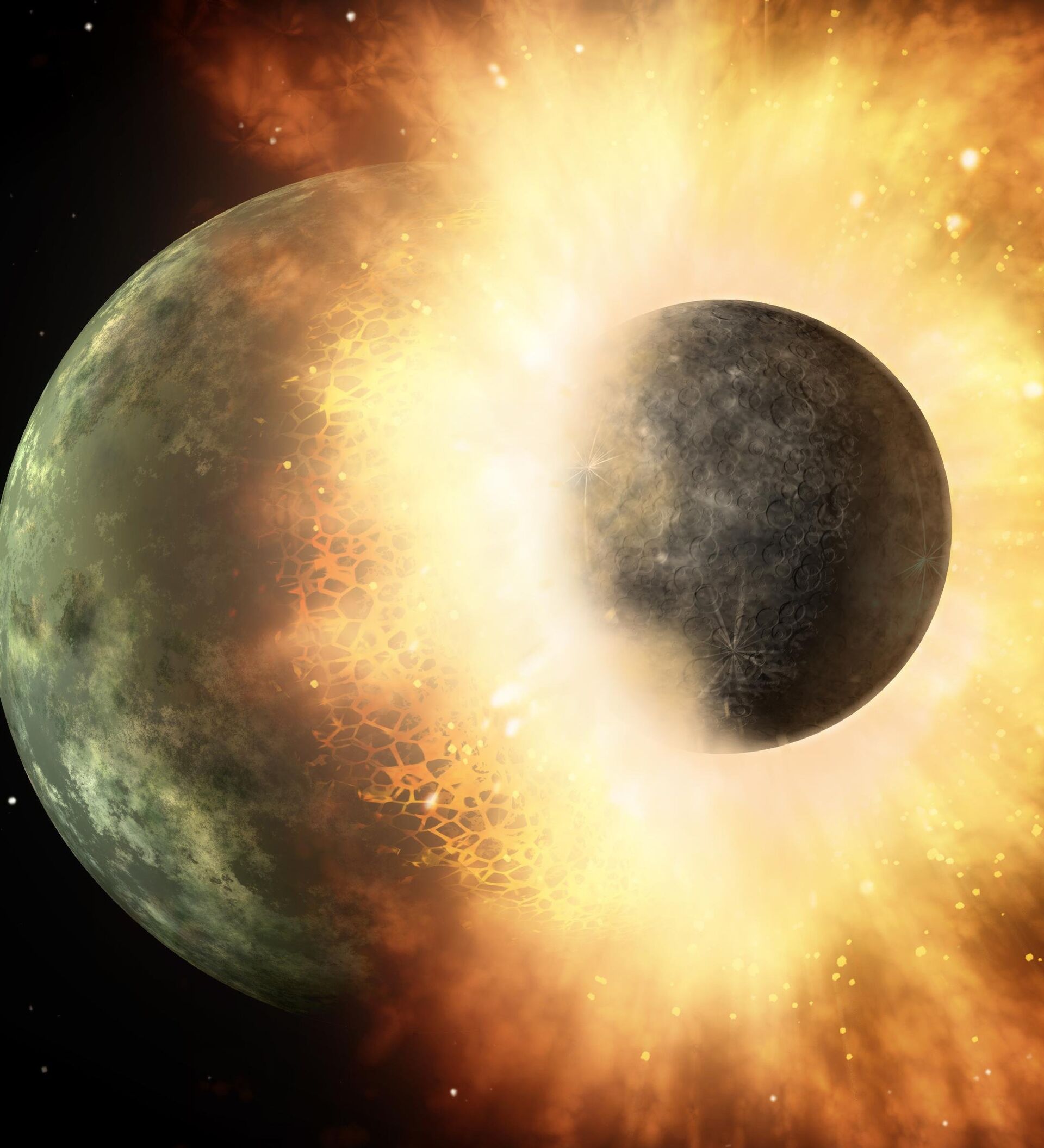 Algunos de estos protoplanetas terminaron sus días consumidos por el Sol; otros fueron expulsados por completo del sistema solar. Eventualmente se producían choques planetarios, uno de los cuales dio nacimiento a nuestro satélite natural, la Luna.
