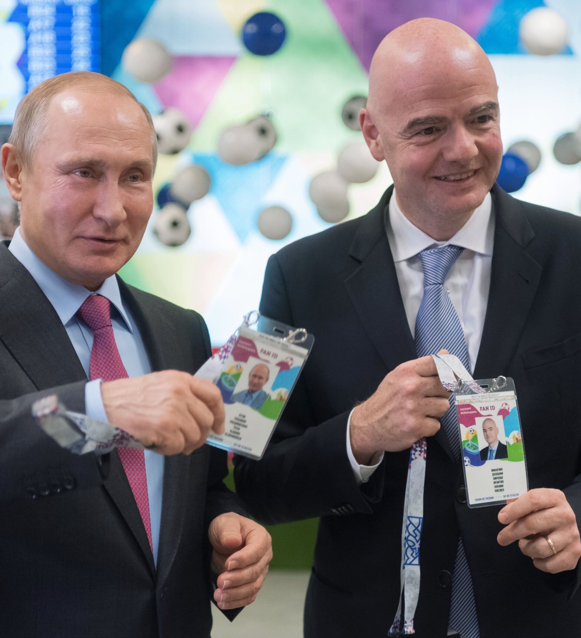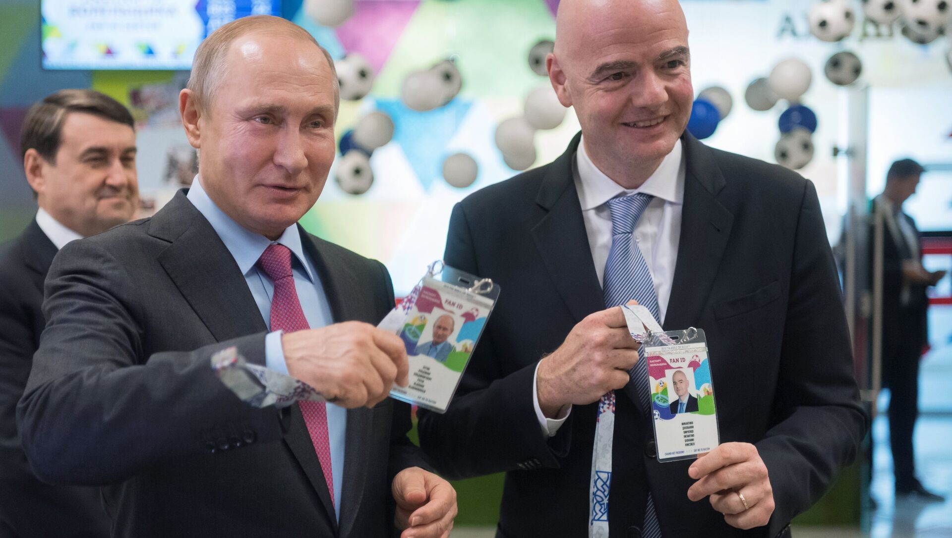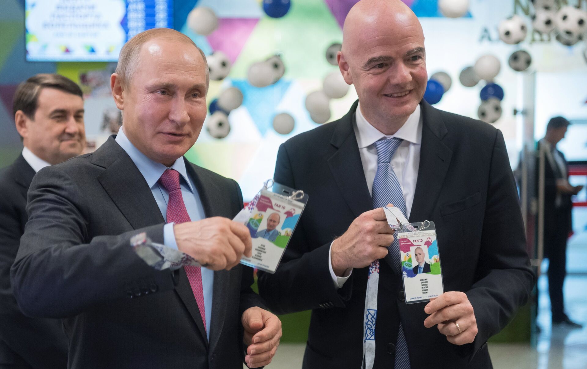 Acompañados por el jefe del Ministerio de Comunicaciones de Rusia Nikoláy Nikíforov, Putin e Infantino visitaron un centro ubicado en la ciudad de Sochi —a poca distancia del estadio Fisht donde se disputarán varios partidos de la Copa del Mundo 2018— para recibir sus pasaportes de aficionados.