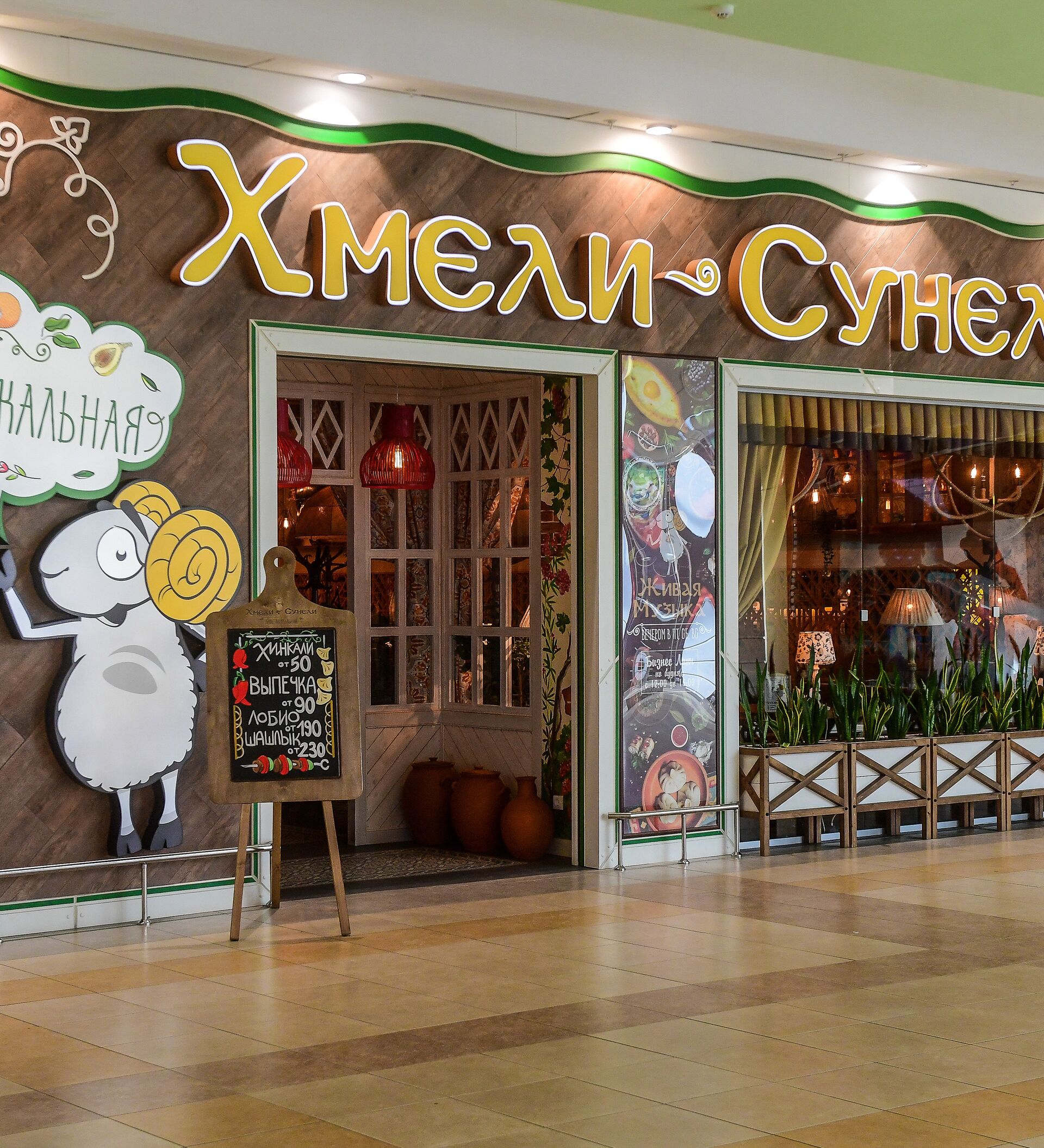 En Jmeli Suneli se sirven todo tipo de jinkali —unos raviolis grandes— y verduras a la parrilla, la especialidad de la casa. En una gran tabla de madera se sirven champiñones, pimiento dulce, cebolla, tomates y berenjenas asadas.