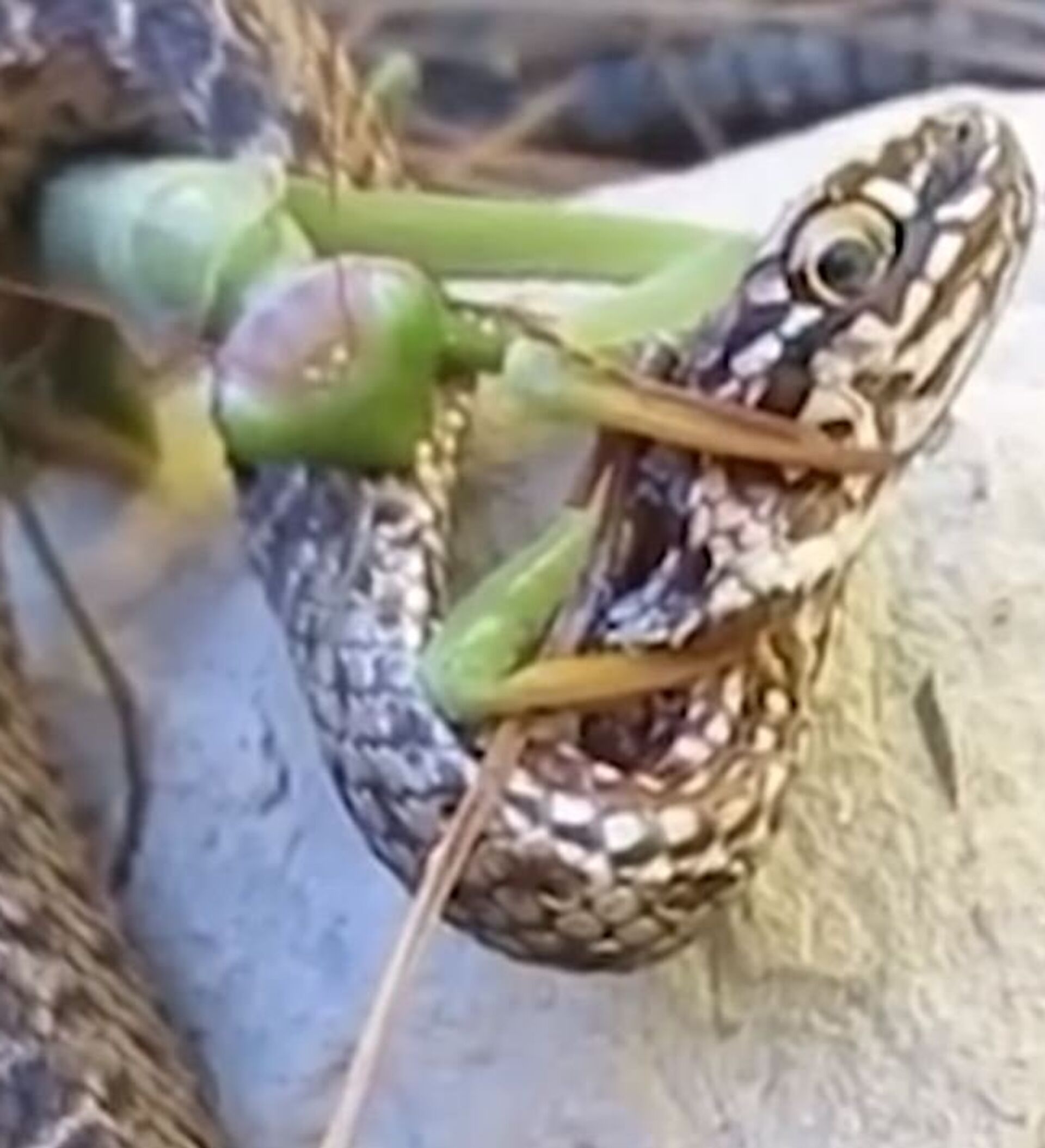 La víctima intenta escapar, pero no logra hacerlo. Al final, la serpiente queda paralizada y la mantis comienza a devorarla.