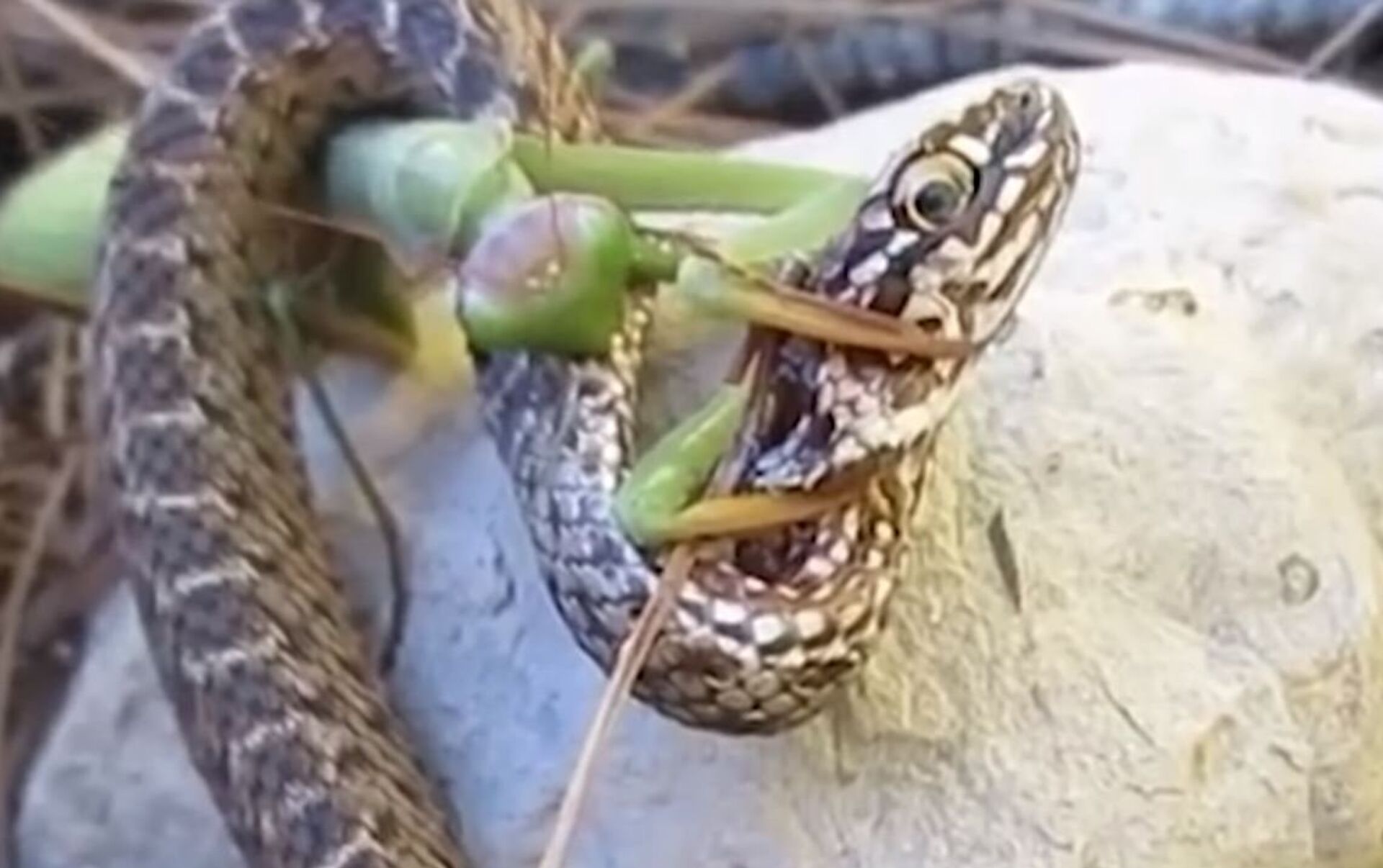 En las imágenes se observa una mantis religiosa que decide atacar a una pequeña serpiente. Una vez la culebra se aproxima, el insecto se arroja sobre ella.