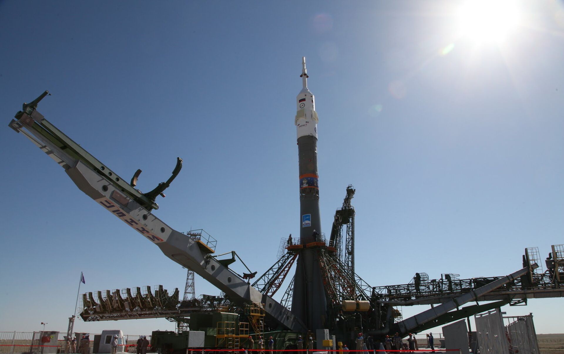 © Foto : RoscosmosEl cohete Soyuz-FG en el proceso de instalación en la plataforma de Gagarin en el cosmódromo de Baikonur