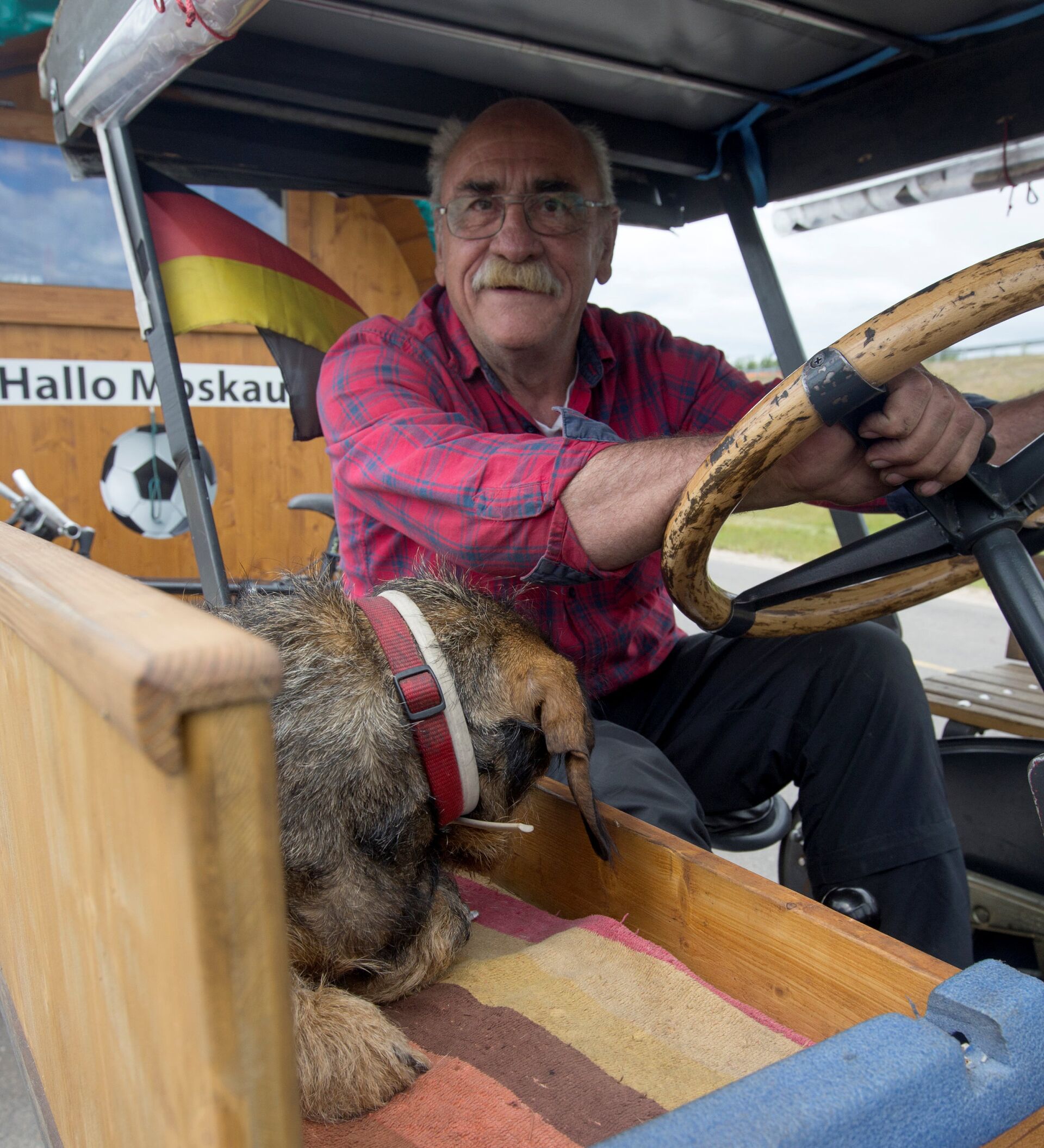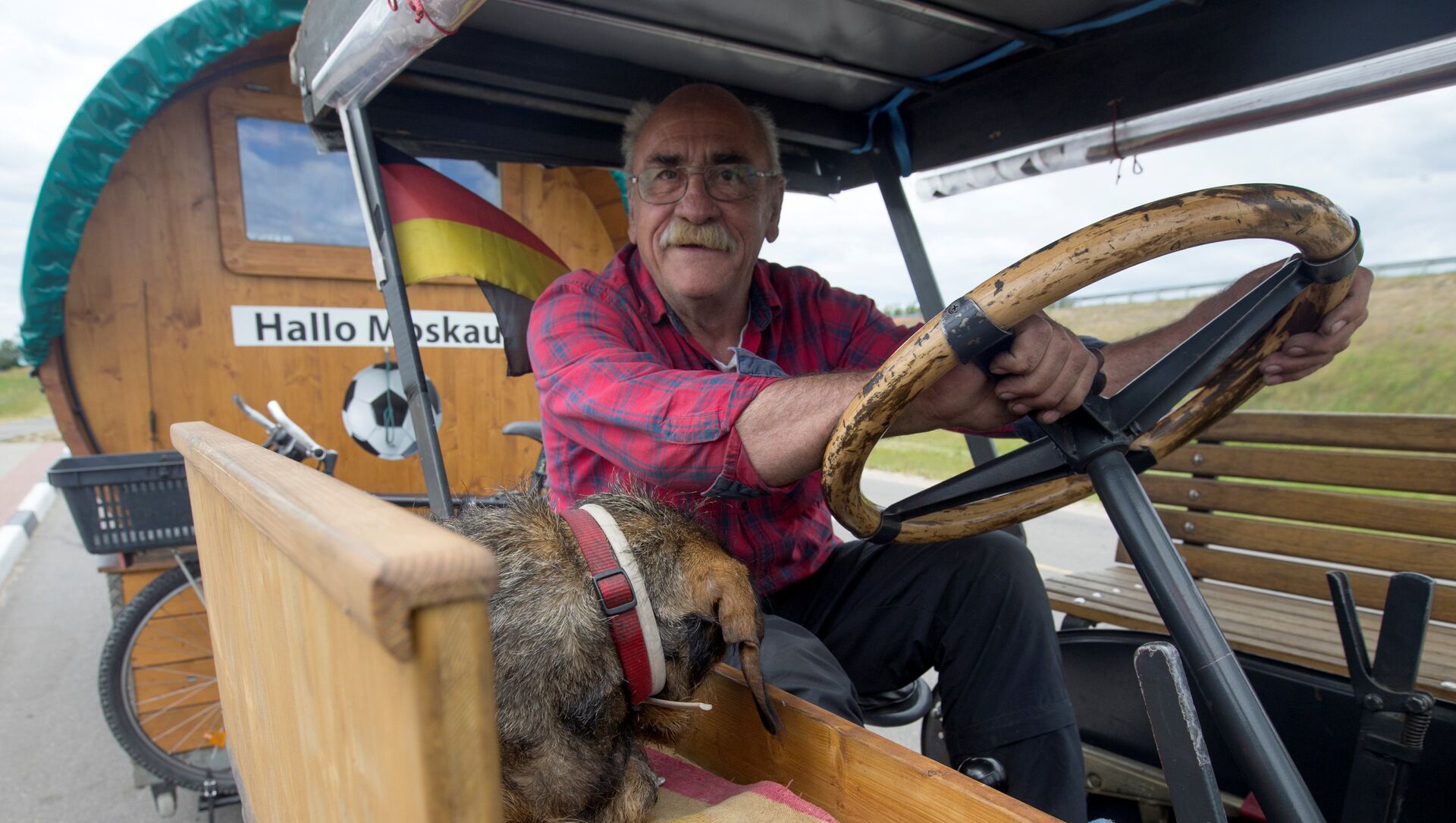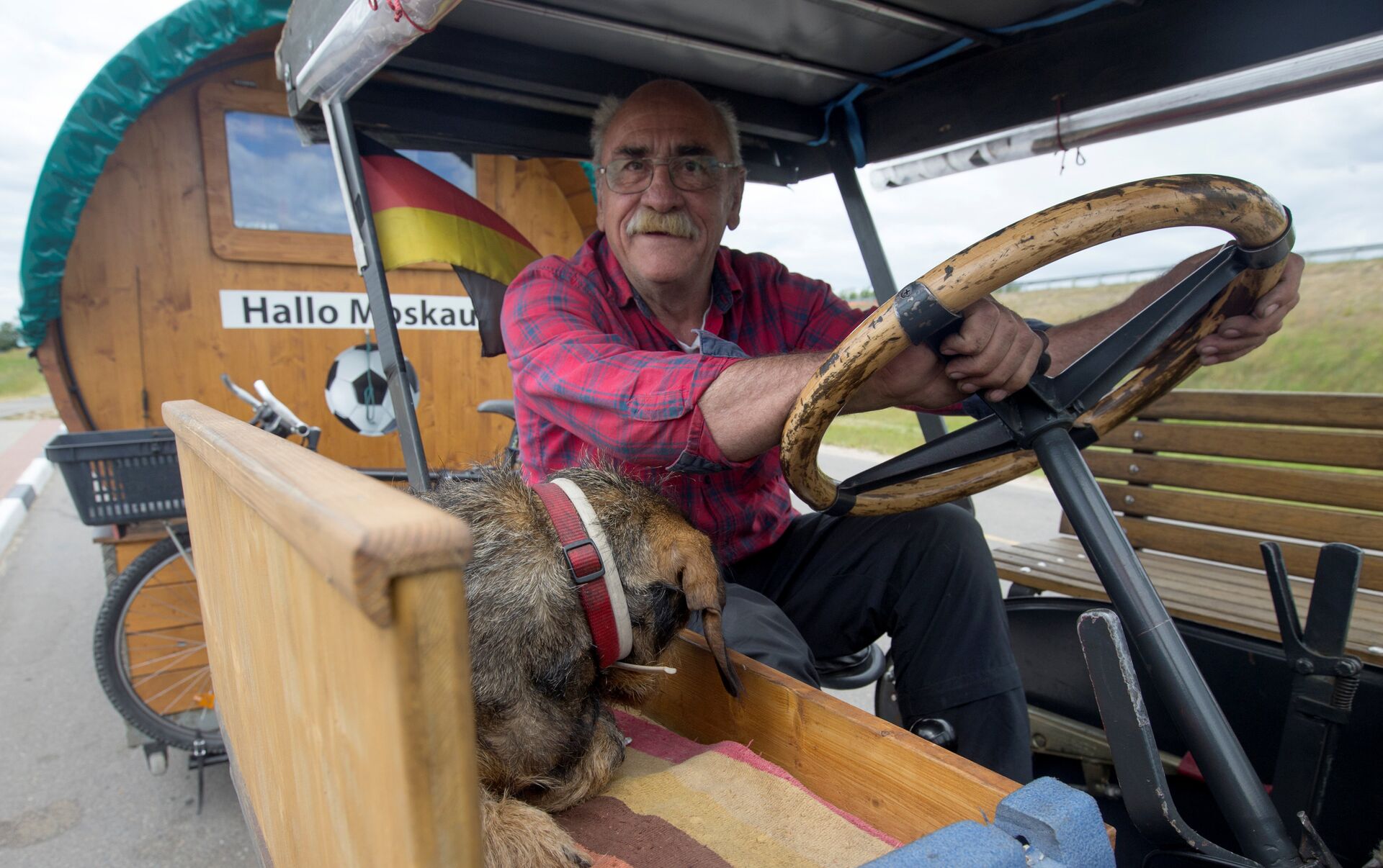 Acompañado de su perro, Hexe, el hincha alemán va cruzando países en su inusual vehículo —un tractor Lanz Bulldog del año 1936— y con su minicasa en forma de barril de cerveza.