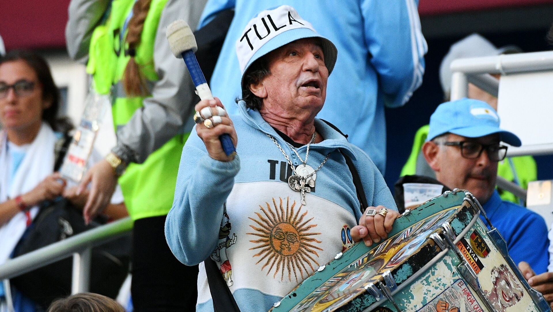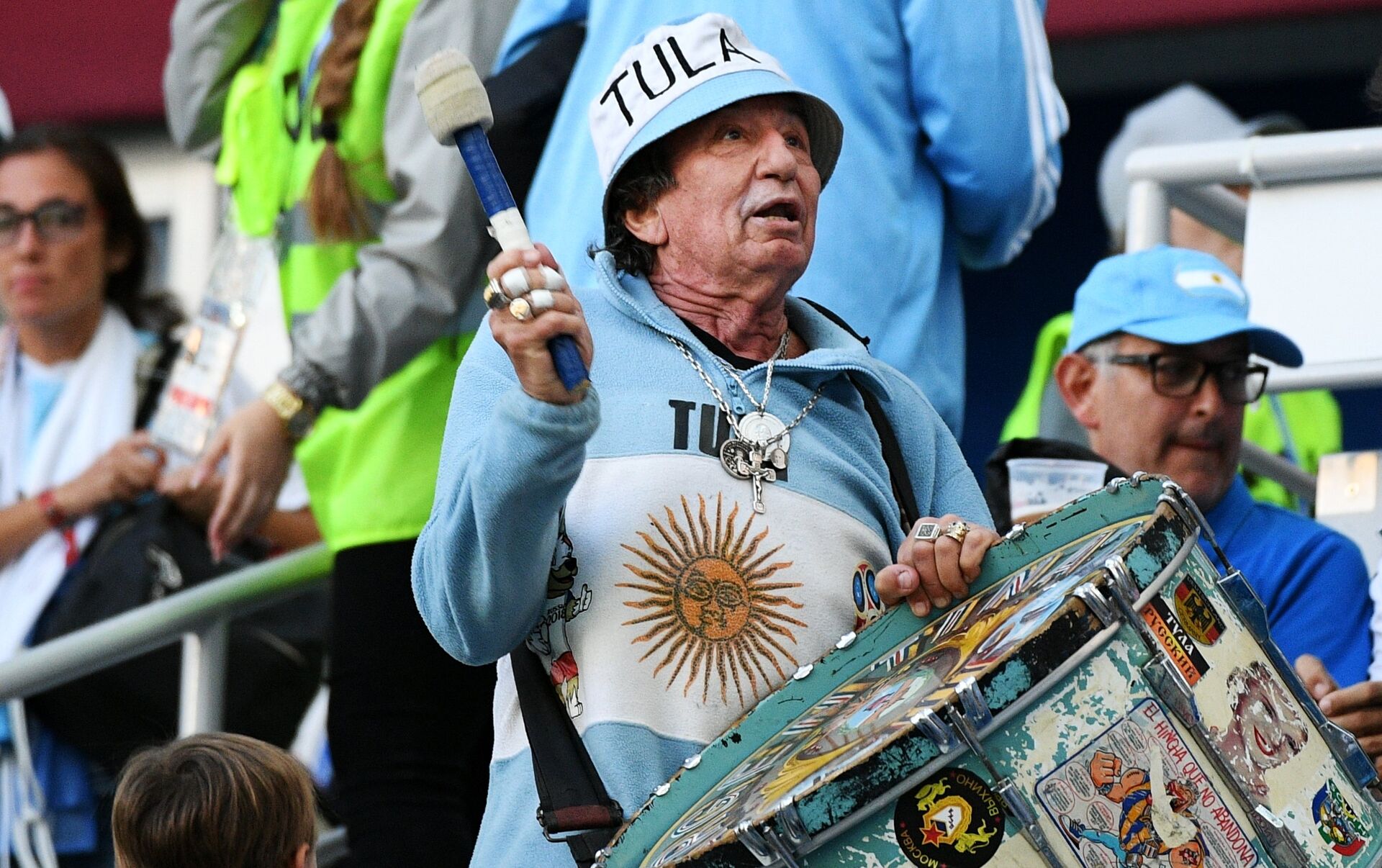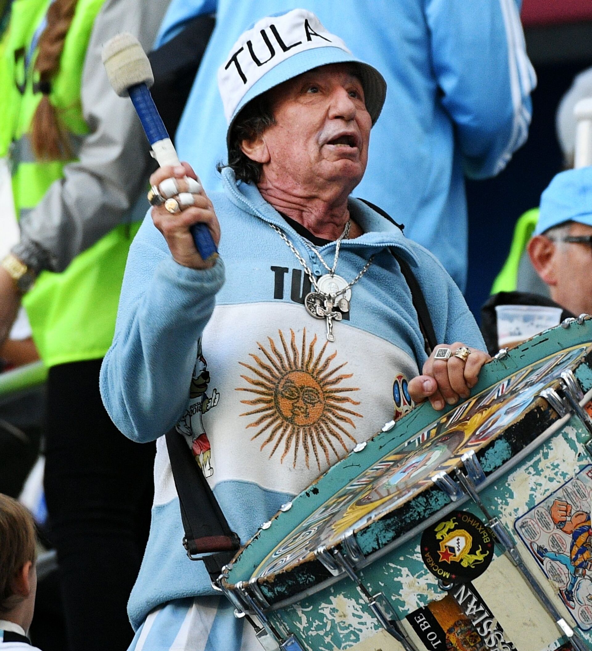 Tula nació en 1940 y no ha faltado ningún juego de la selección argentina desde el año 1974. El hincha asiste a cada partido de su selección con su característico tambor. El mundial de Rusia es la duodécima copa que visita.
