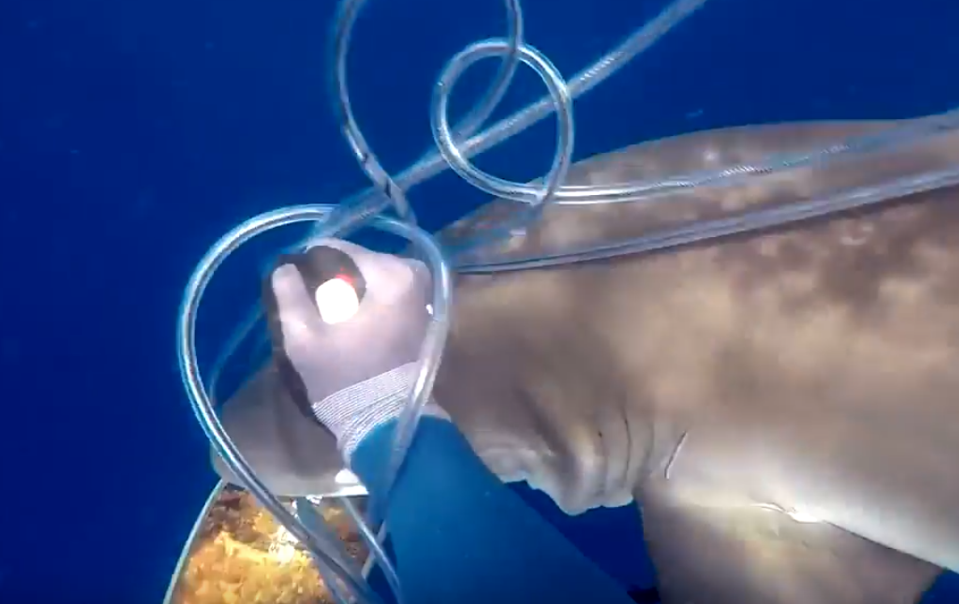 Ni Indiana Jones: un buzo lucha con un machete contra dos tiburones por un atún
