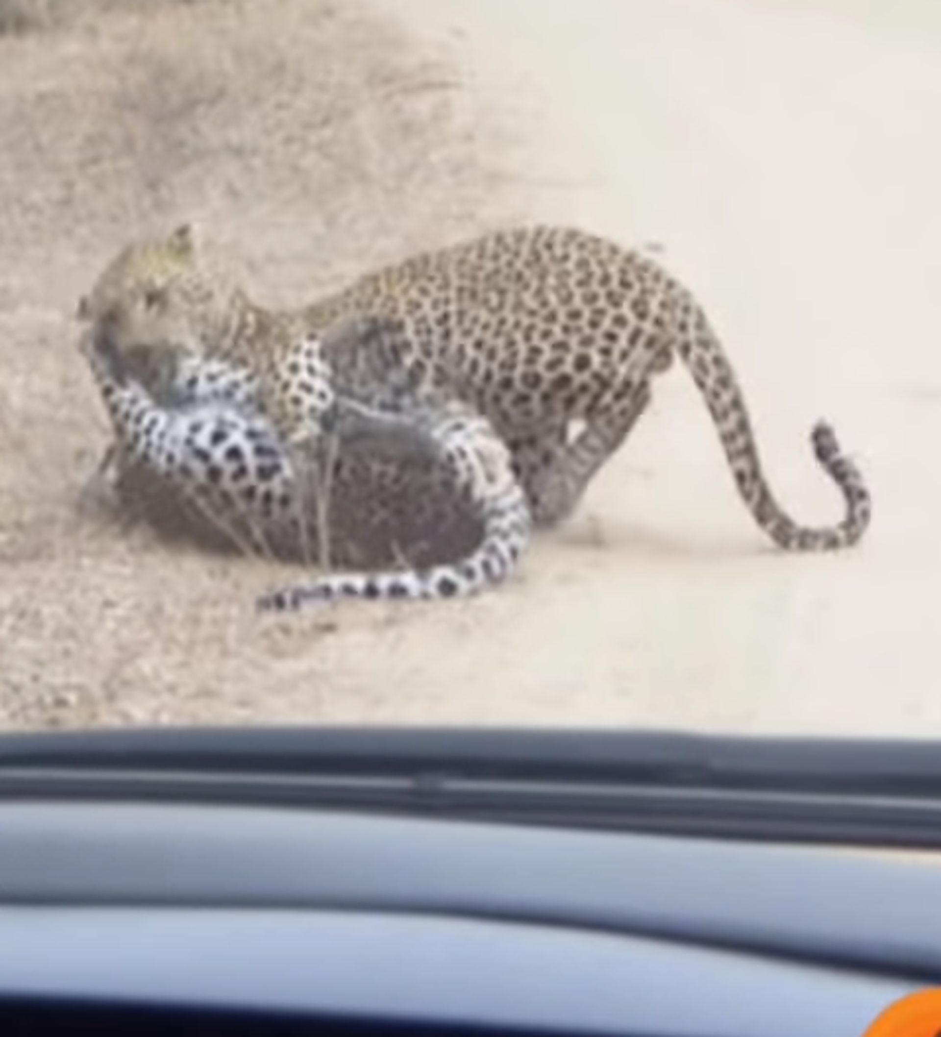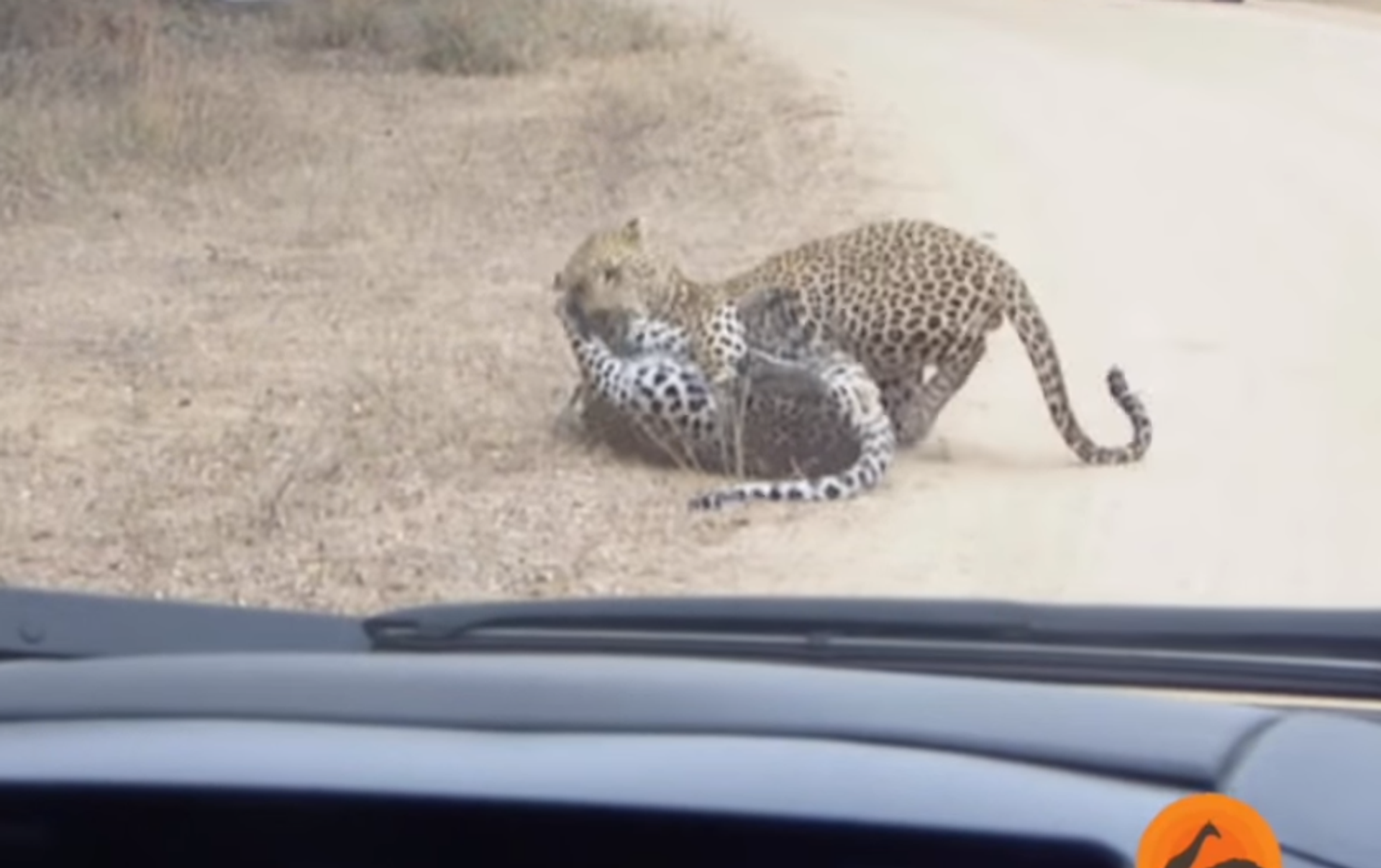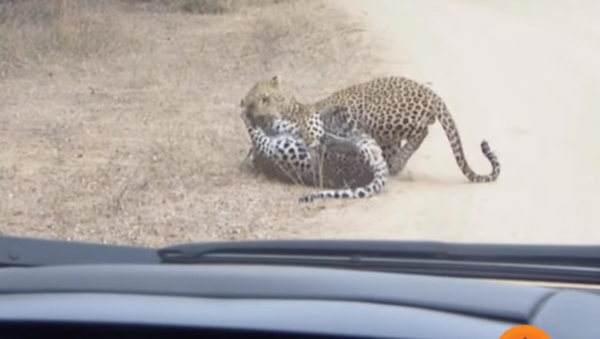 Ryan Jenkins, un carpintero, fue quien grabó la pelea. Explica que se toparon con los felinos en plena carretera y que al principio pensaron que se trataba de una lucha encarnizada entre un leopardo y un impala. Al cabo de unos segundos se dieron cuenta de que se trataba de dos depredadores y que uno de ellos, el más pequeño, sucumbía ante el otro.