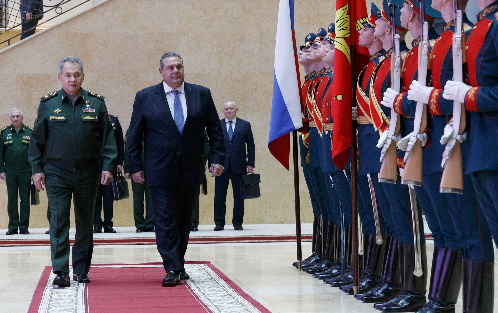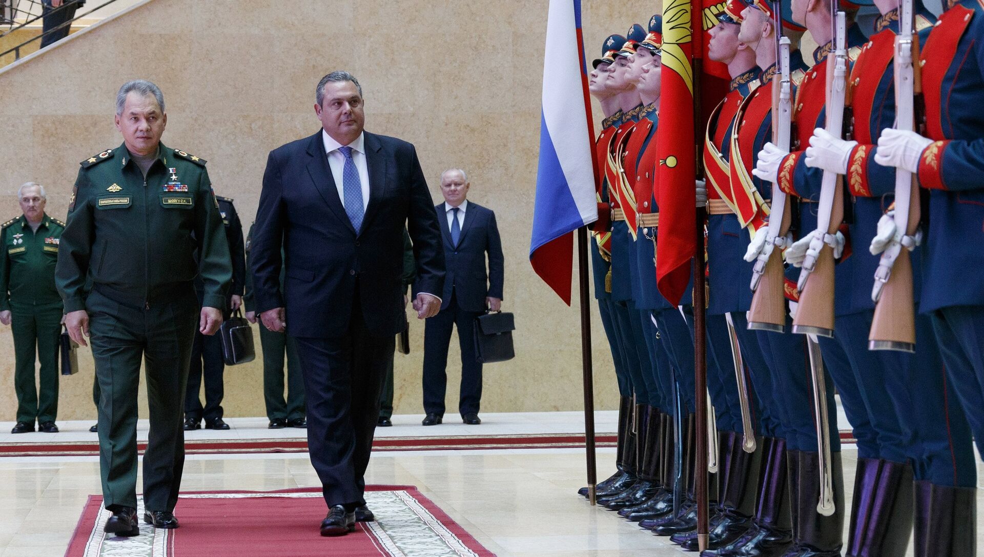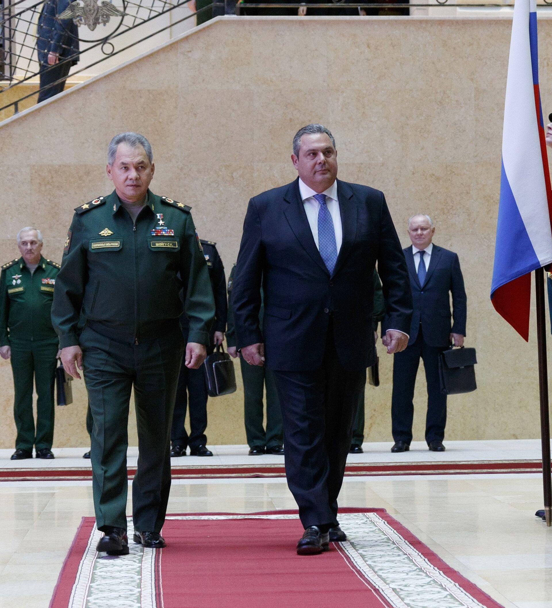 Al comenzar el encuentro, Shoigú felicitó a Kamenos y a todo el pueblo griego con la fiesta nacional en memoria del 28 de octubre de 1940, fecha en que Grecia se unió a la lucha contra el nazismo.