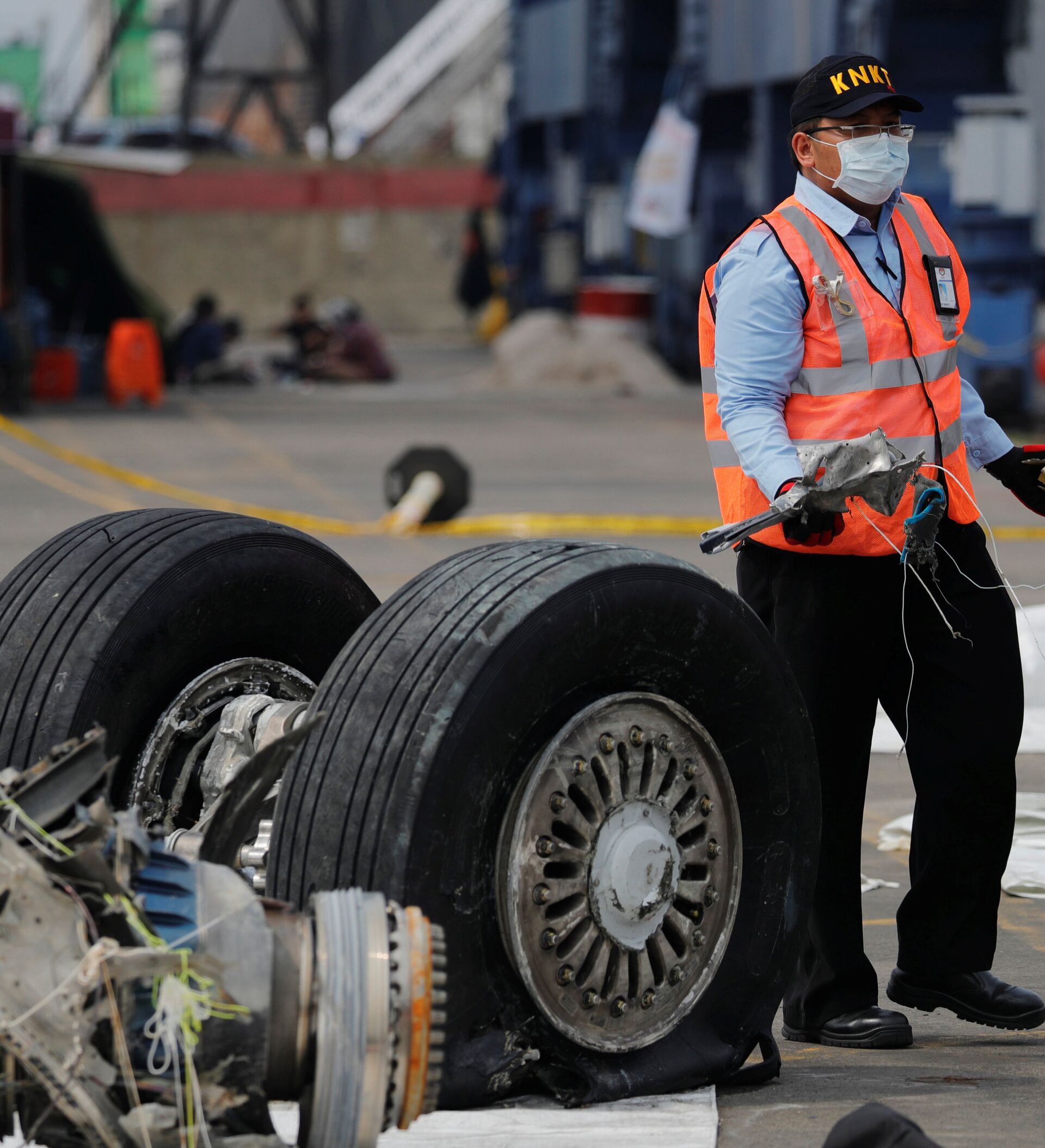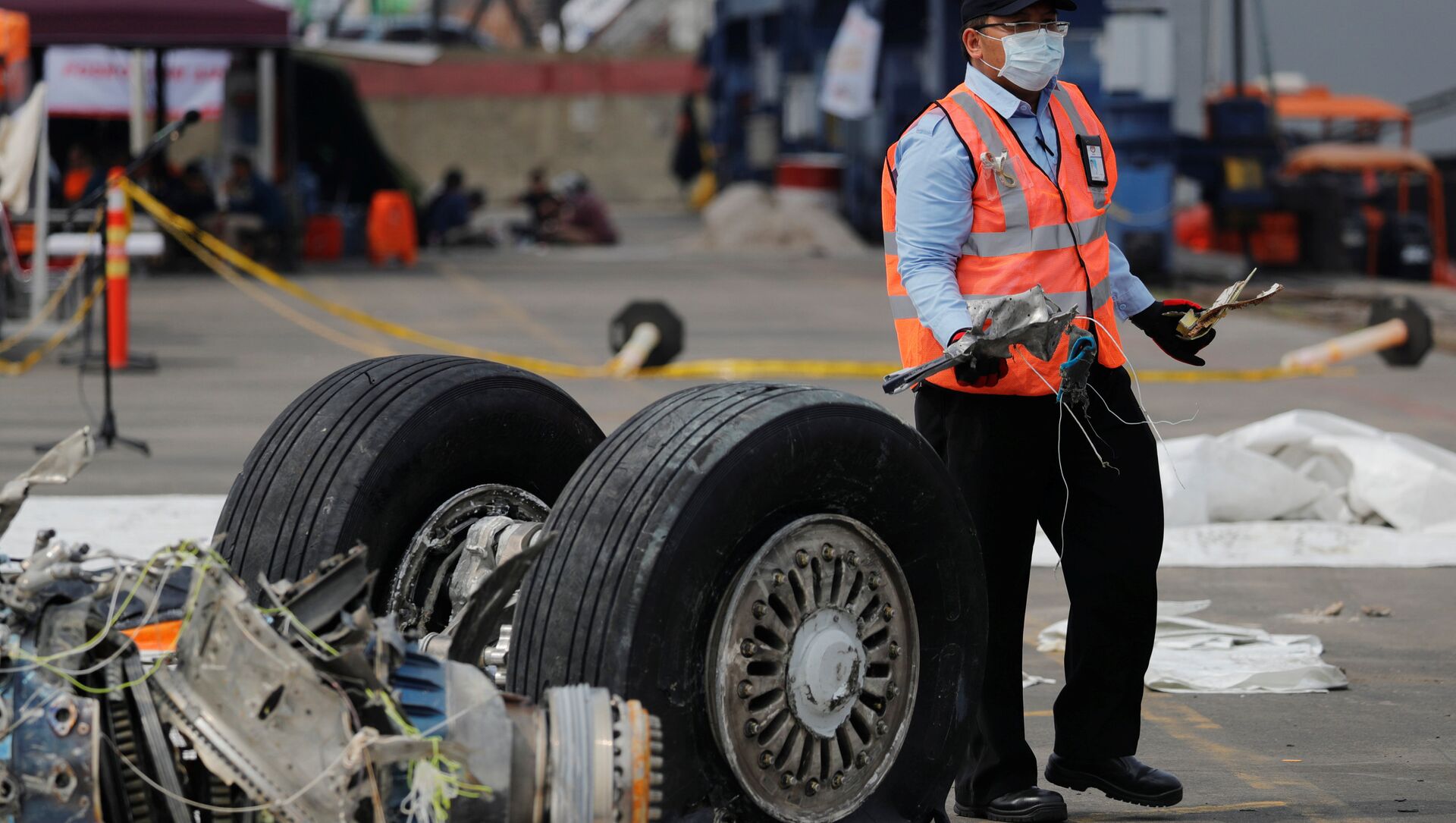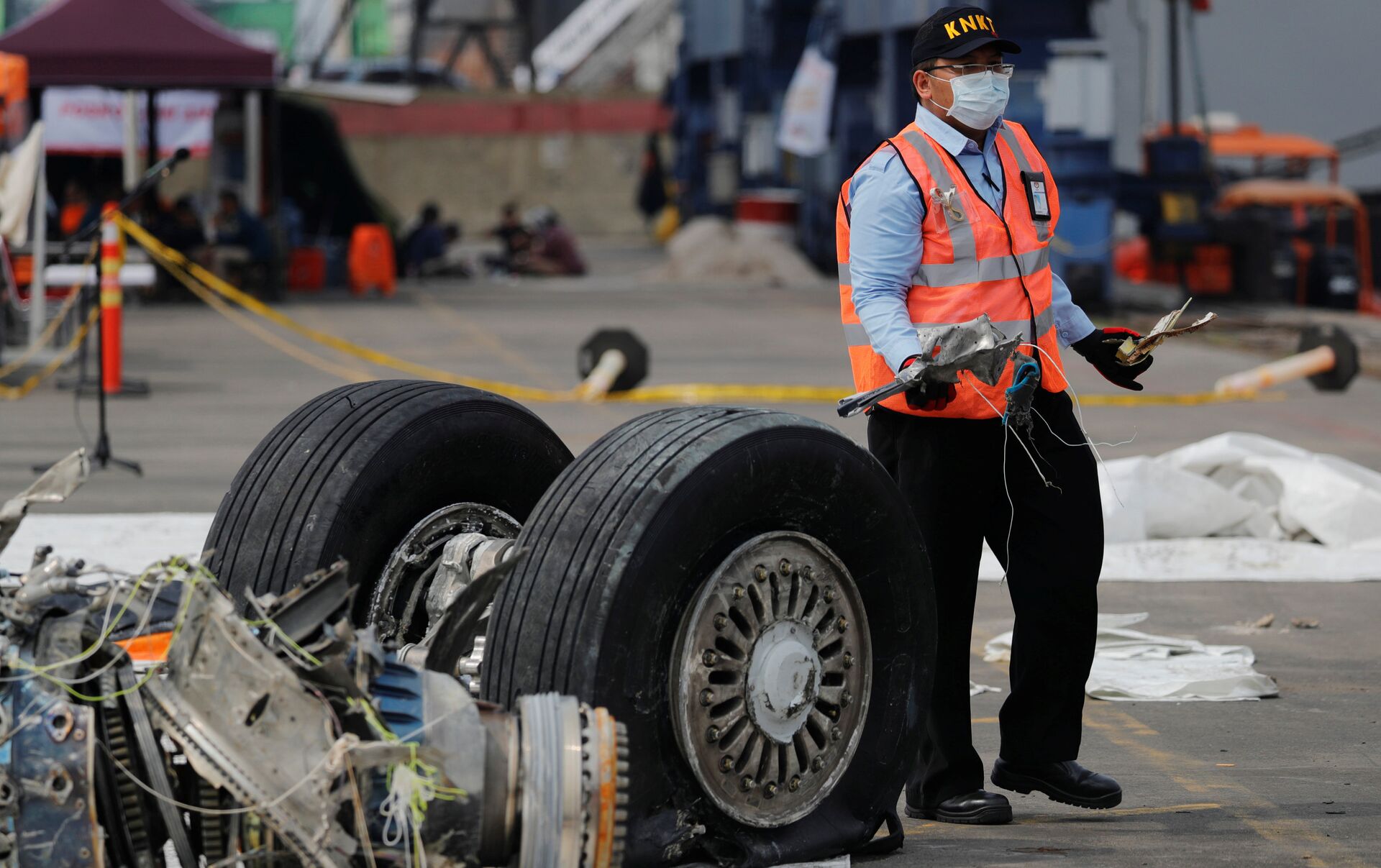 © REUTERS / BeawihartaUn funcionario de la Comisión Nacional de Seguridad del Transporte de Indonesia transporta escombros del vuelo JT610 de Lion Air, Indonesia