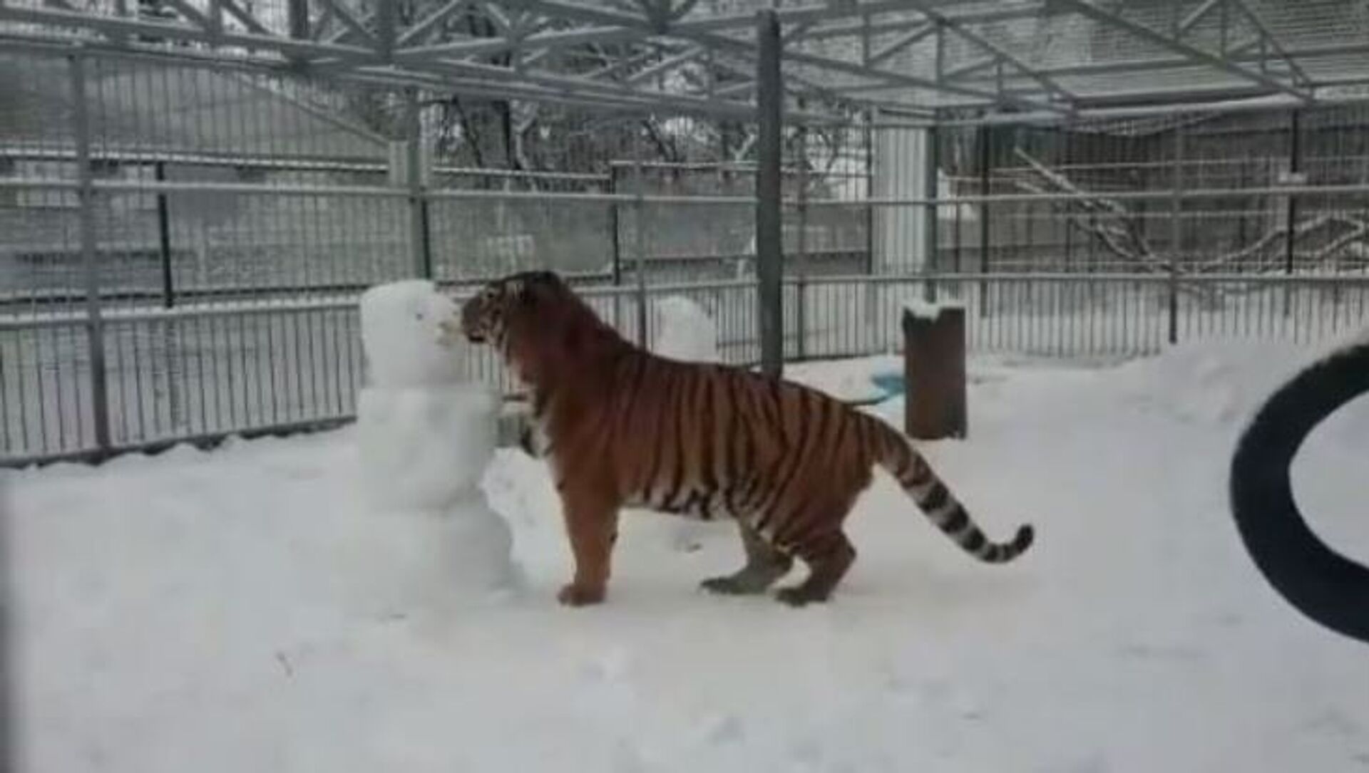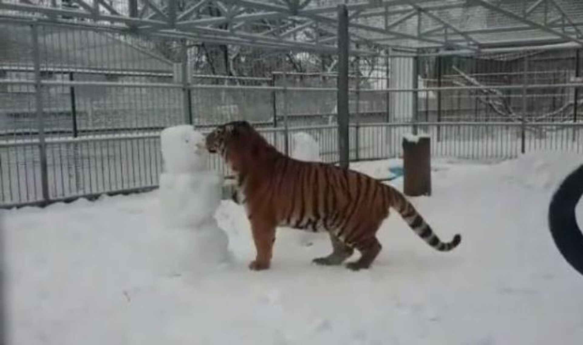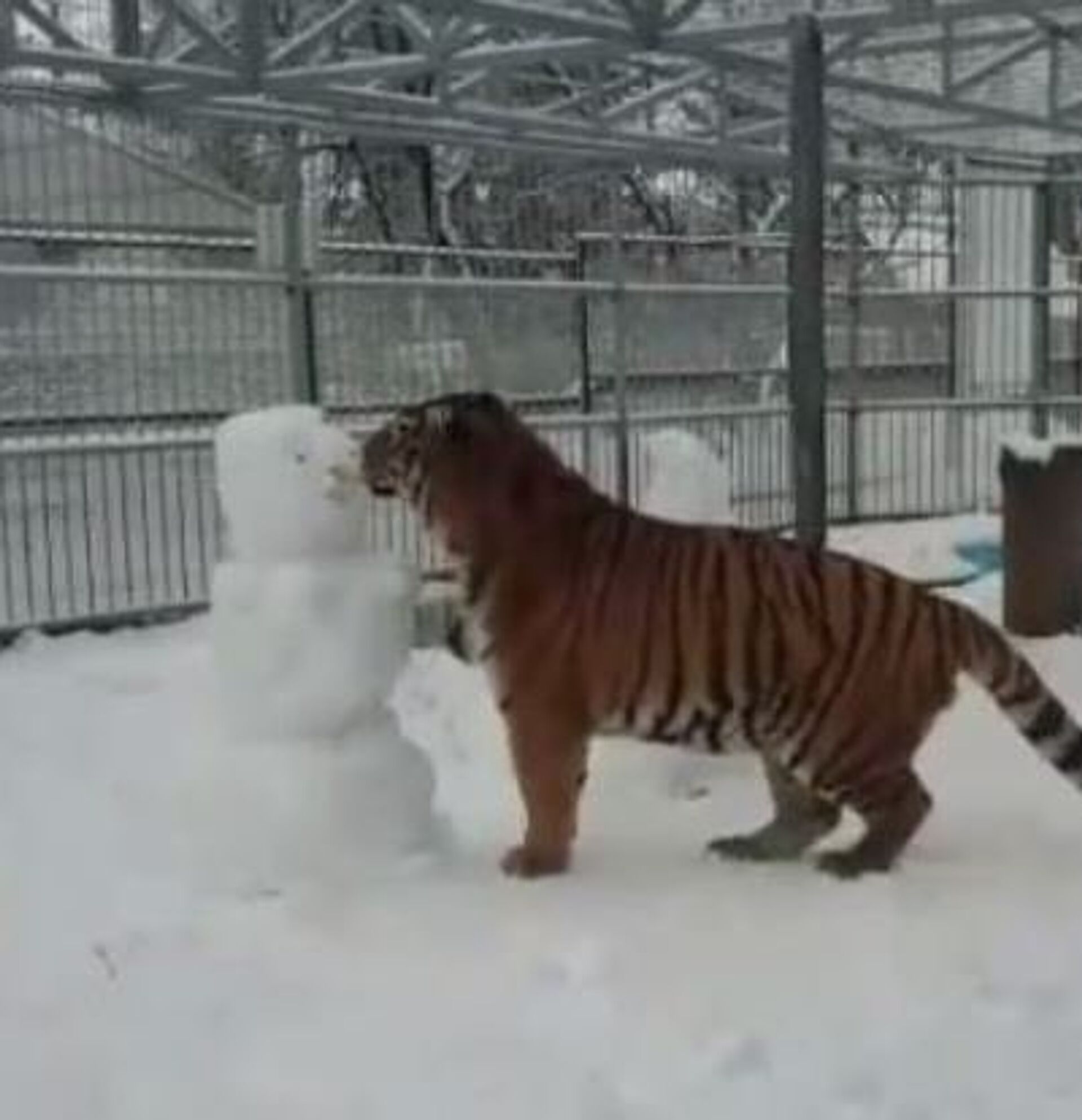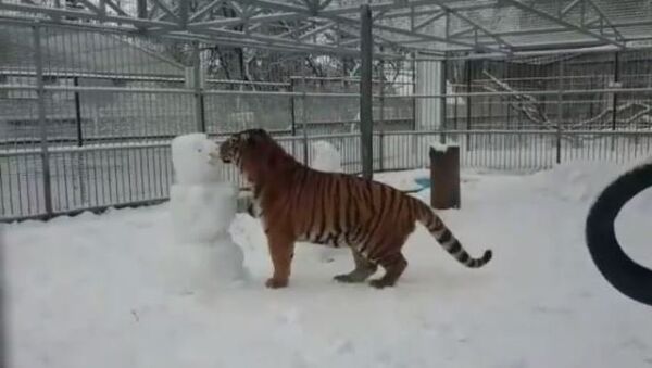 Al principio, el tigre se a acerca al primer muñeco y lo toca con sus patas delanteras. Pocos instantes más tarde, el hombre de nieve se ve completamente destruido.