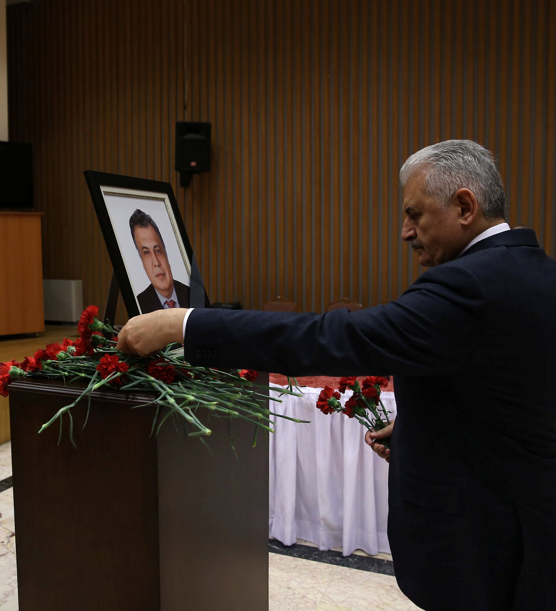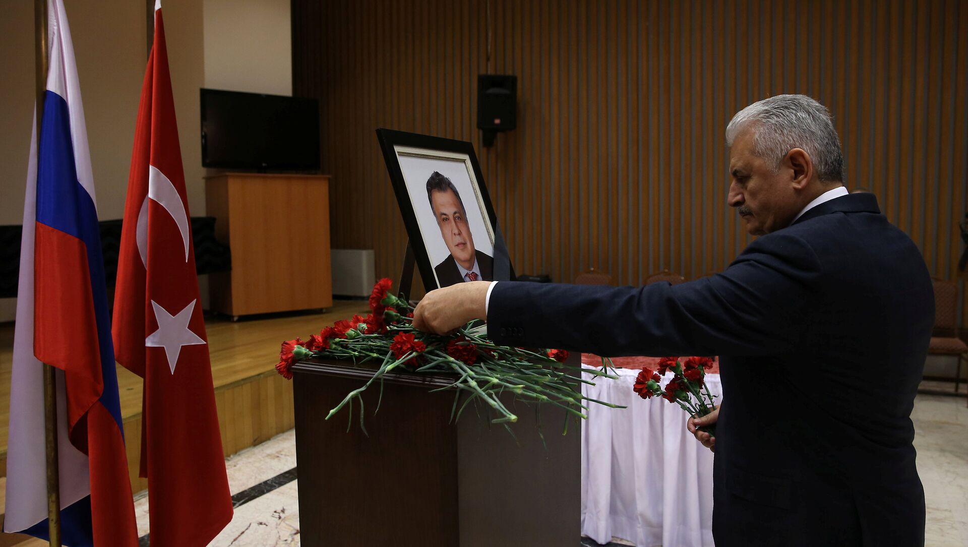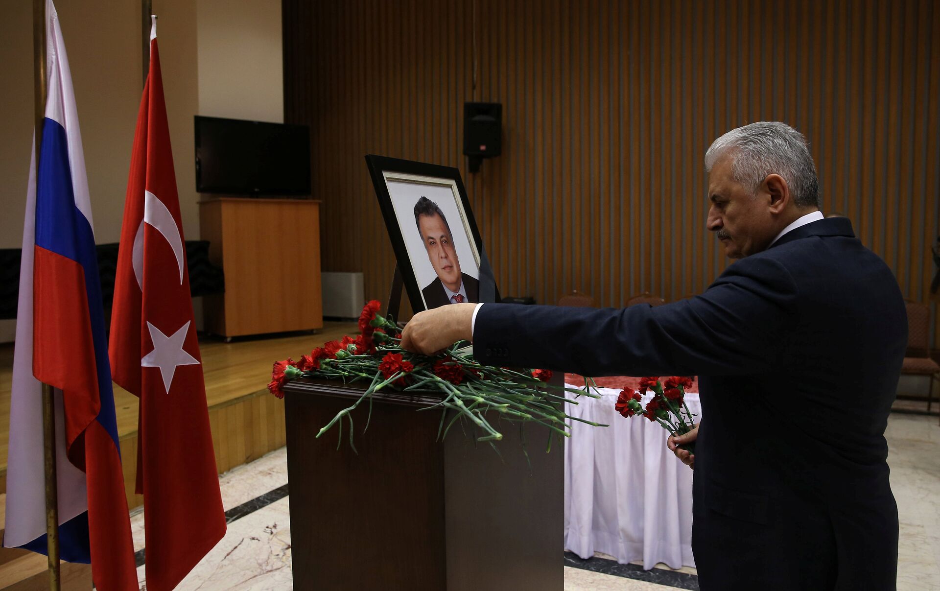 El primer ministro turco Binali Yildirim coloca flores en la memoria del difunto embajador ruso en Turquía, Andrei Karlov, durante su visita a la Embajada de Rusia en Ankara, Turquía - Sputnik Mundo