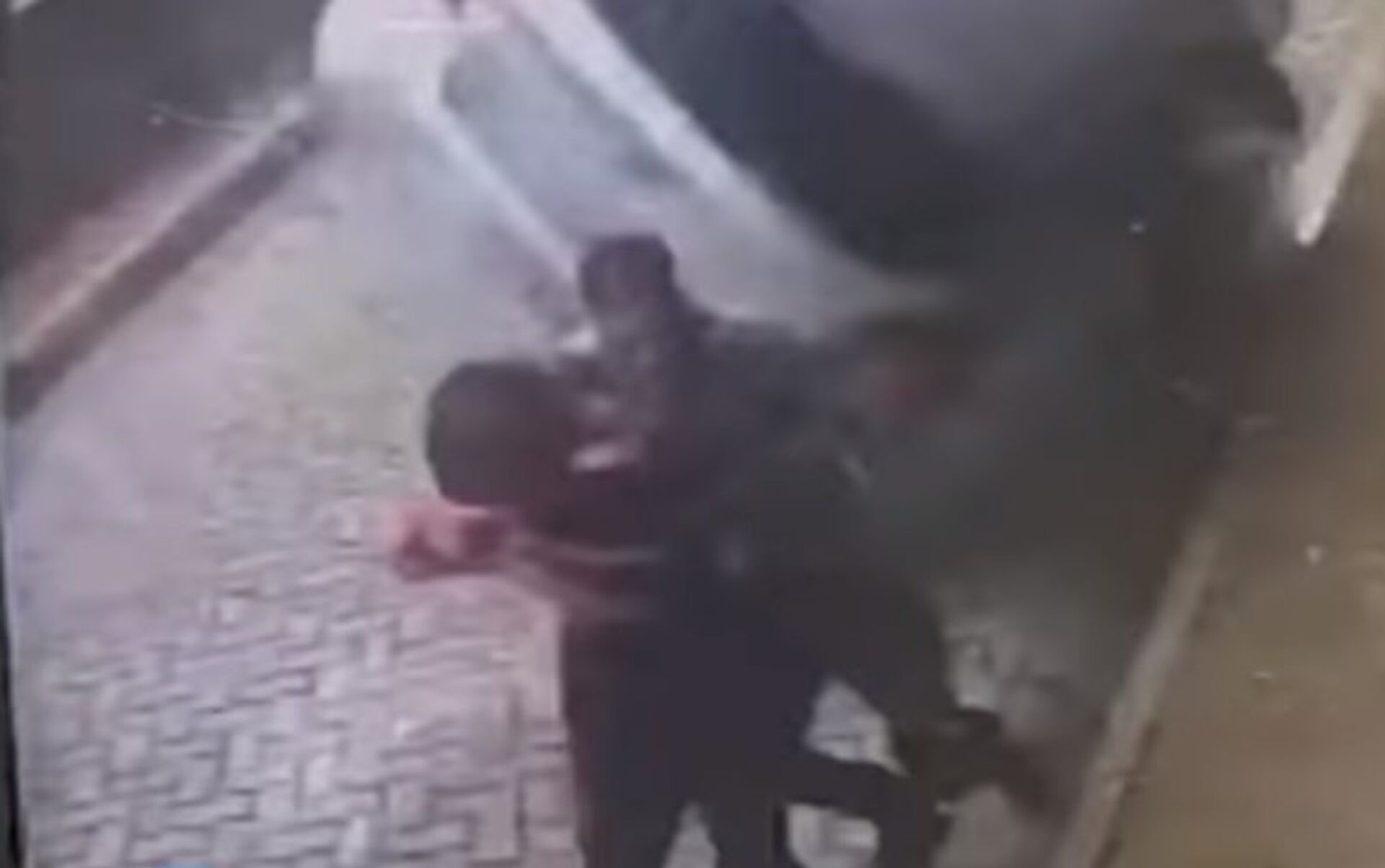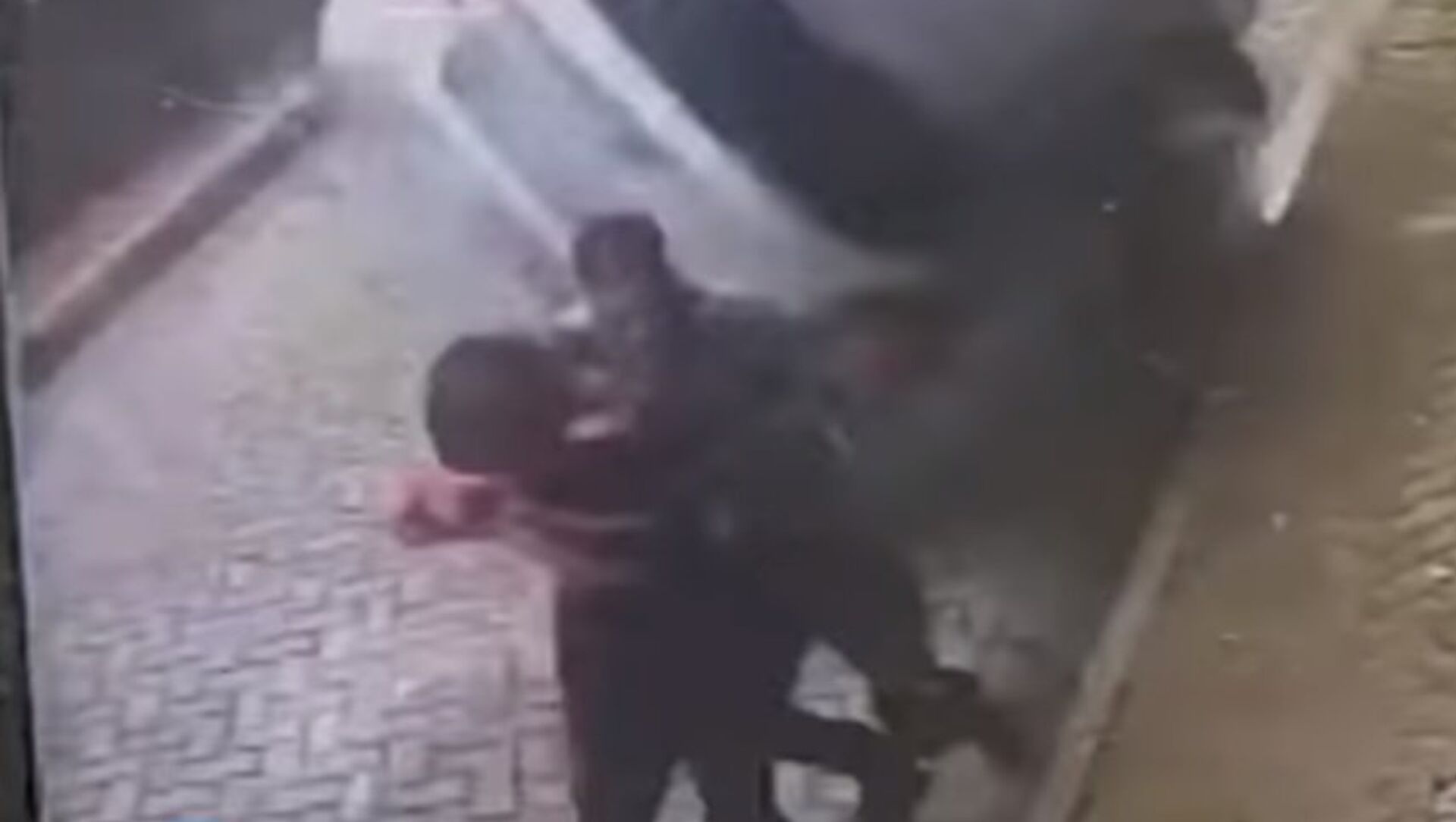 En las imágenes aparecen un hombre y una mujer que caminan juntos por un área peatonal. De repente, un auto entra literalmente volando en la acera a una gran velocidad.