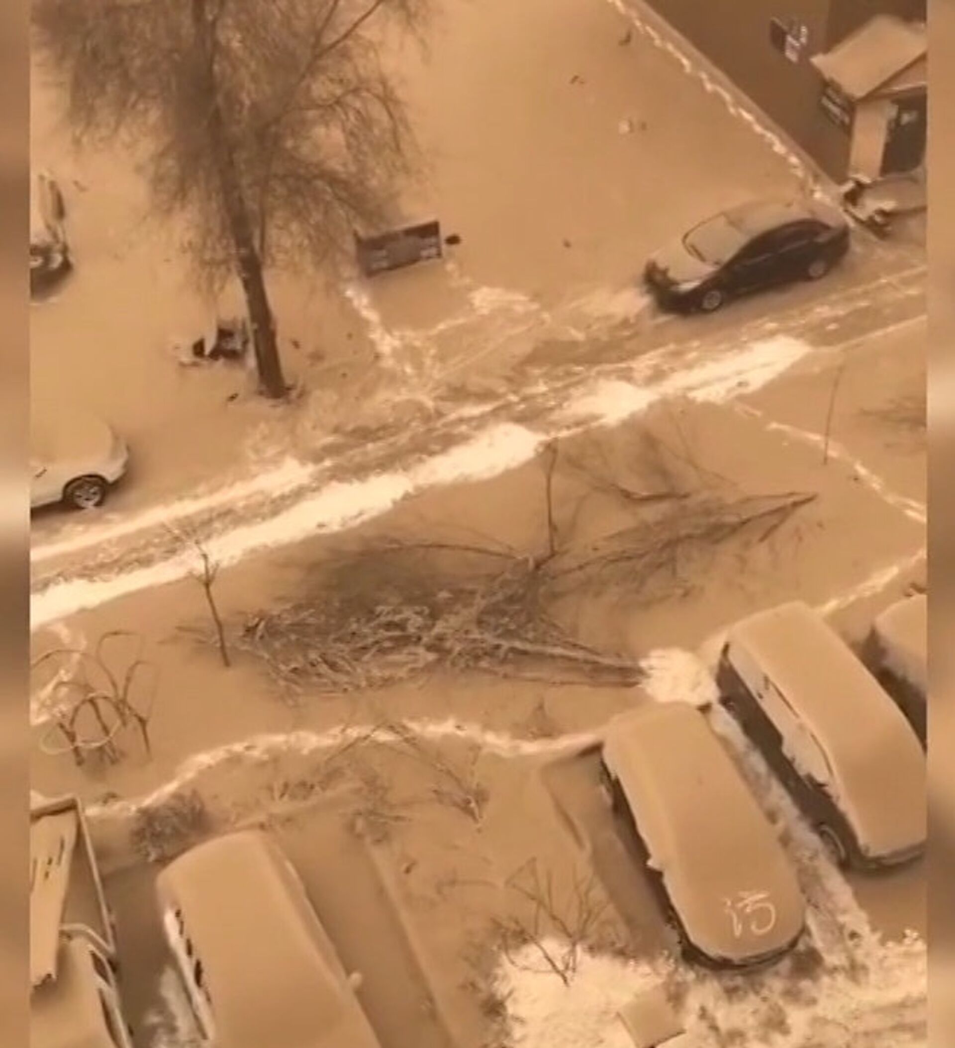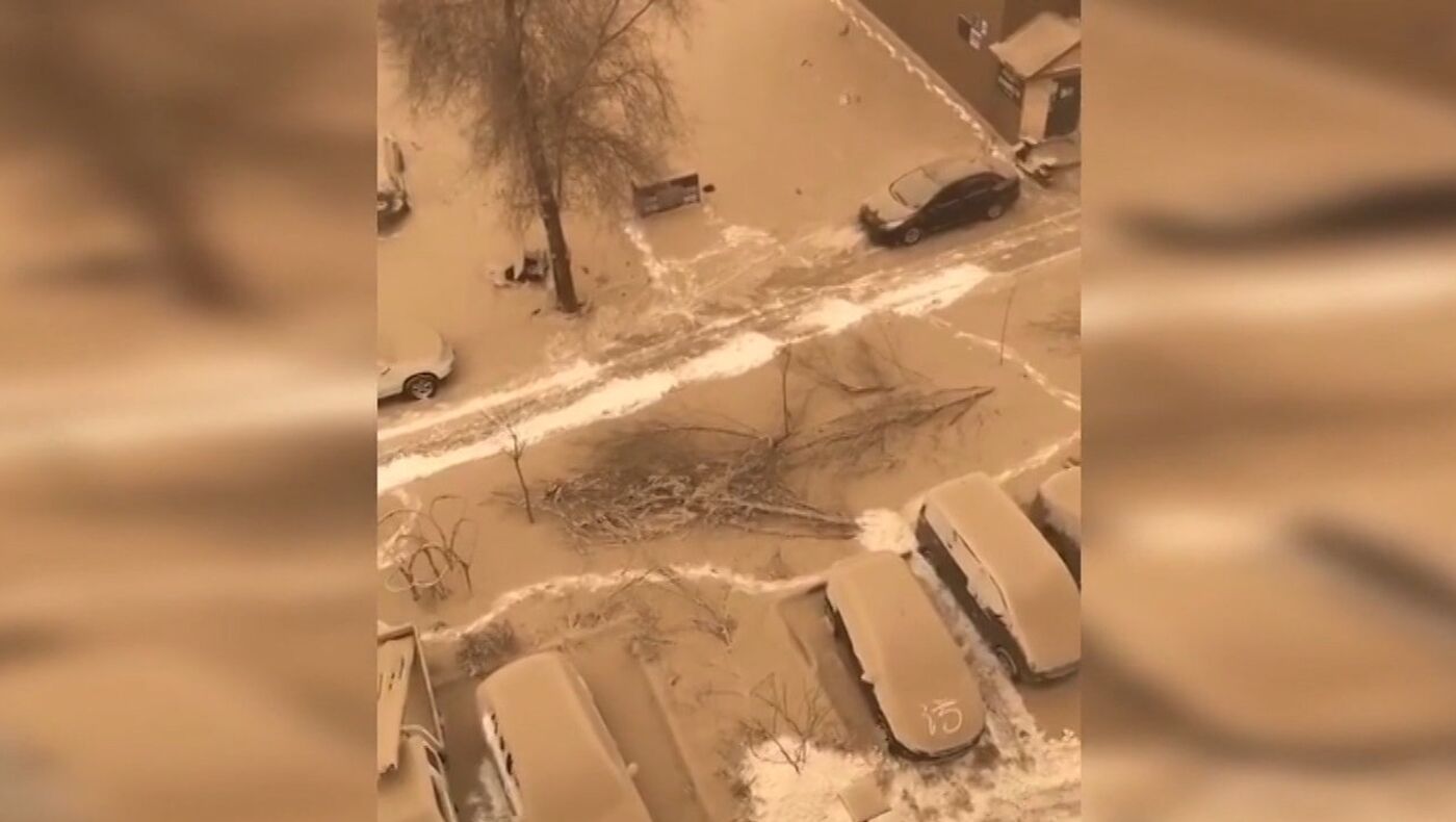 Las imágenes, filmadas el 1 de diciembre en la región, muestran la curiosa nevada teñida de tonos terrosos cubriendo calles, vehículos y edificios.