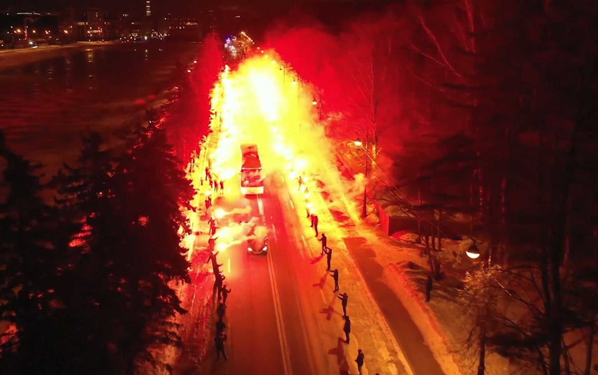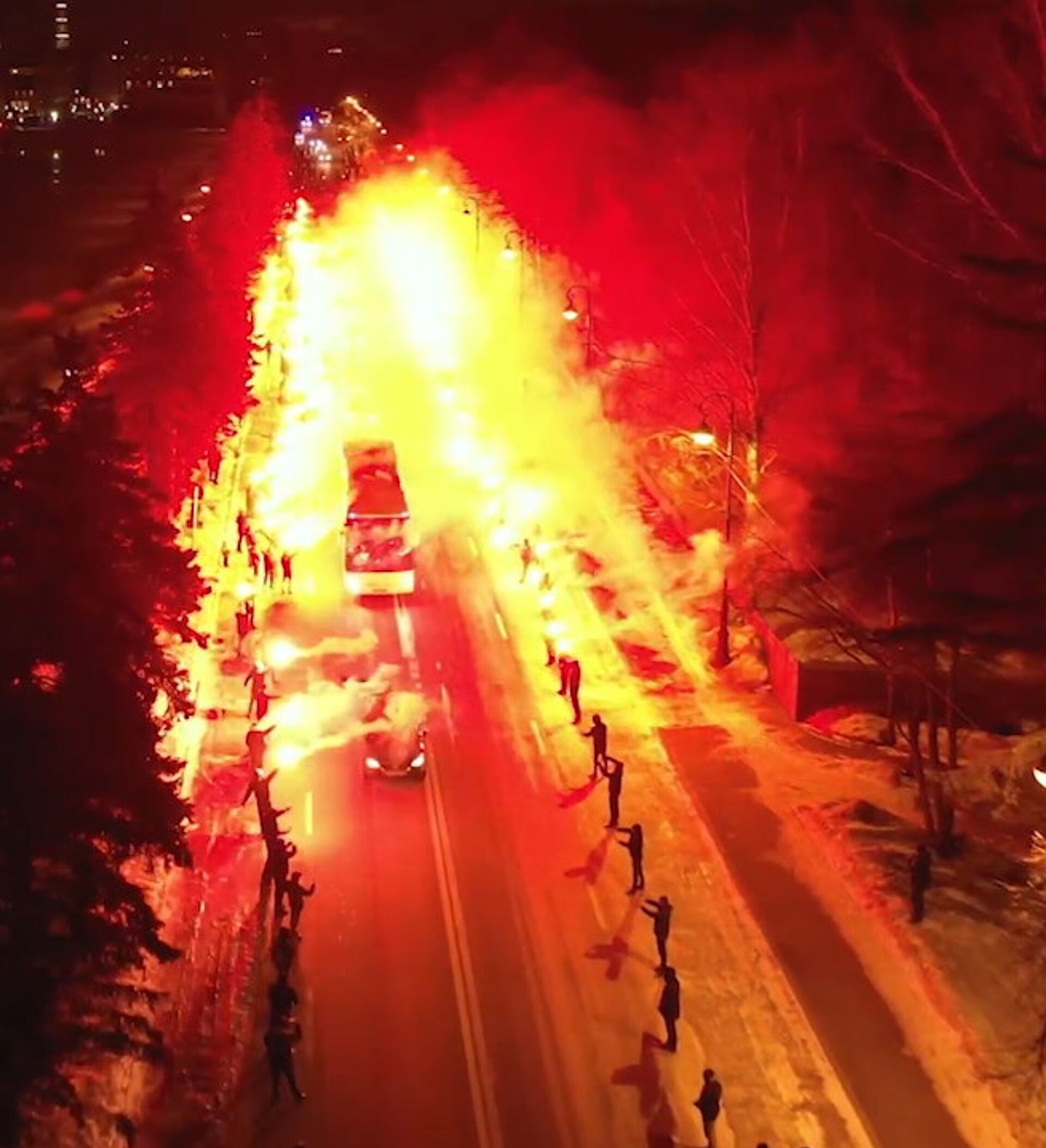 Los hinchas se pusieron en fila a lo largo de la calle por la que iba el autobús de los jugadores del Zenit y fueron incendiando bengalas una tras otra.