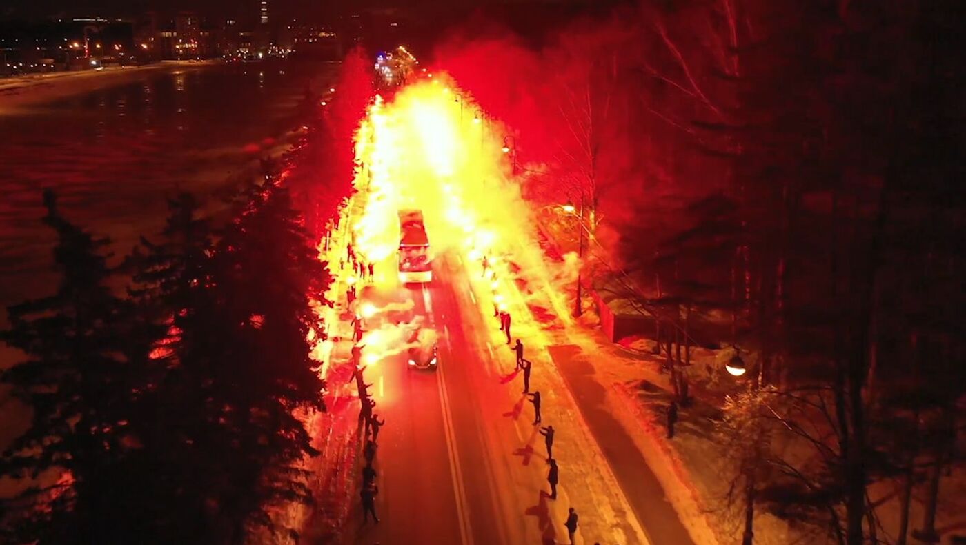 Los fans del club del fútbol Zenit de la ciudad rusa de San Petersburgo dieron una bienvenida literalmente ardiente a los futbolistas antes del partido de la Liga de Europa contra el Fenerbahce turco.