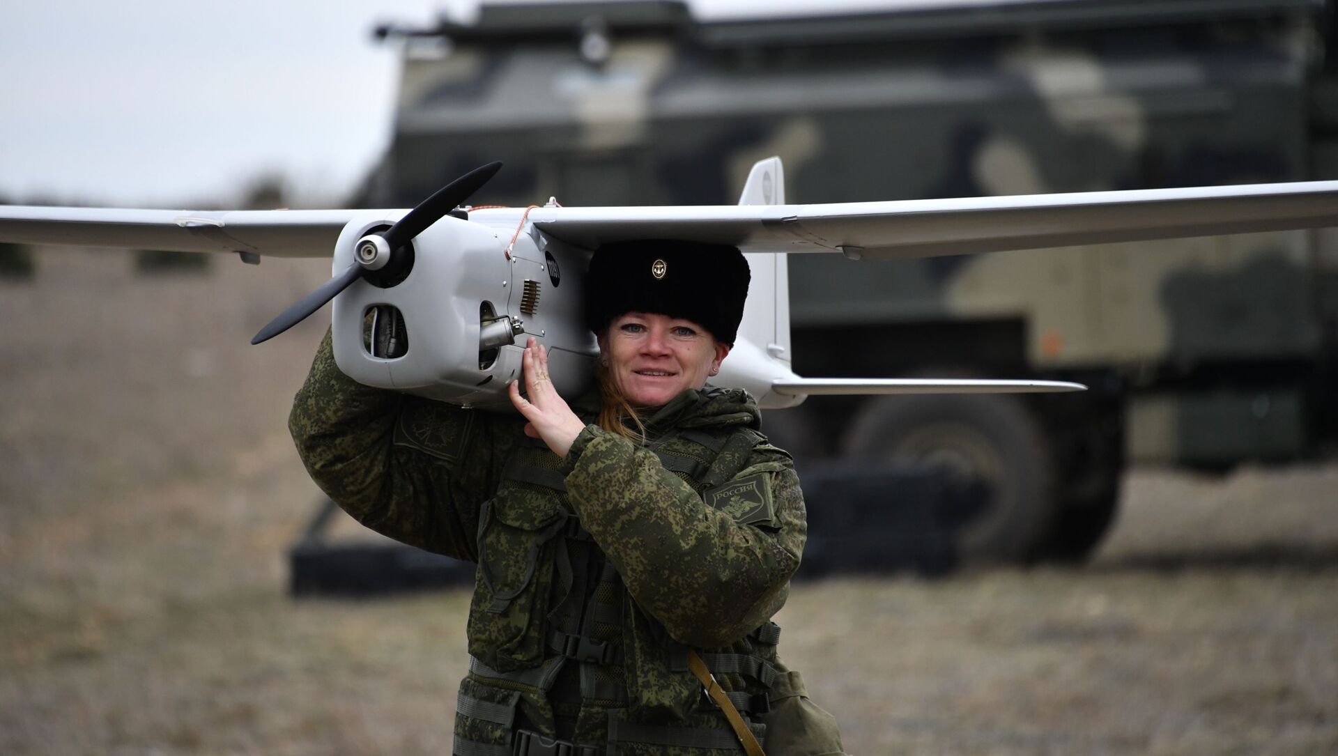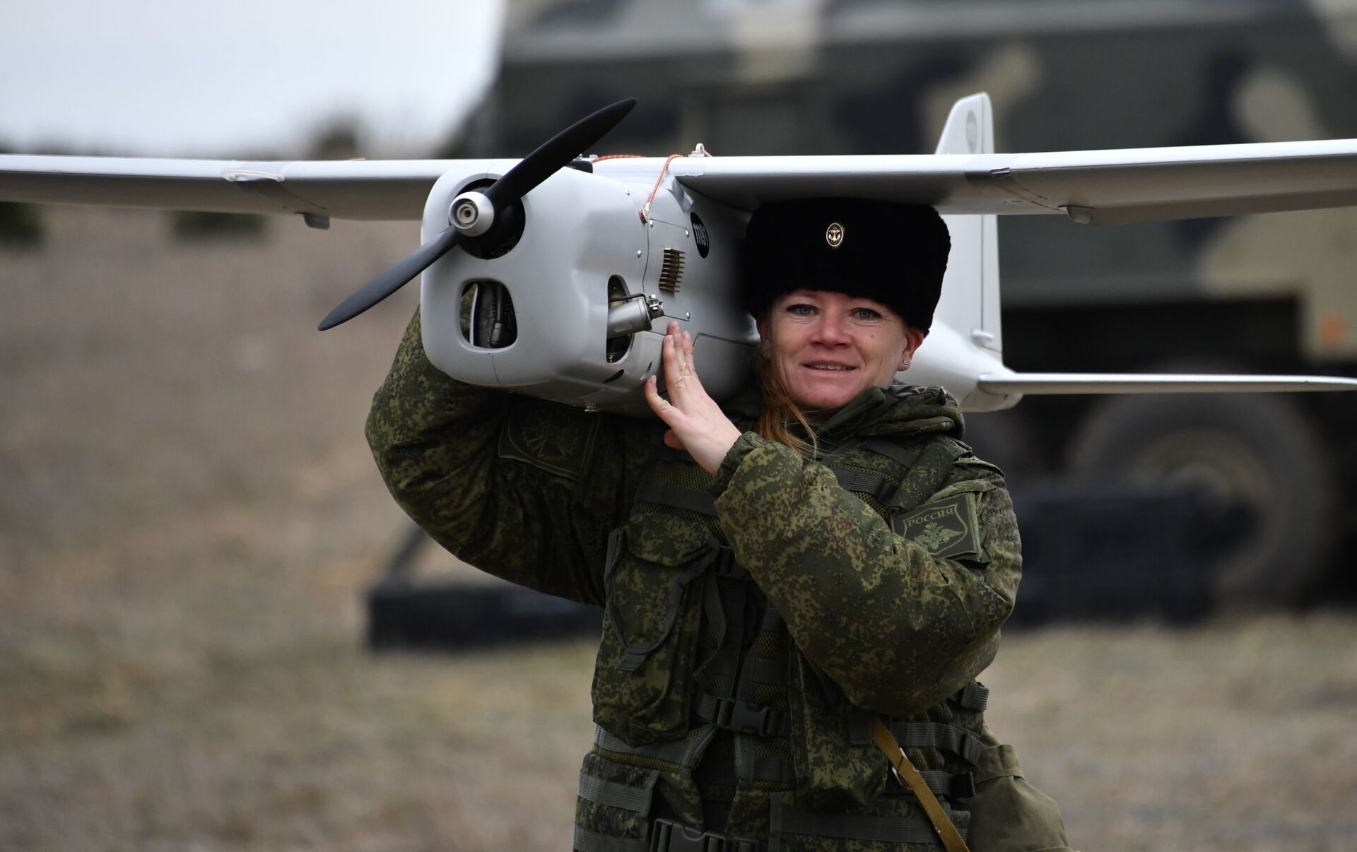 Una ingeniera técnica de la unidad femenina especializada en el pilotaje de drones con el aparato Orlan-10, después de su aterrizaje.