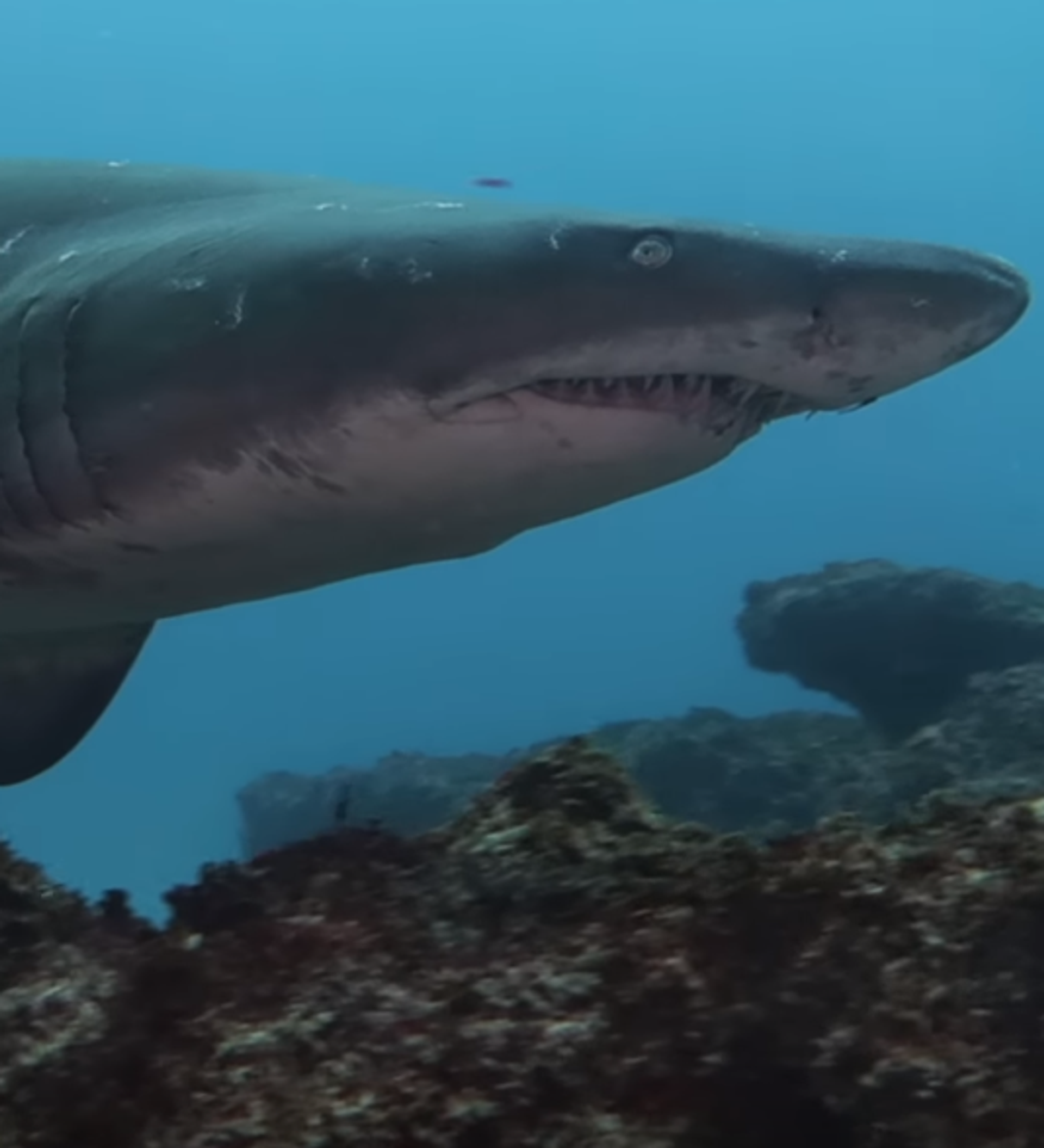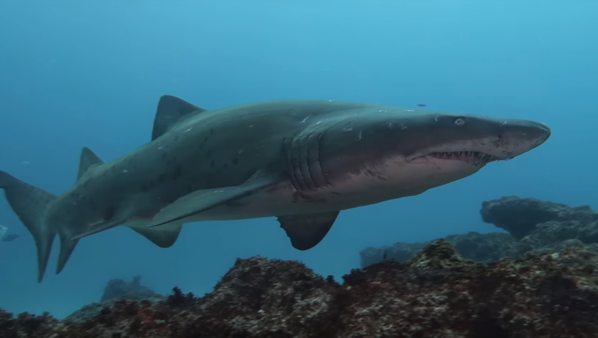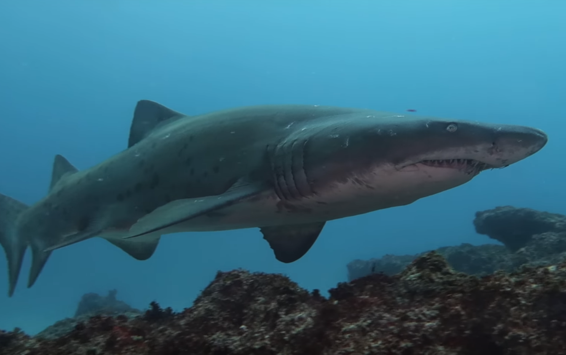 El vídeo, publicado en YouTube, muestra al tiburón tigre de arena, también conocido como tiburón damisela, nadando hacia el submarinista y luego a su lado, ignorando por completo al hombre y al resto del equipo de submarinismo, que graba el espectáculo.