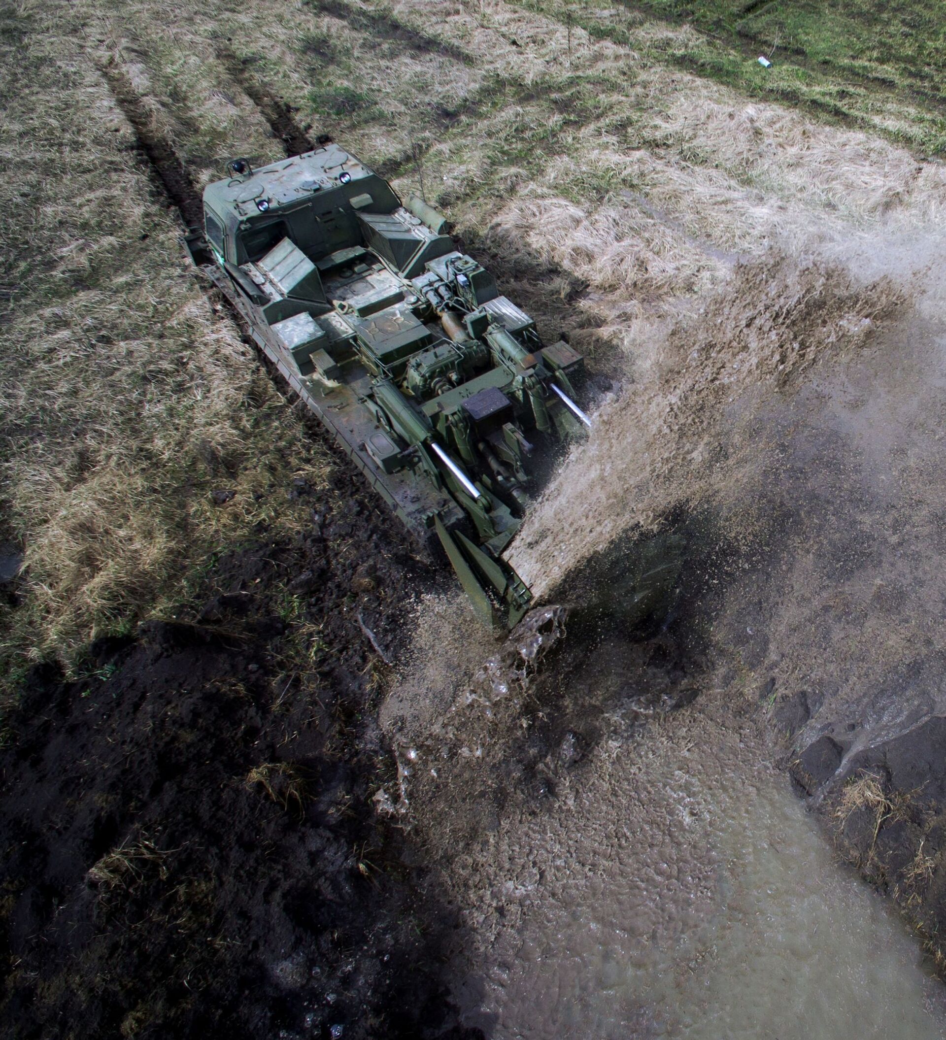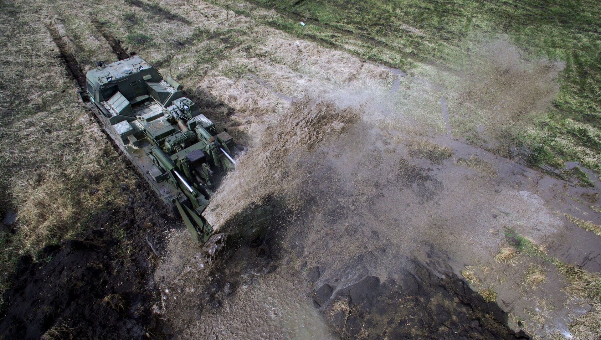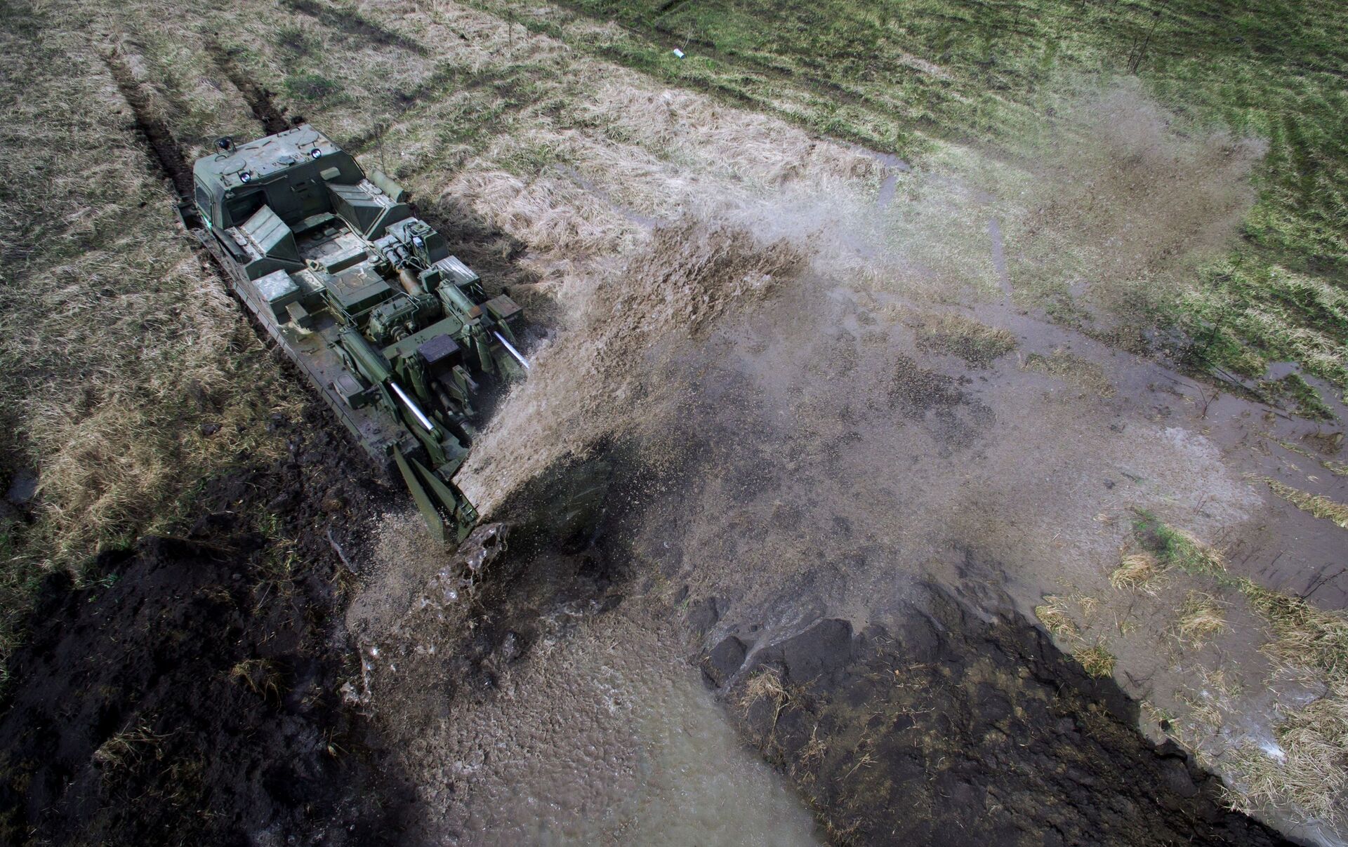 © Sputnik / Vitaly Timkiv / Acceder al contenido multimediaLos drones grabaron las maniobras desde el aire. En la foto: el vehículo MDK-3 utilizado para excavar zanjas participa en los ejercicios táctico-especiales celebrados en la provincia de Krasnodar.