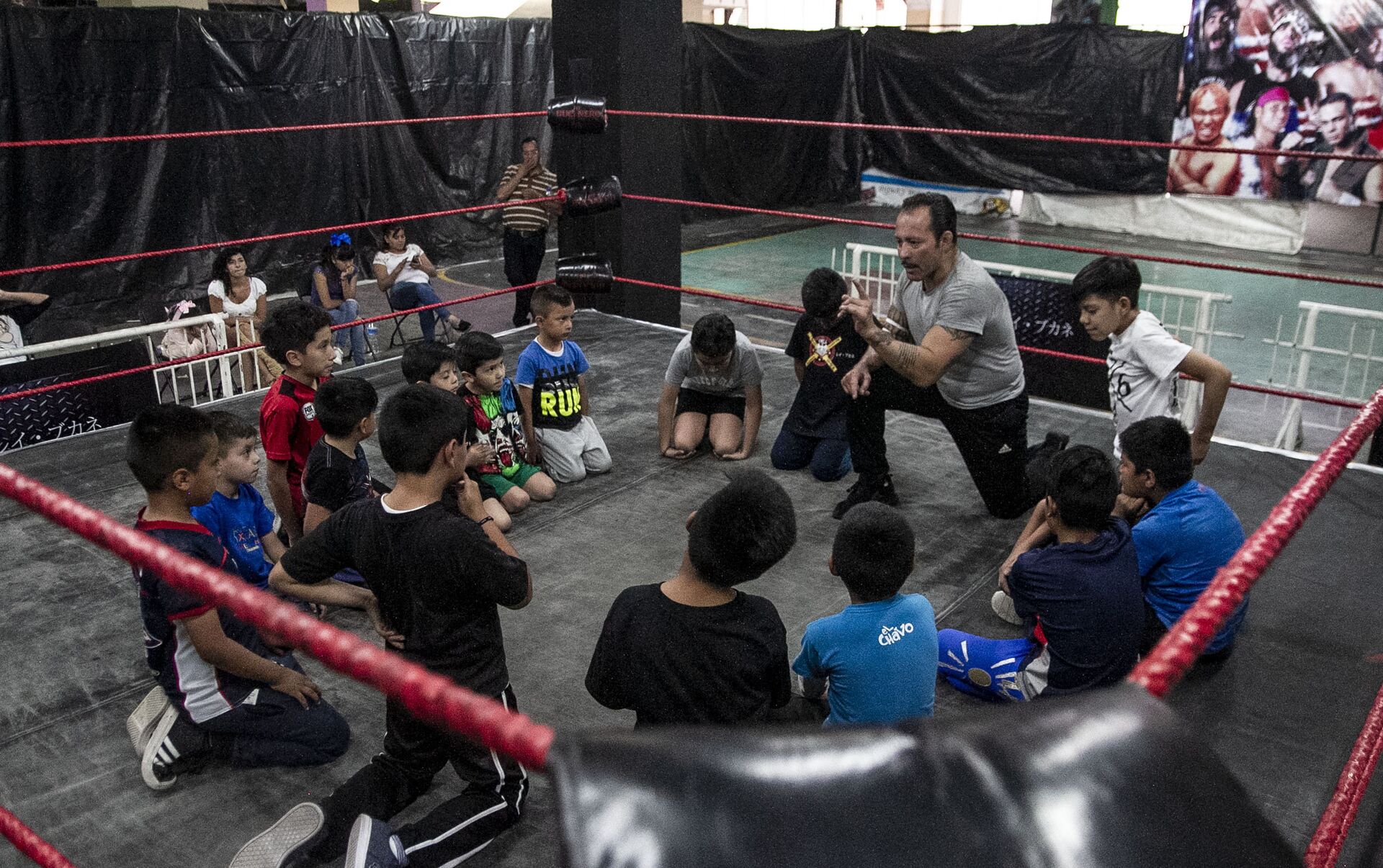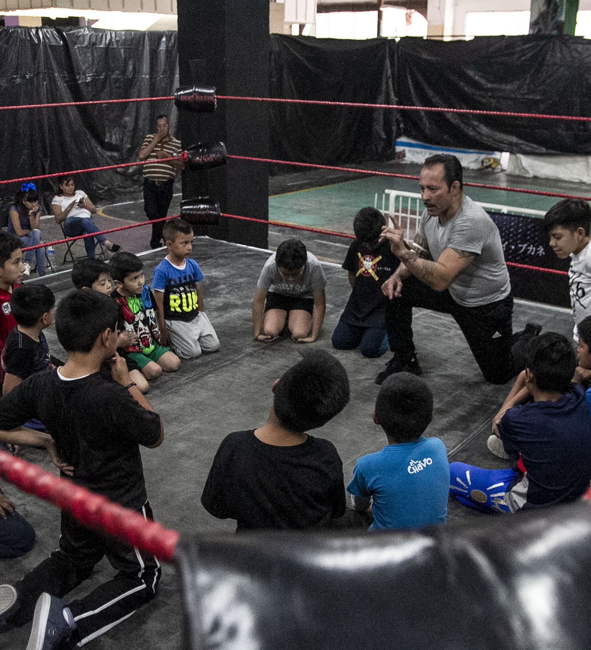 Dos niños suben al ring viéndose de frente y al oír el silbido, comienzan la batalla. Dos más pequeños intentan poner boca arriba a su compañero de clase, frente al público que aplaude ante cada caída. "¡Entra, engancha, gira!", les grita el Tigre.