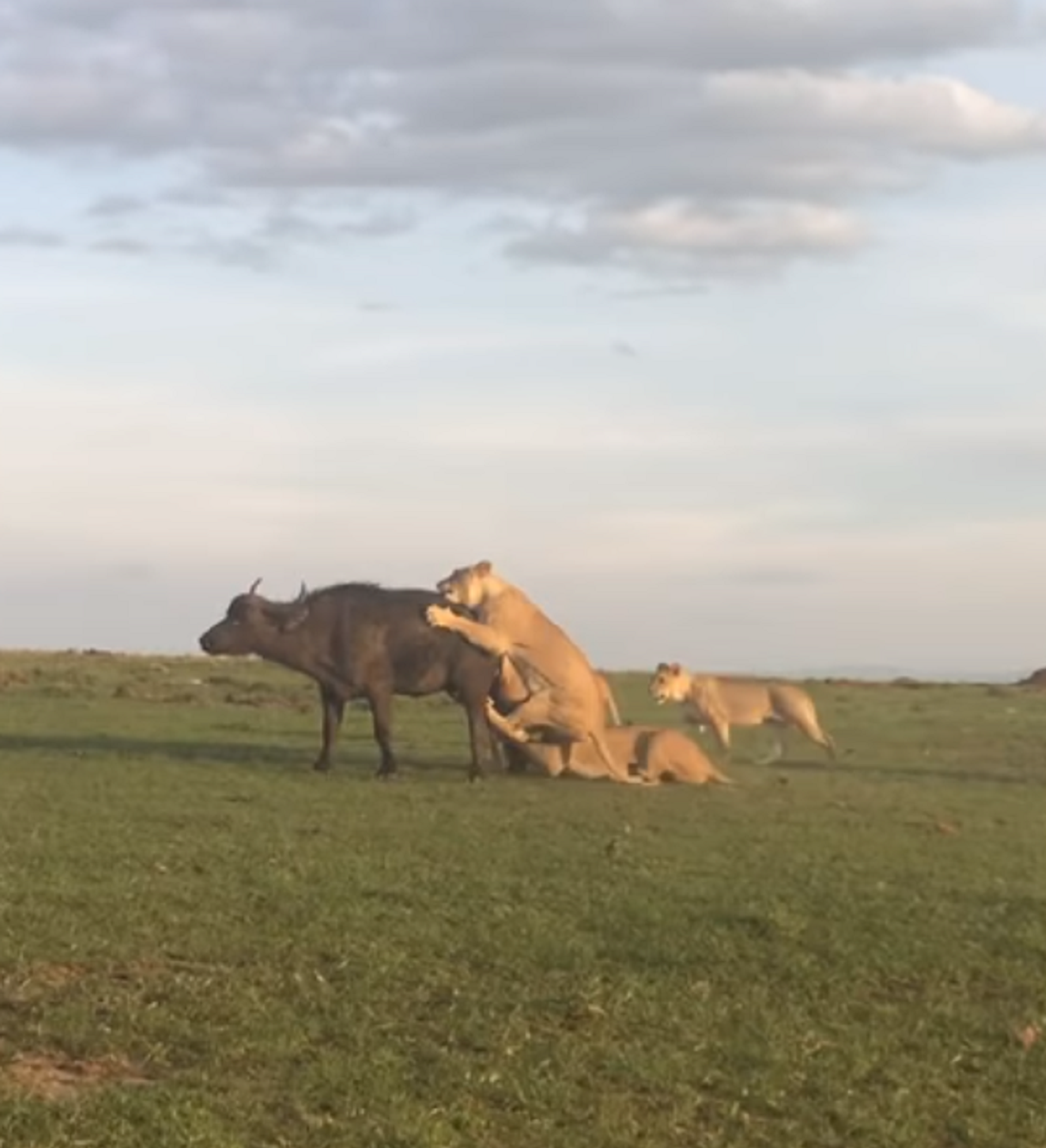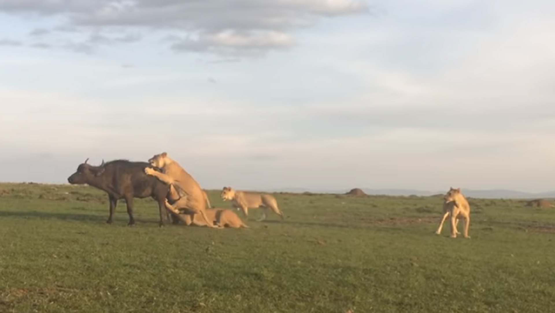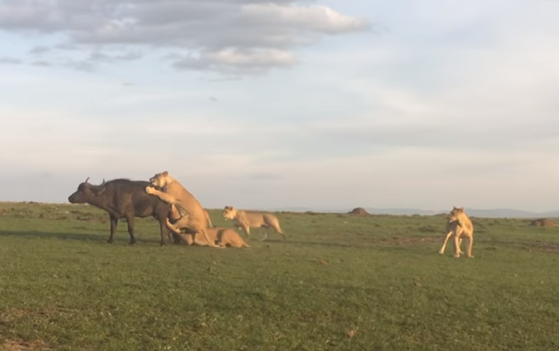 En la grabación publicada en YouTube se puede ver como una manada de leones jóvenes atrapa un búfalo, lo abate al suelo y lo vuelca, empezando a darle los mordiscos.