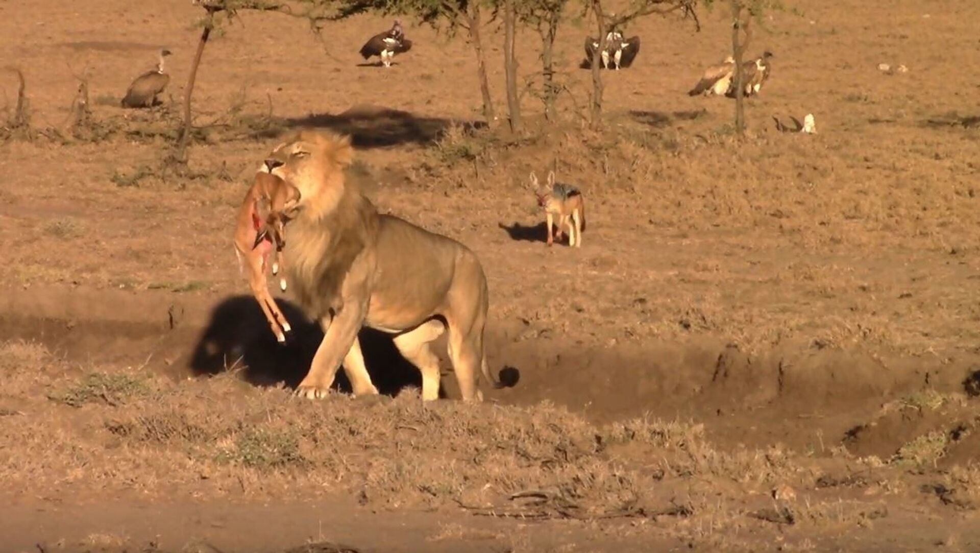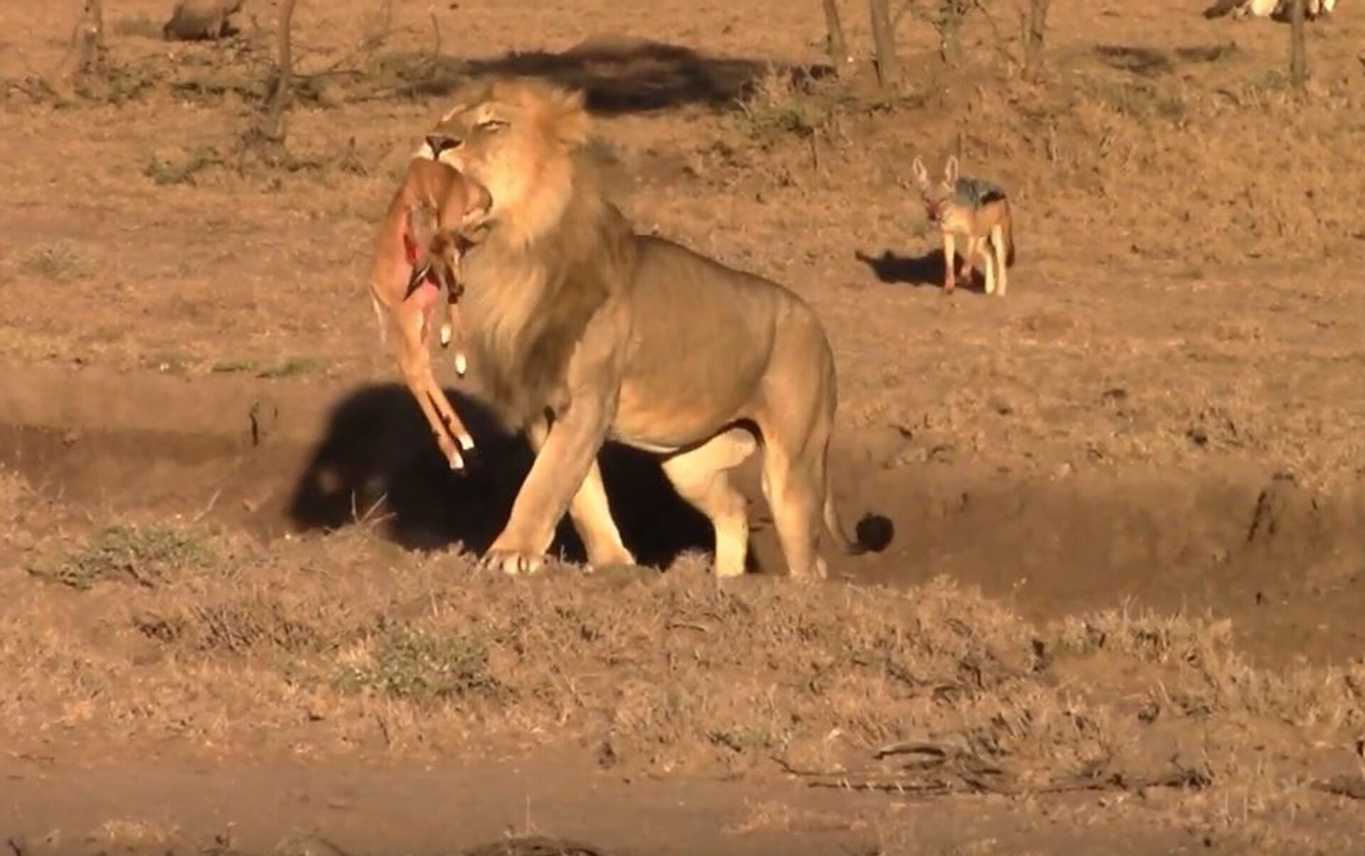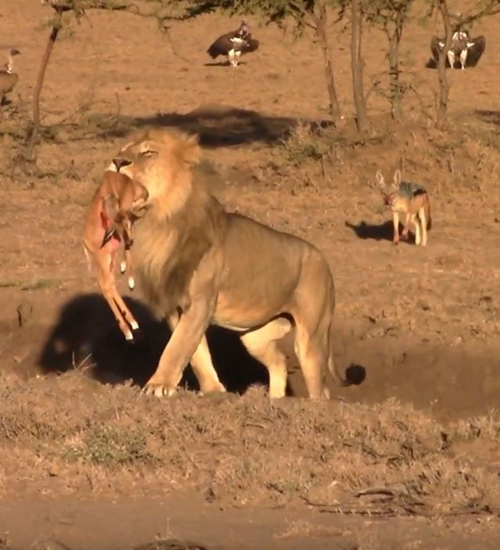 Instantes más tarde vuelve con el cuerpo de una cría de impala que les quitó a los chacales que la habían cazado. De hecho, los chacales ensangrentados lo siguen a medida que el gran felino se va sin prestarles atención alguna.