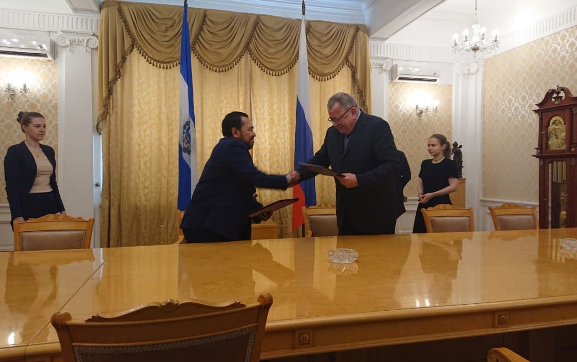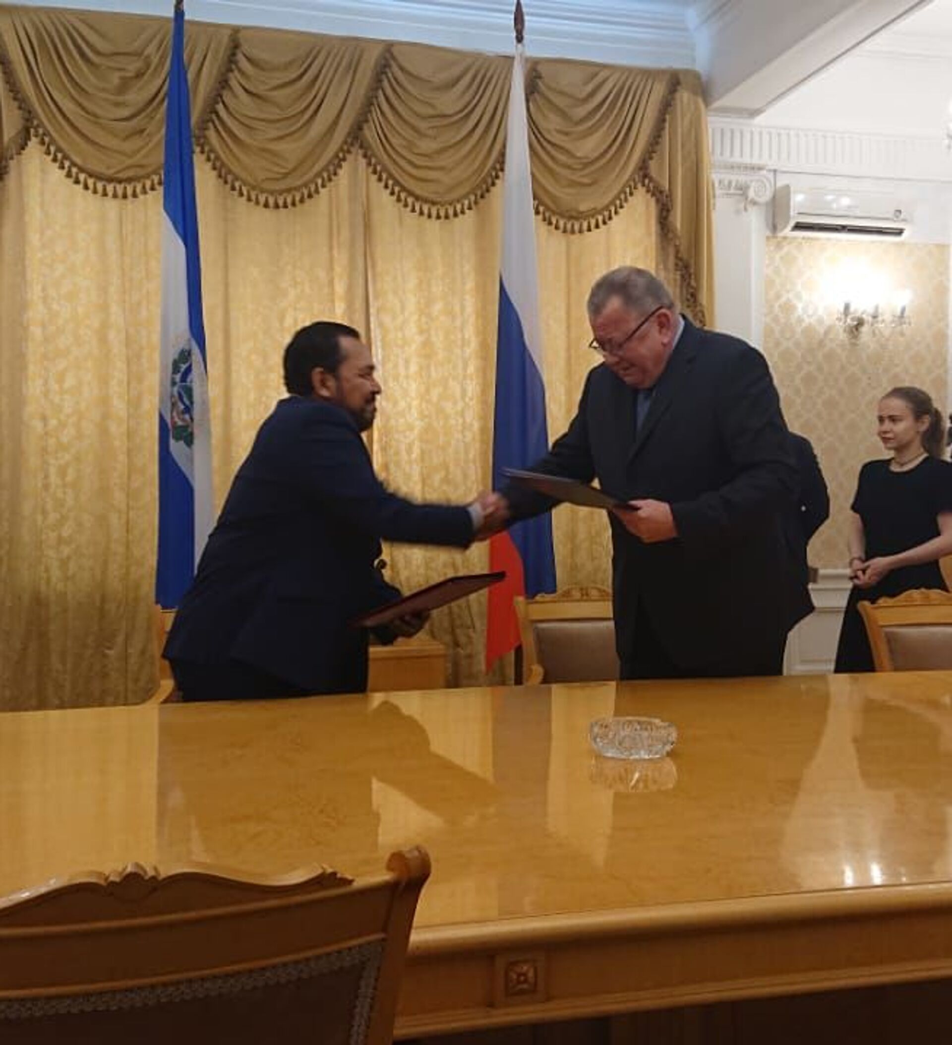 © Foto : Cortesía: Embajada de El Salvador en RusiaEl embajador de El Salvador en Rusia, Efrén Arnoldo Bernal Chévez, y el viceministro de Exteriores ruso Oleg Siromólotov