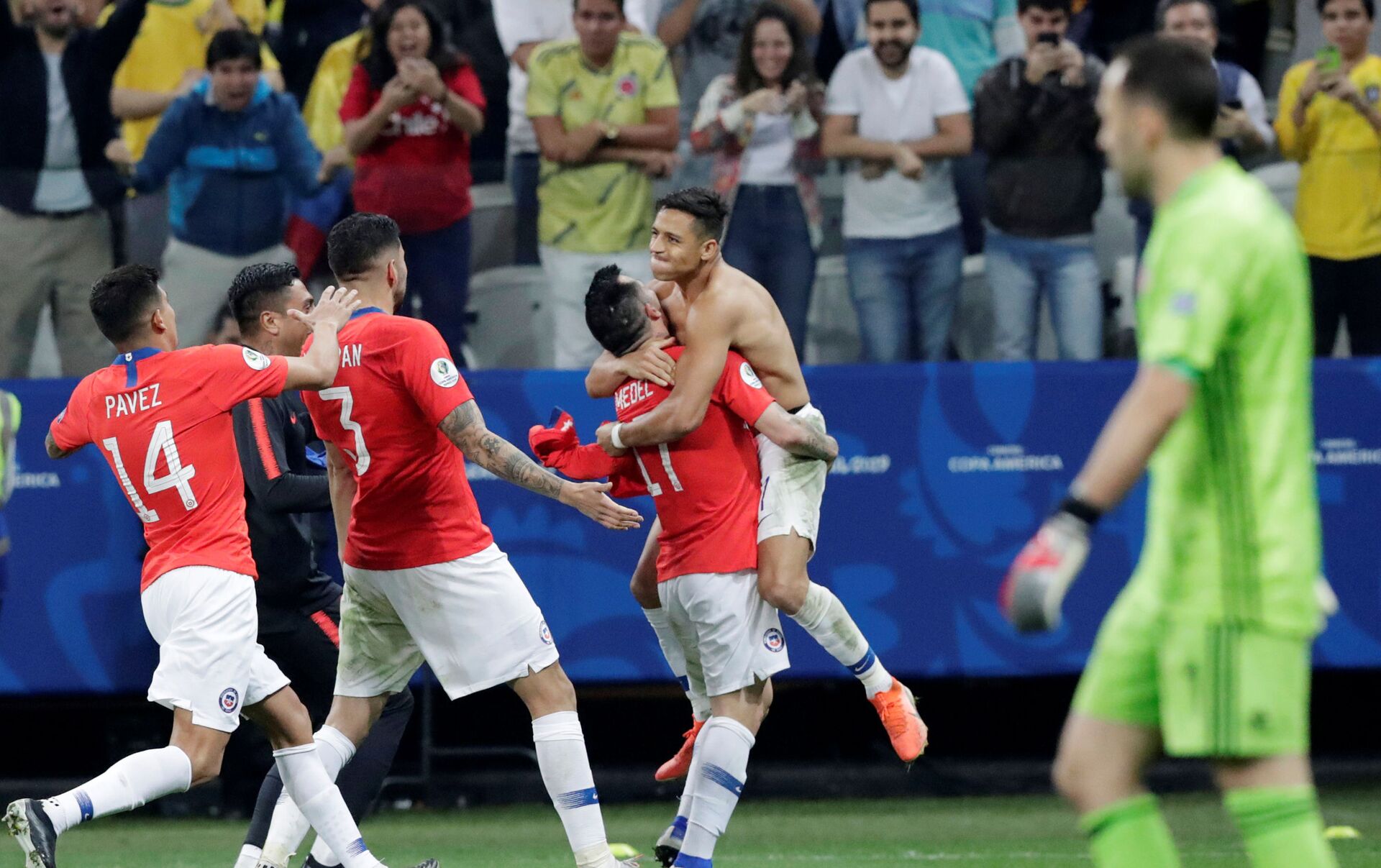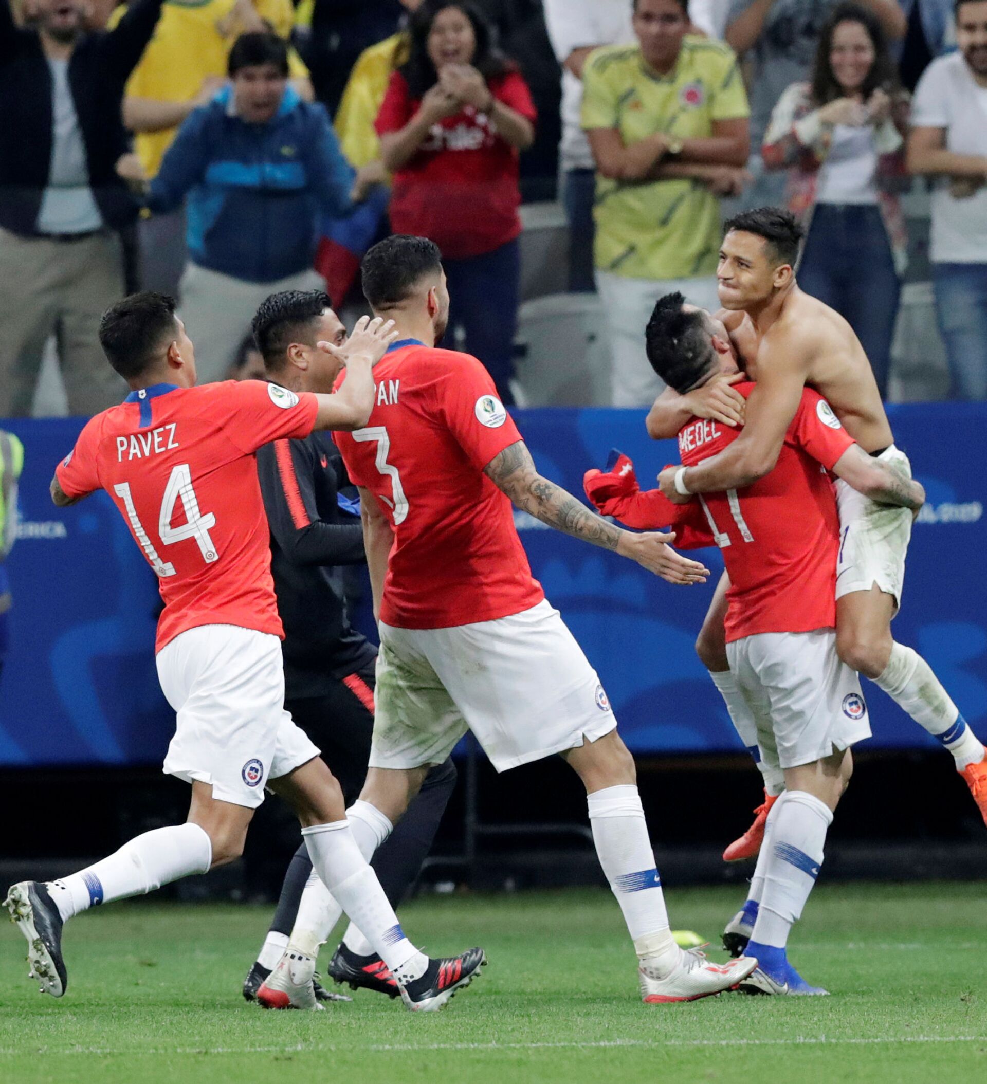 Los penales del bicampeón del continente fueron cobrados de manera magistral por Arturo Vidal, Eduardo Vargas, Erick Pulgar, Charles Aránguiz y Alexis Sánchez. Por los cafeteros, abrió la tanda de penales James Rodríguez, seguido de Edwin Cardona, Juan Cuadrado y Yerry Mina. Lamentablemente, William Tesillo no supo concretar el tanto y la mandó fuera del campo, lo que le dio la victoria a Chile.