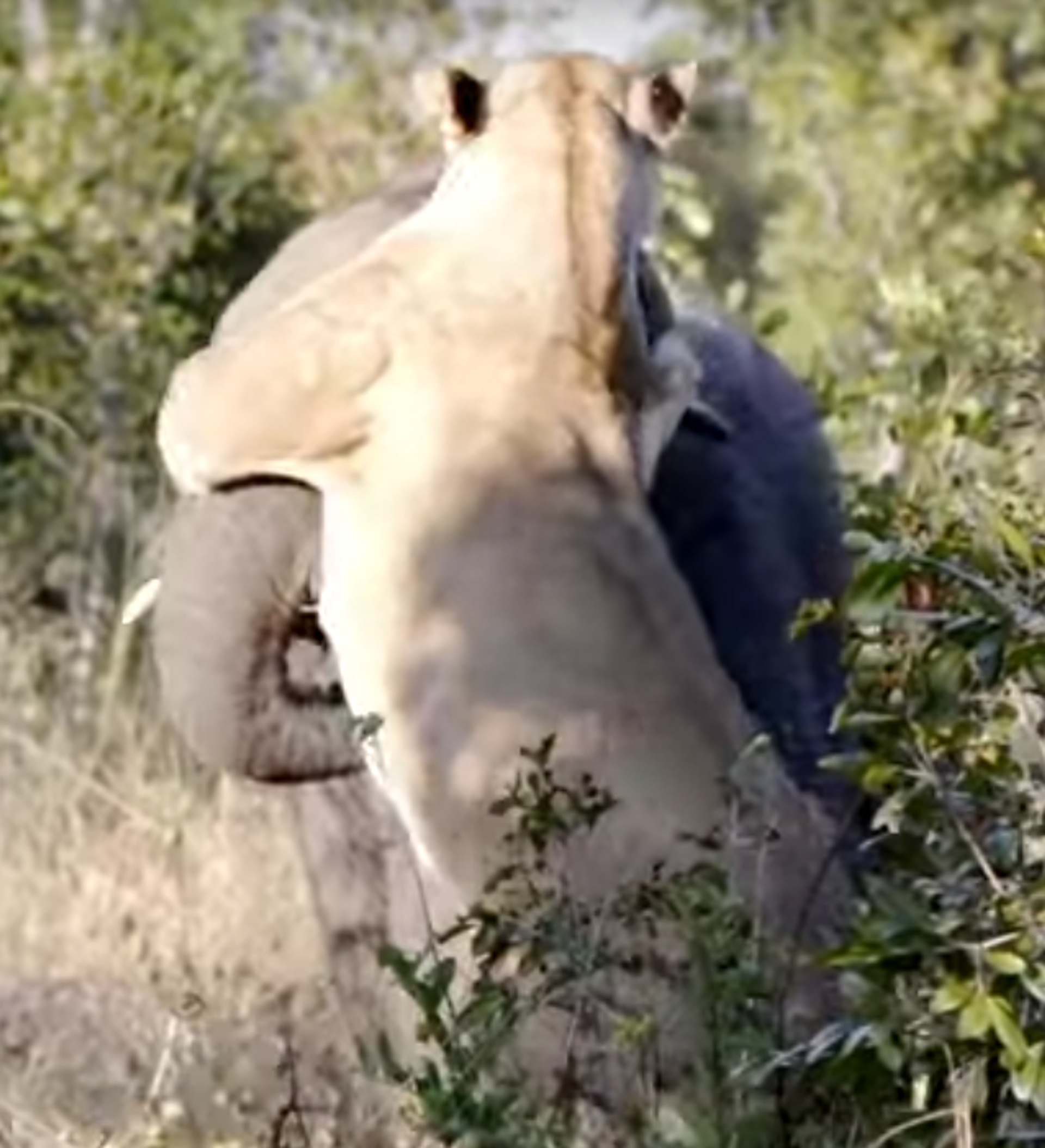 La madre clavó con fuerza sus garras y dientes en la trompa del elefante. Aunque pese a su insistencia y valentía, incluso herido el elefante pudo sacarse a la carnívora de encima y dejar sin almuerzo a la familia de la leona.