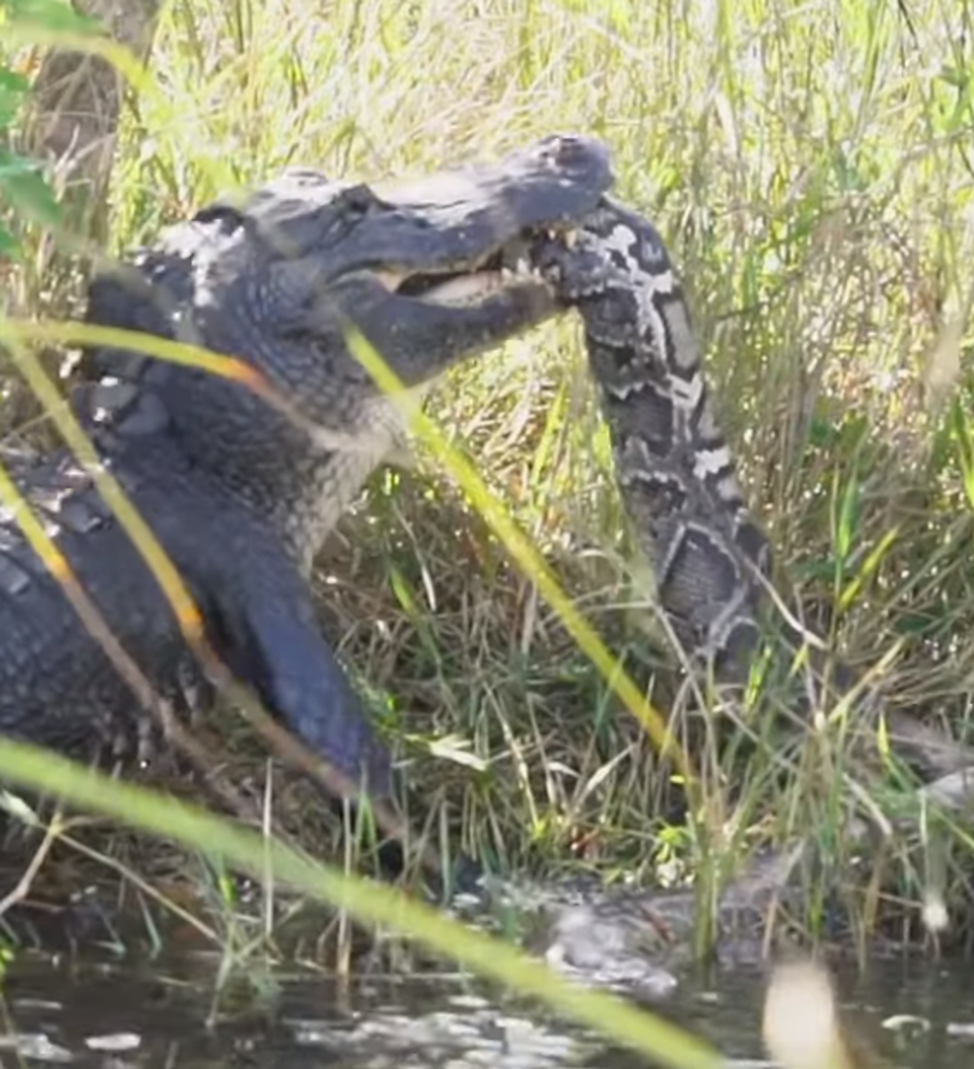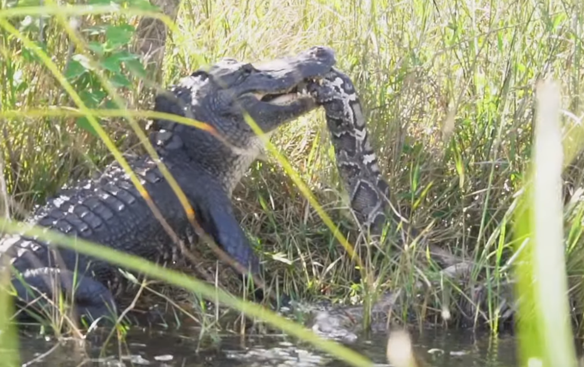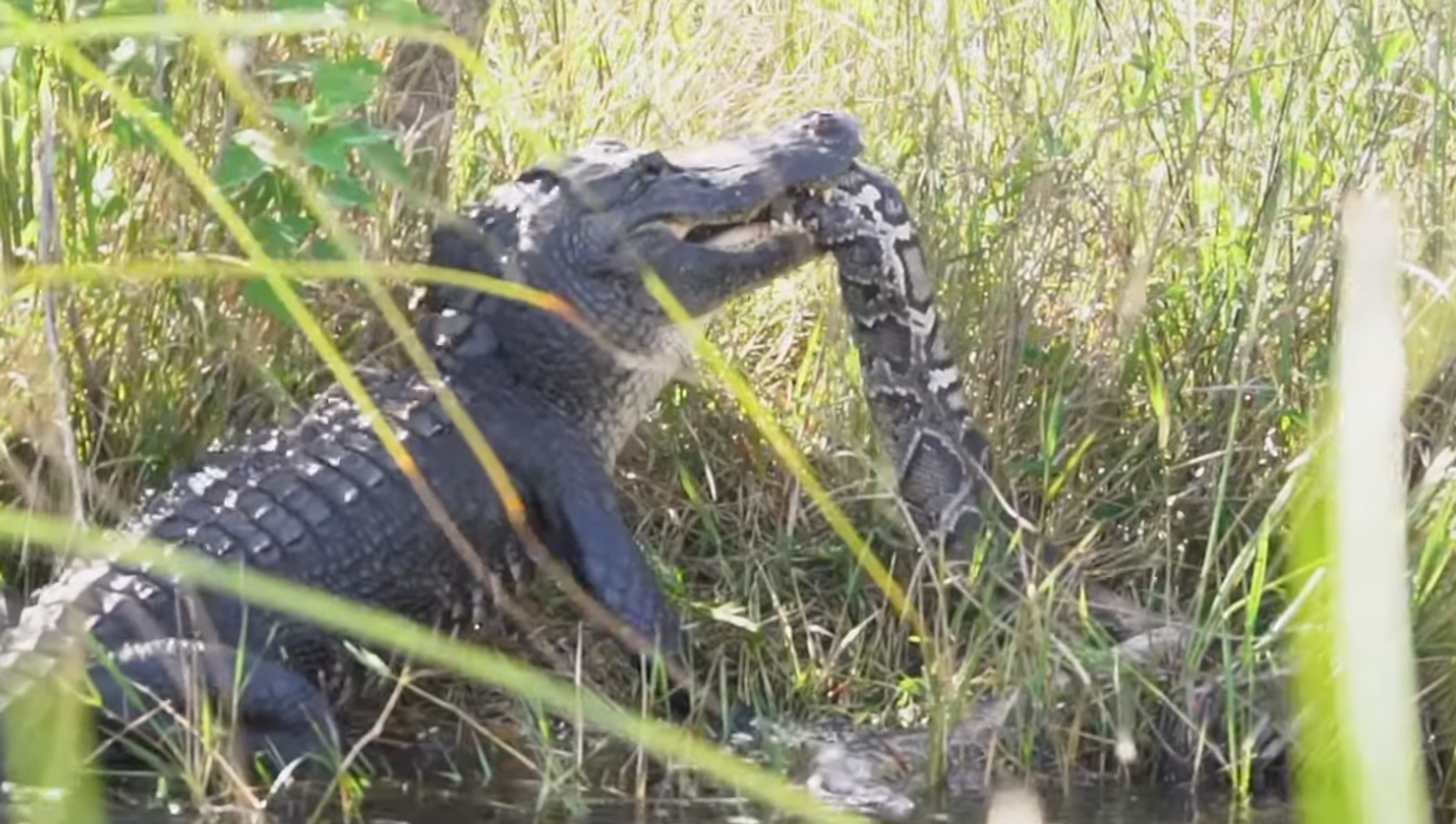 En el vídeo se puede observar una pitón birmana de cuatro metros de largo atrapada por un aligátor americano de tres metros.