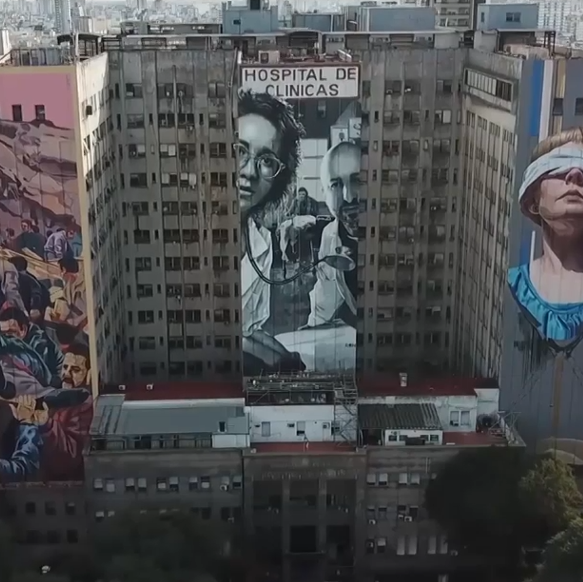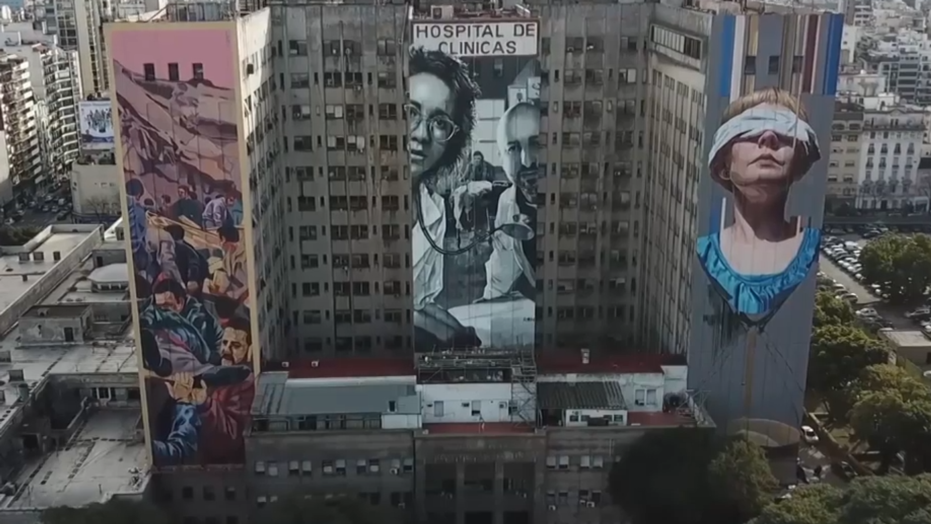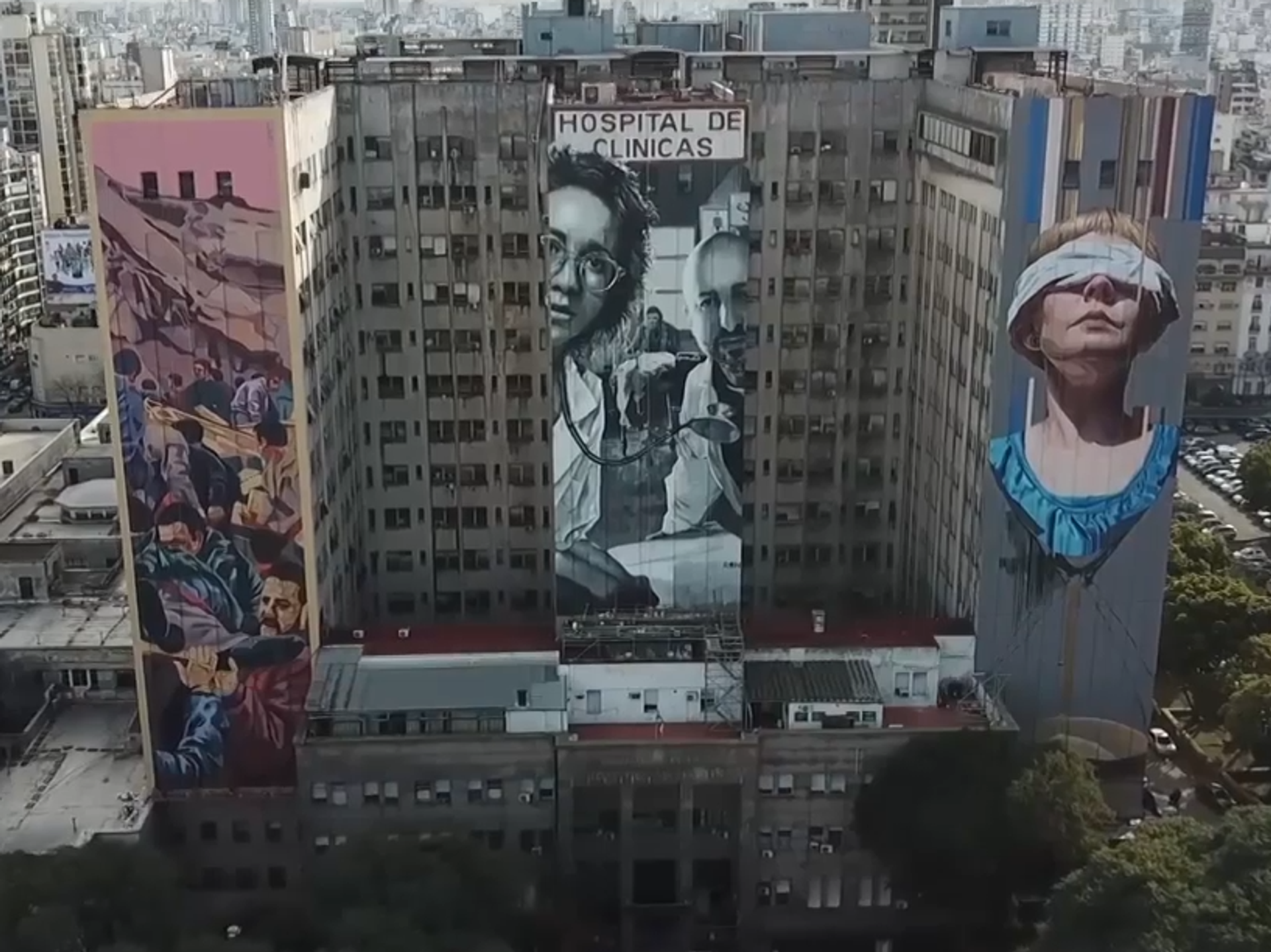 El primero, en la fachada izquierda del edificio, es obra de Mariano Antedoménico, y escenifica el momento posterior a la explosión. El mural central ha sido pintado por el artista Martín Ron, y rinde tributo al personal médico del hospital. El tercer y último mural, obra de Mariela Ajras, hace de una mujer con los ojos vendados un símbolo de la necesidad de que se haga justicia a las víctimas.