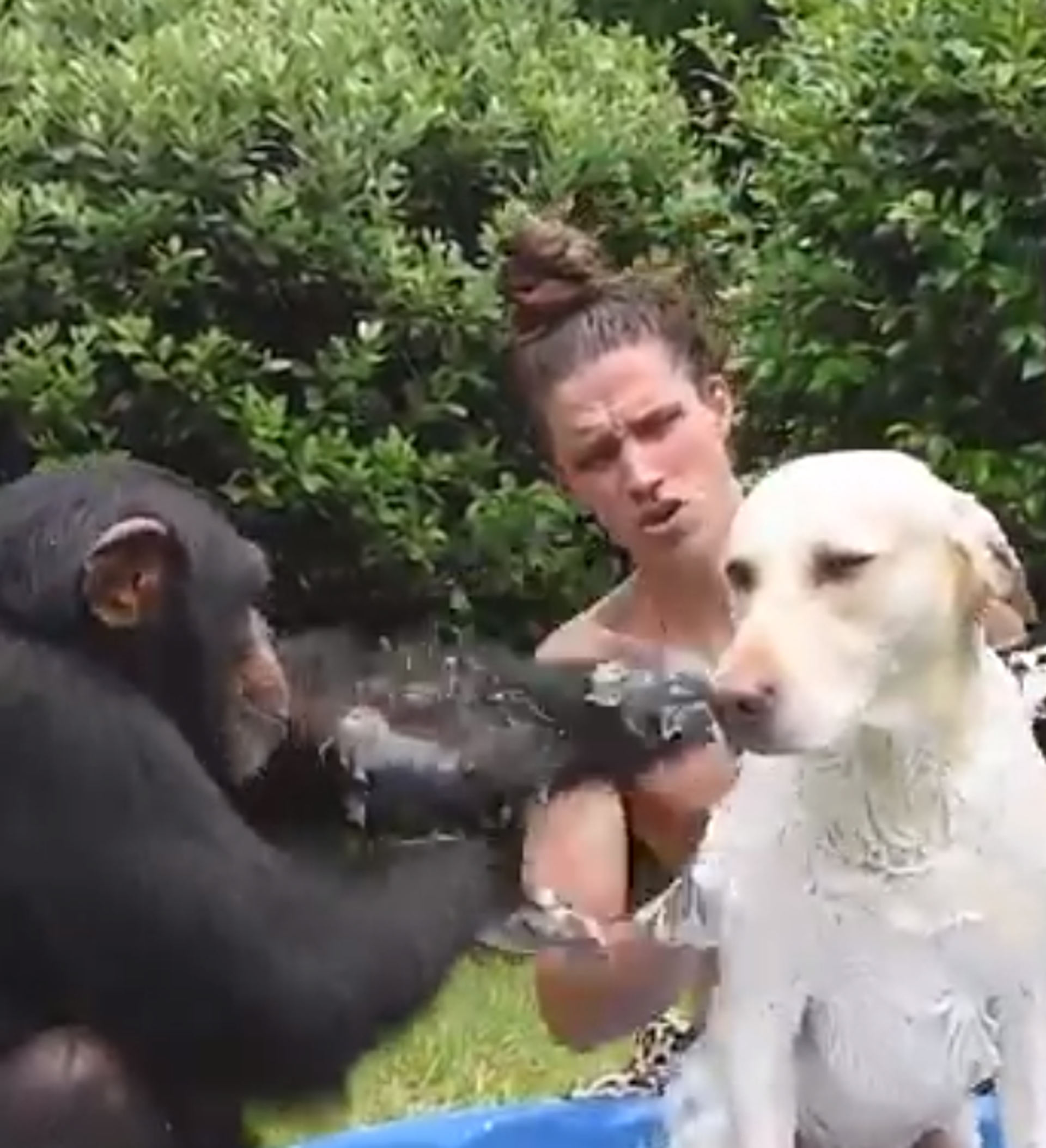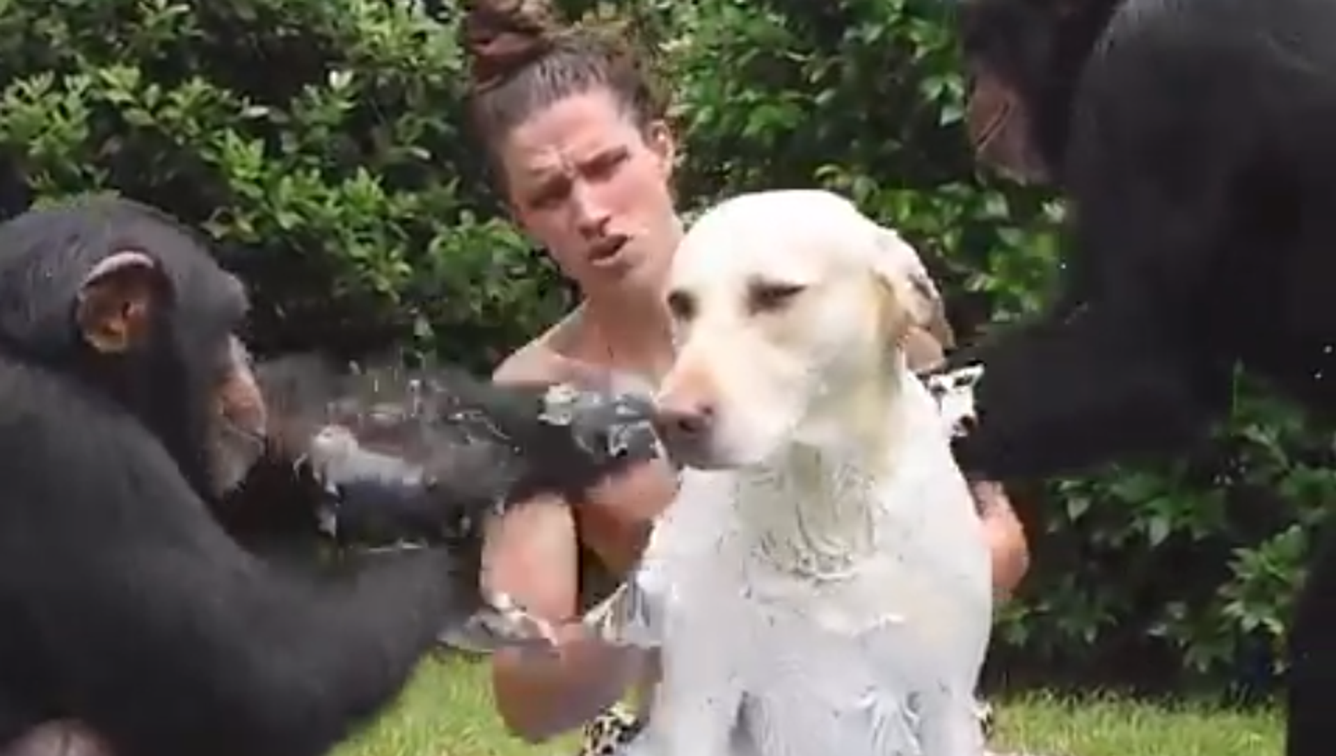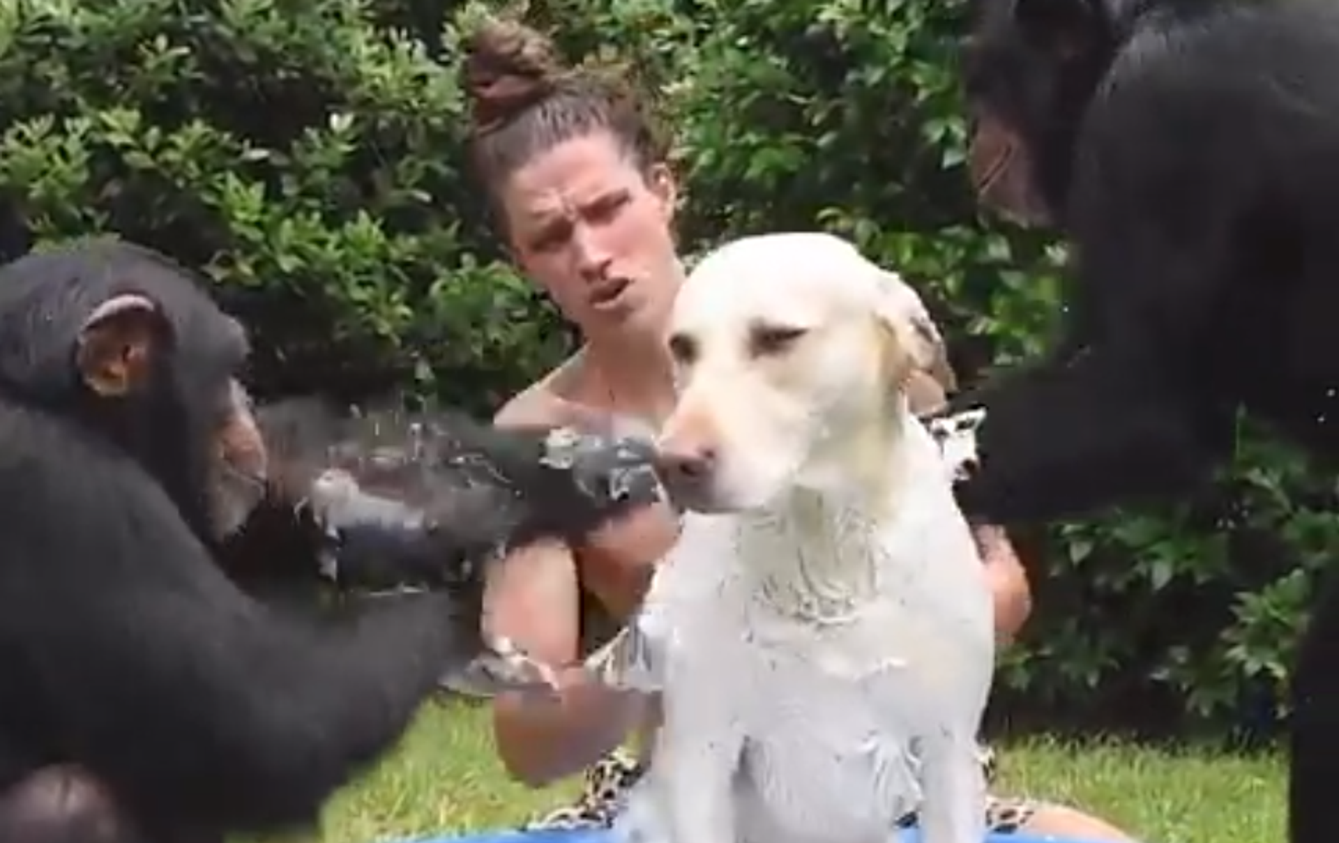 El humano, el perrito y, sobre todo, los chimpancés ¡se lo pasaron en grande!