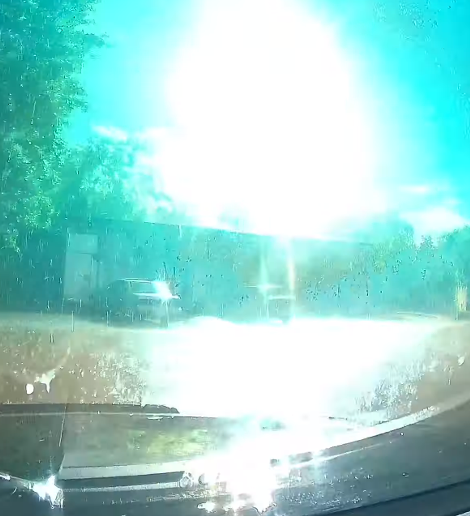 En las imágenes registradas por la cámara de a bordo del auto es posible ver y escuchar la explosión que sucede cuando un relámpago golpea una torre eléctrica, que inmediatamente se ilumina y lanza chispas.