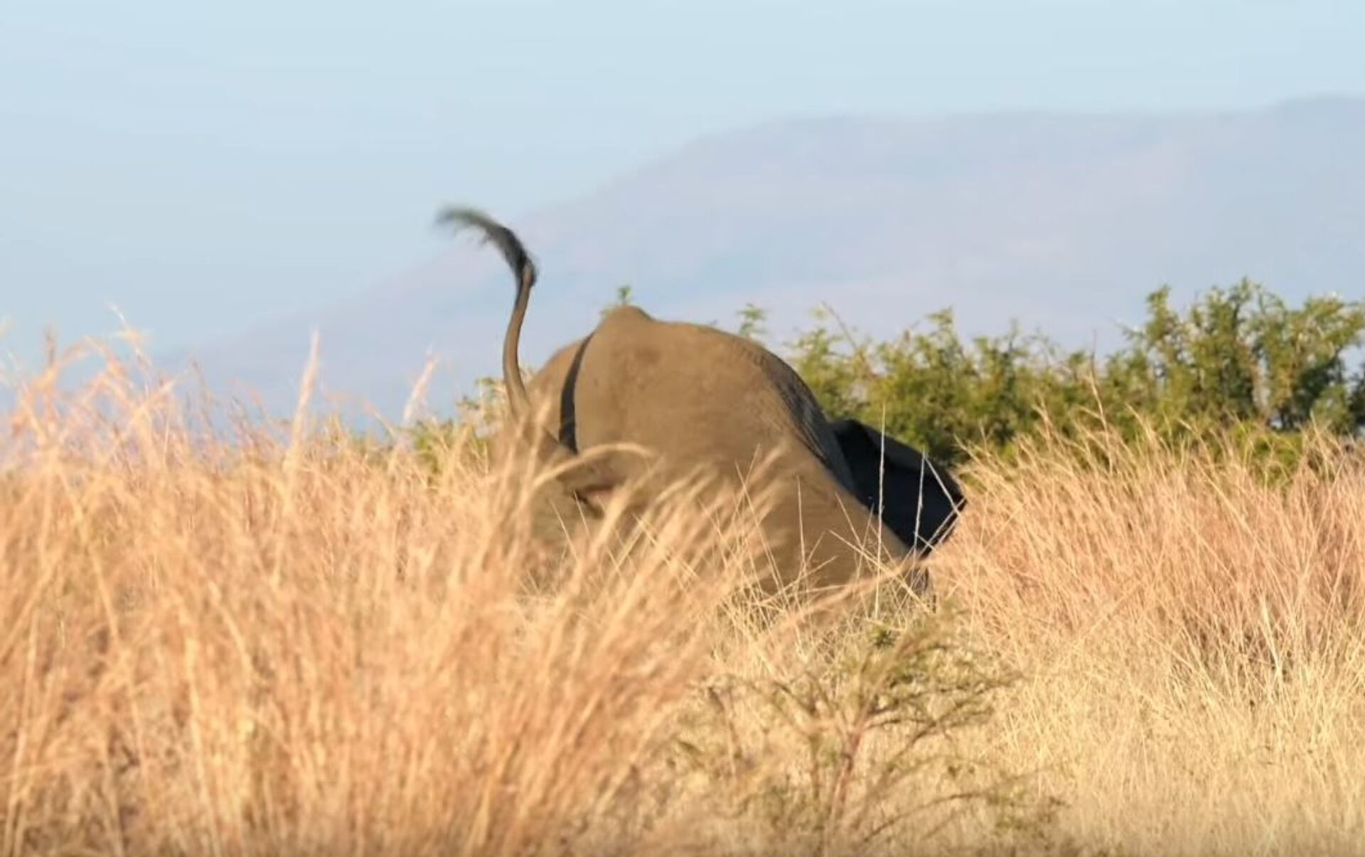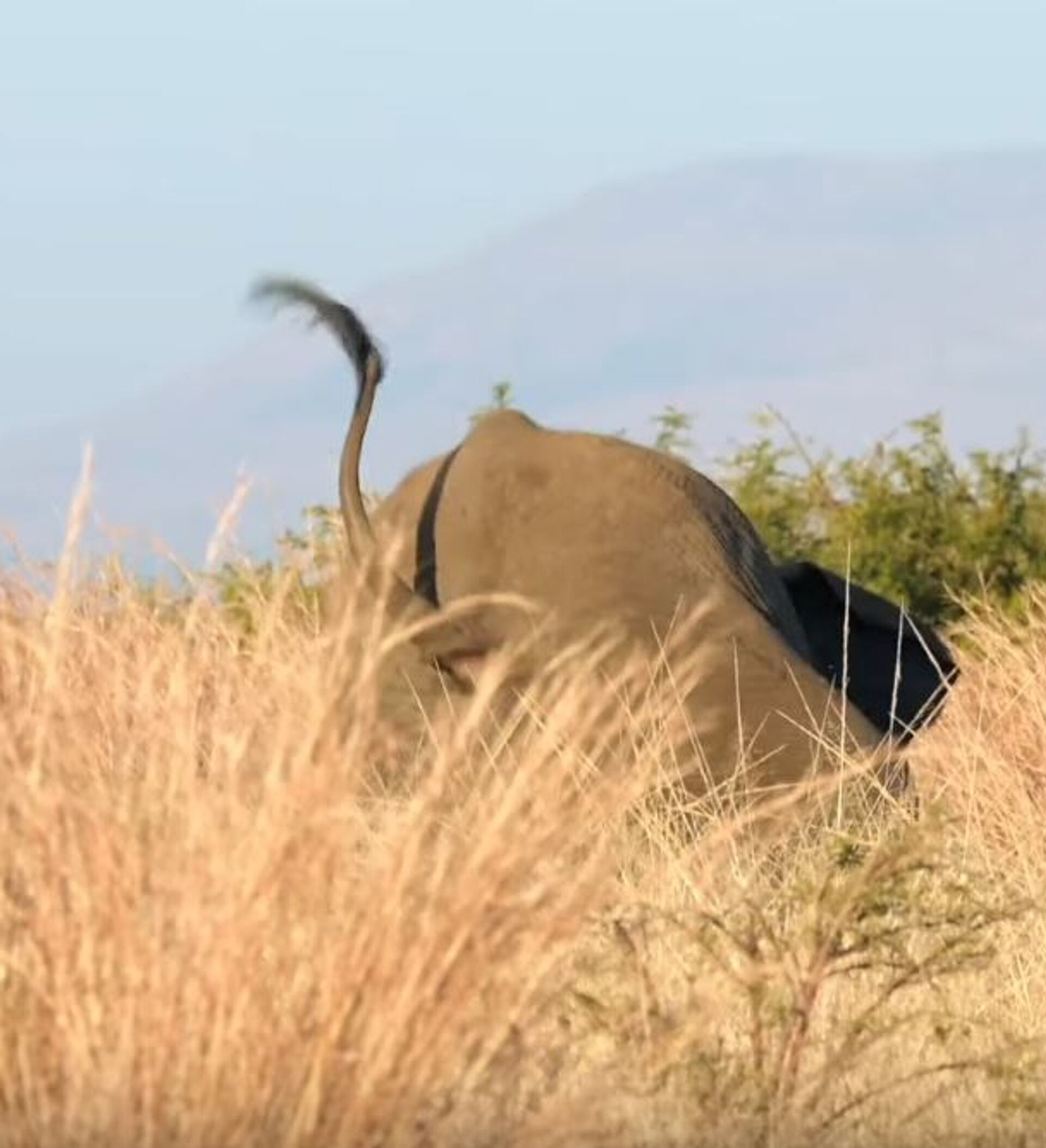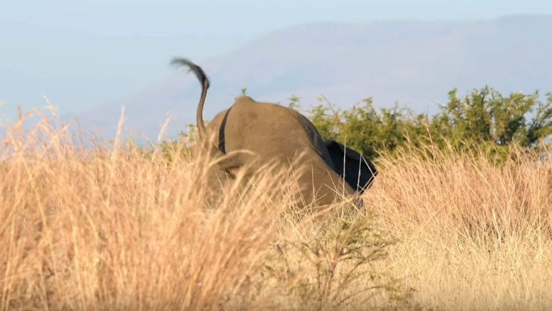 El vencedor del combate emprendió una persecución tras su oponente y tuvo un tropezón que lo hizo caer sobre sus rodillas. El elefante no tardó en recuperarse y los dos machos volvieron a la manada.