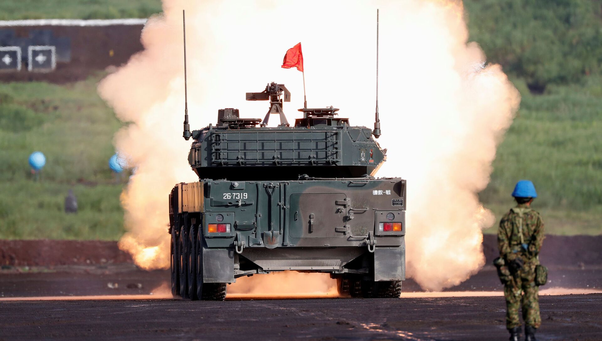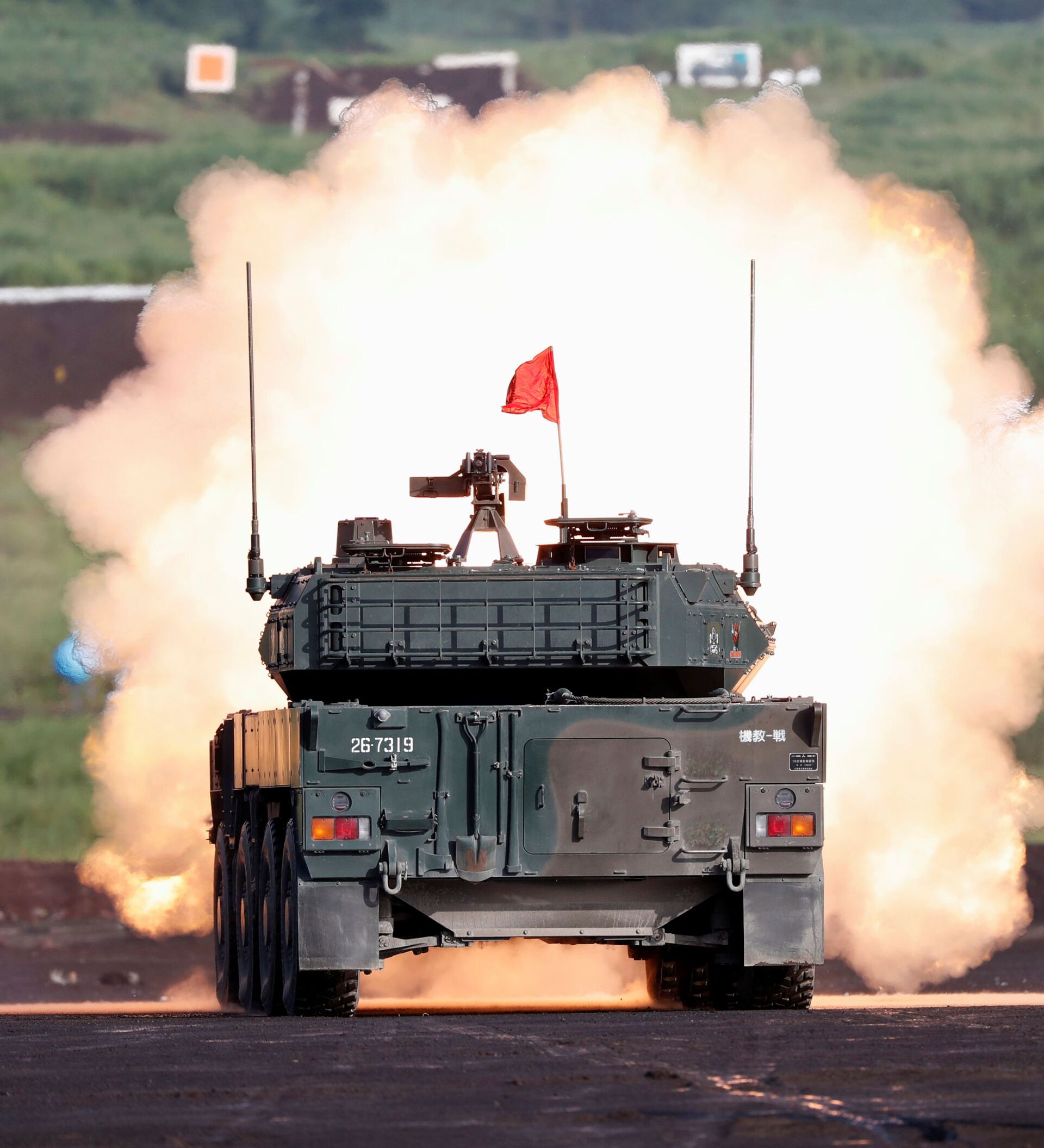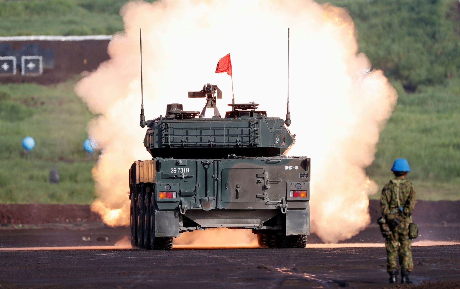 Los vehículos de las Fuerzas de Autodefensa de Japón se esconden detrás de unas cortinas de aerosoles que los defienden de los sistemas de guiado de misiles antitanque.