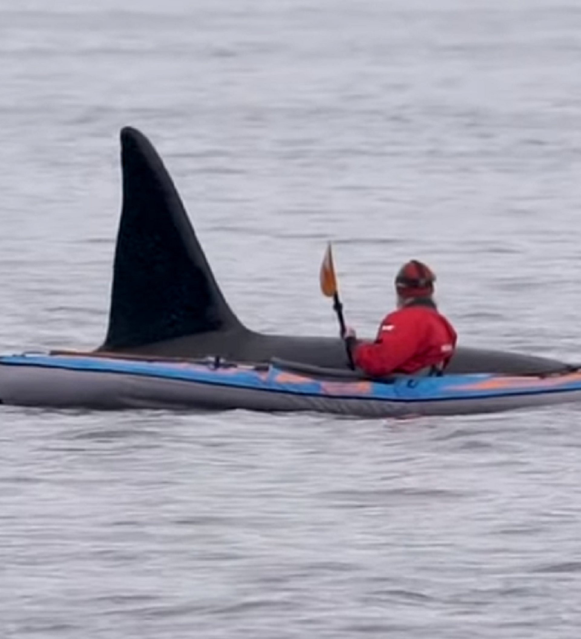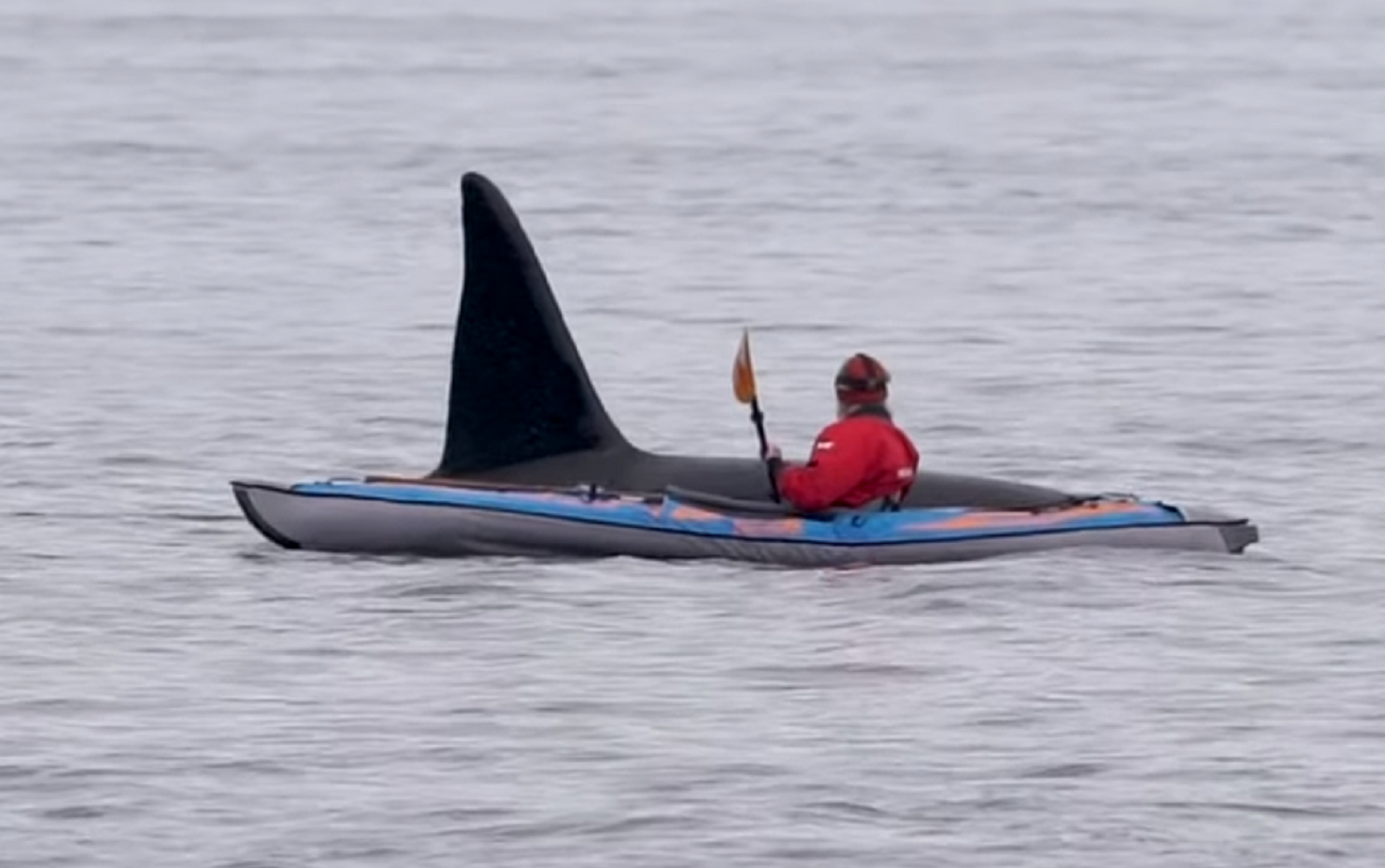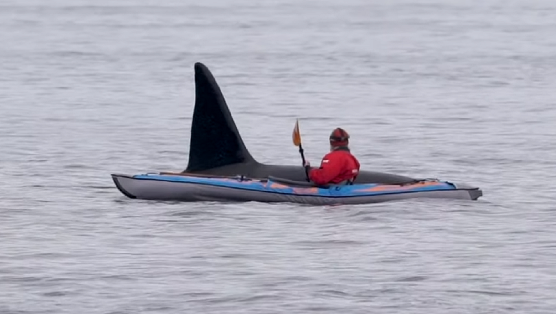 En la grabación se puede ver cómo el animal emerge del agua, se acerca al kayakista y tras pasar cerca de él, vuelve a desaparecer en el mar.