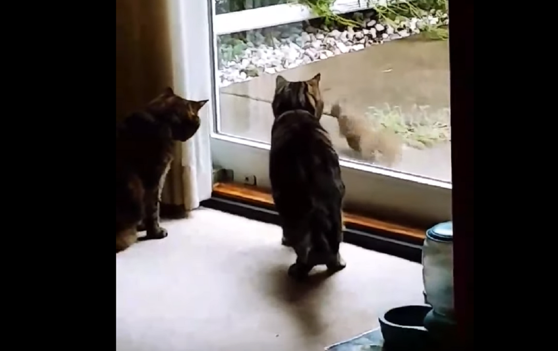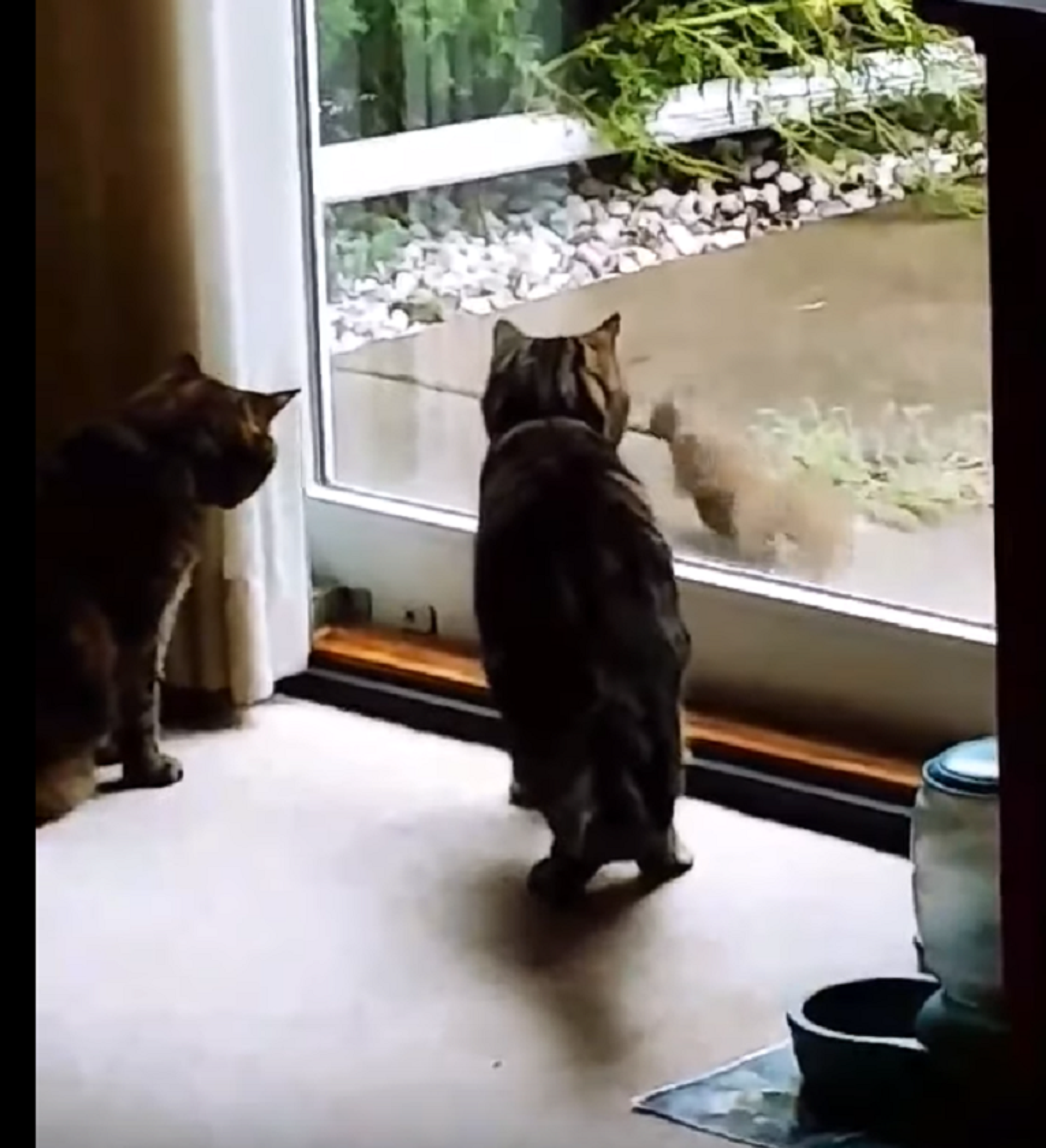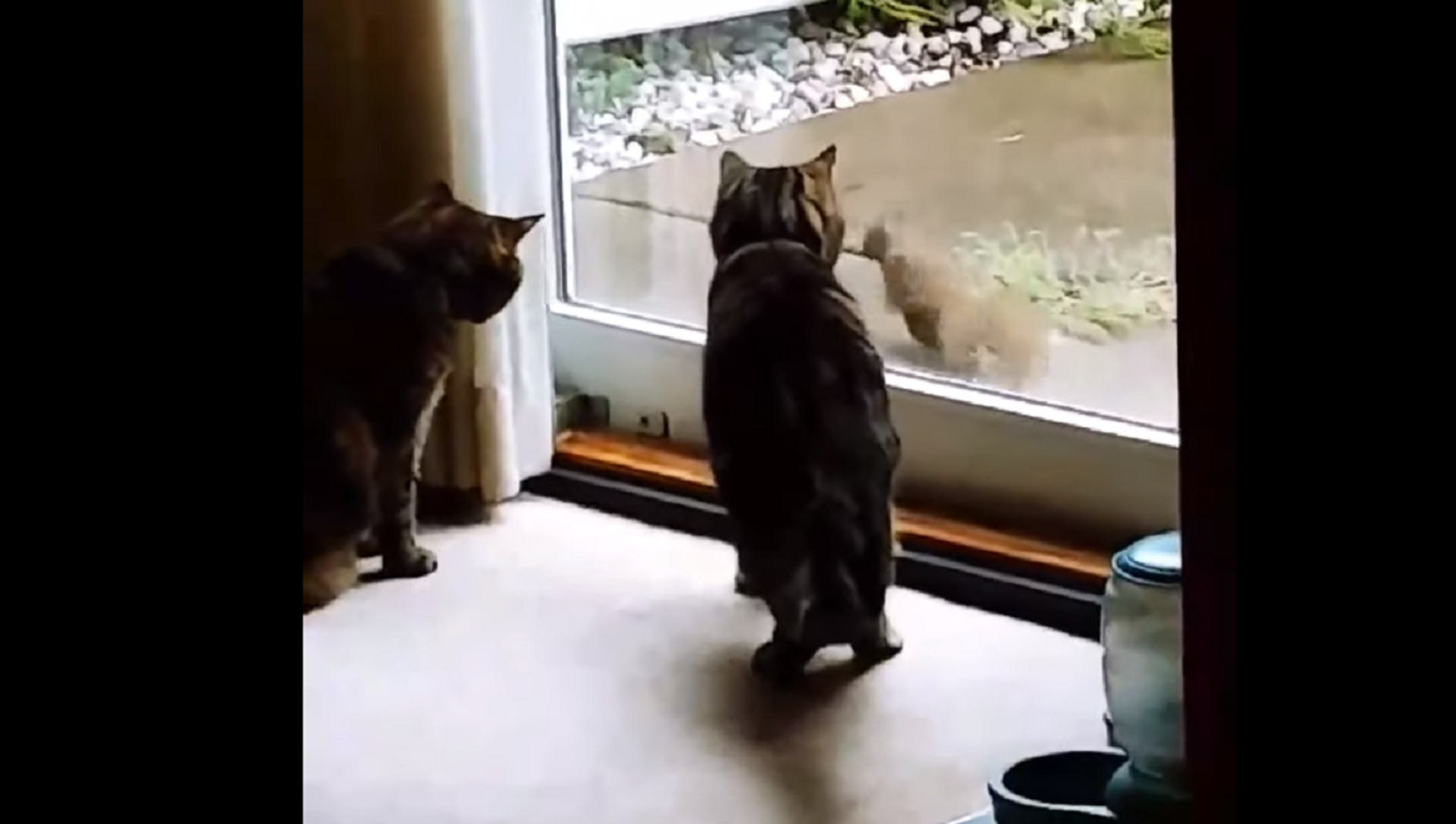 Una desfachatada ardilla se divirtió a costa de dos gatitos que estaban presos dentro de su casa. A los pobres felinos solo les quedó observar el roedor saltar de un lado al otro, sin poder atraparlo.
