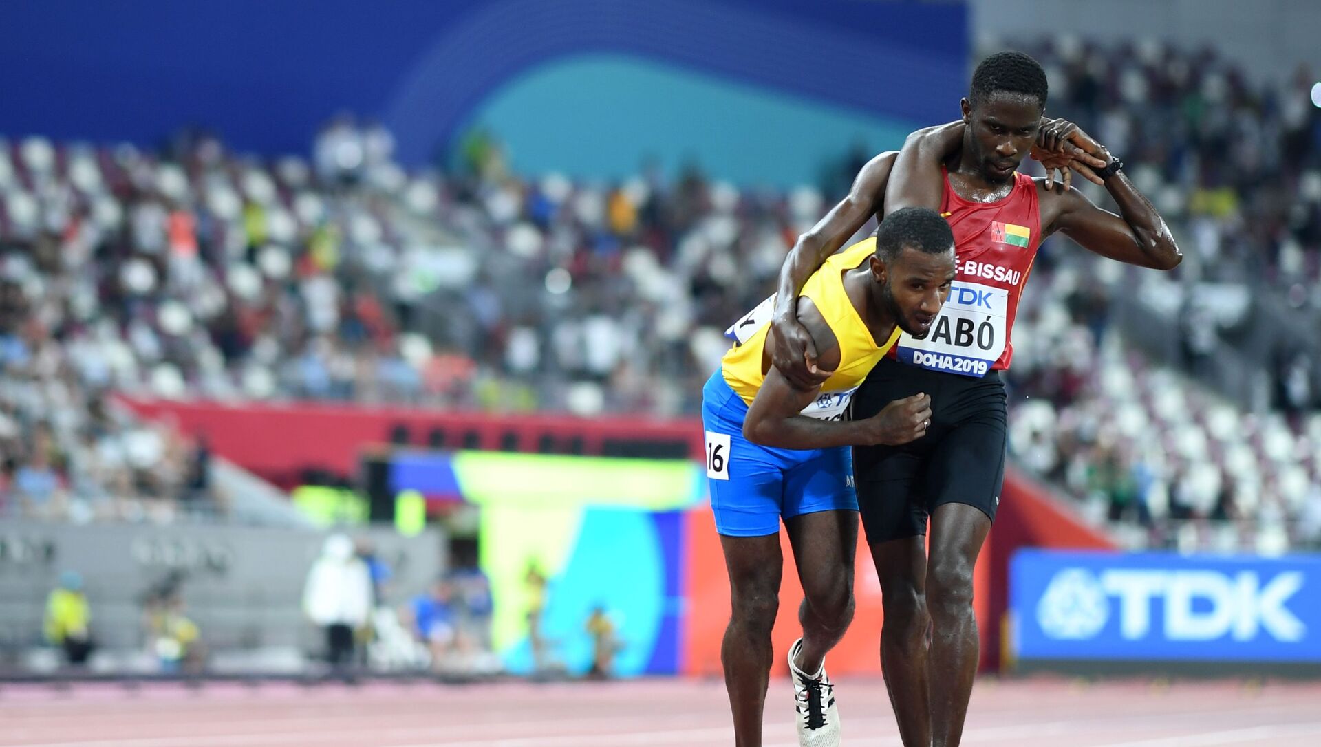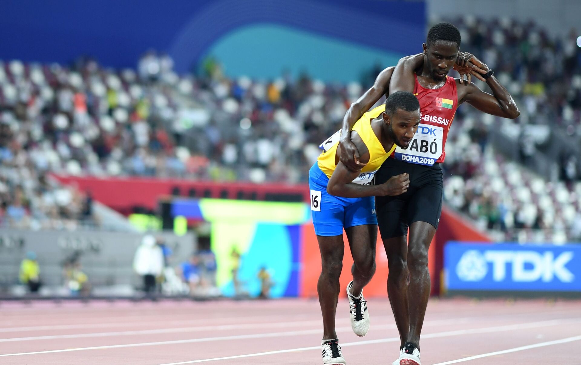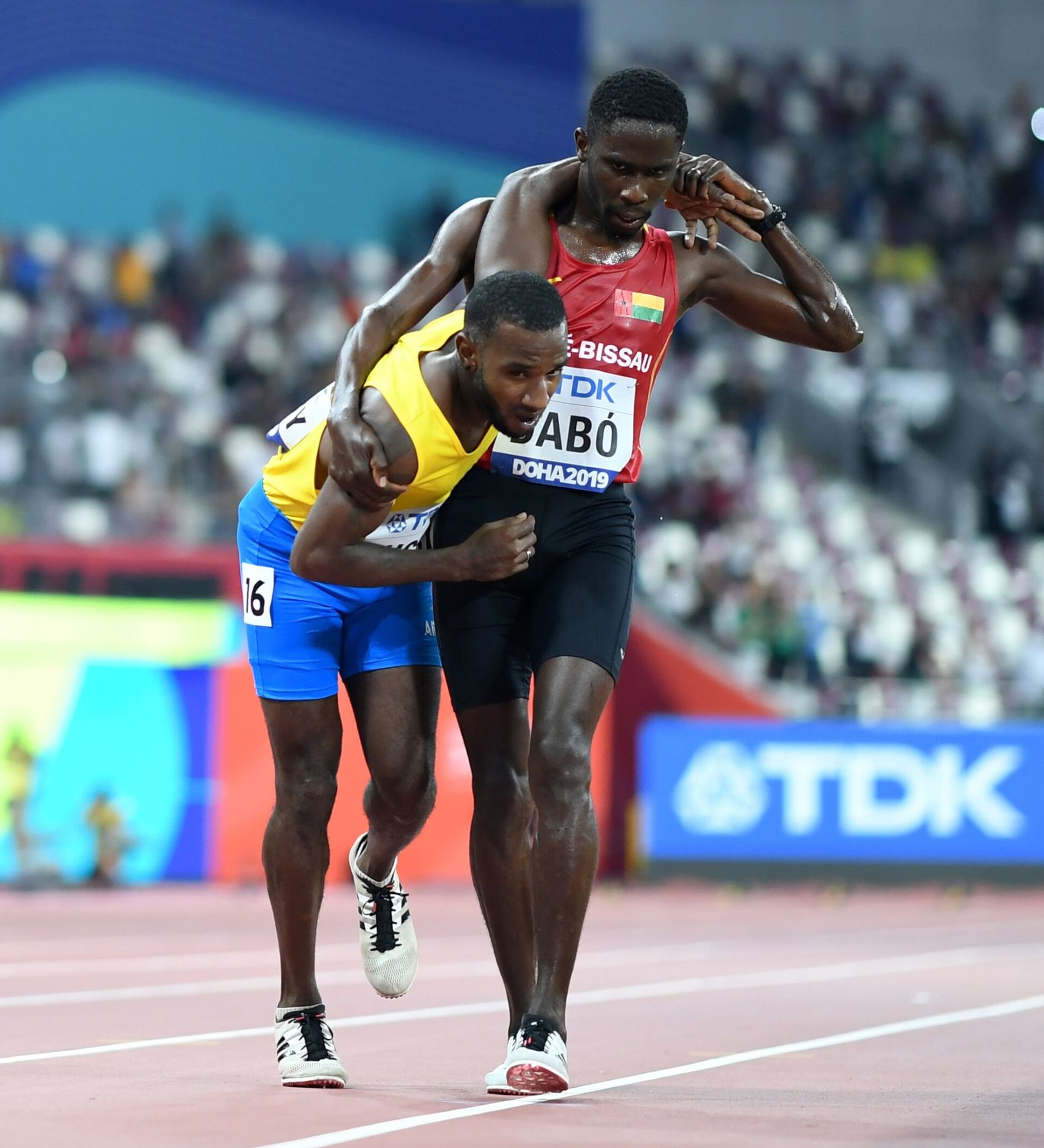 El arubense, de 33 años, se sintió mal en la última vuelta, apenas podía llegar a la meta solo. Entonces, Braima Dabó, de 26 años, lo apoyó sobre su hombro y juntos dieron los últimos pasos hacia la línea final.