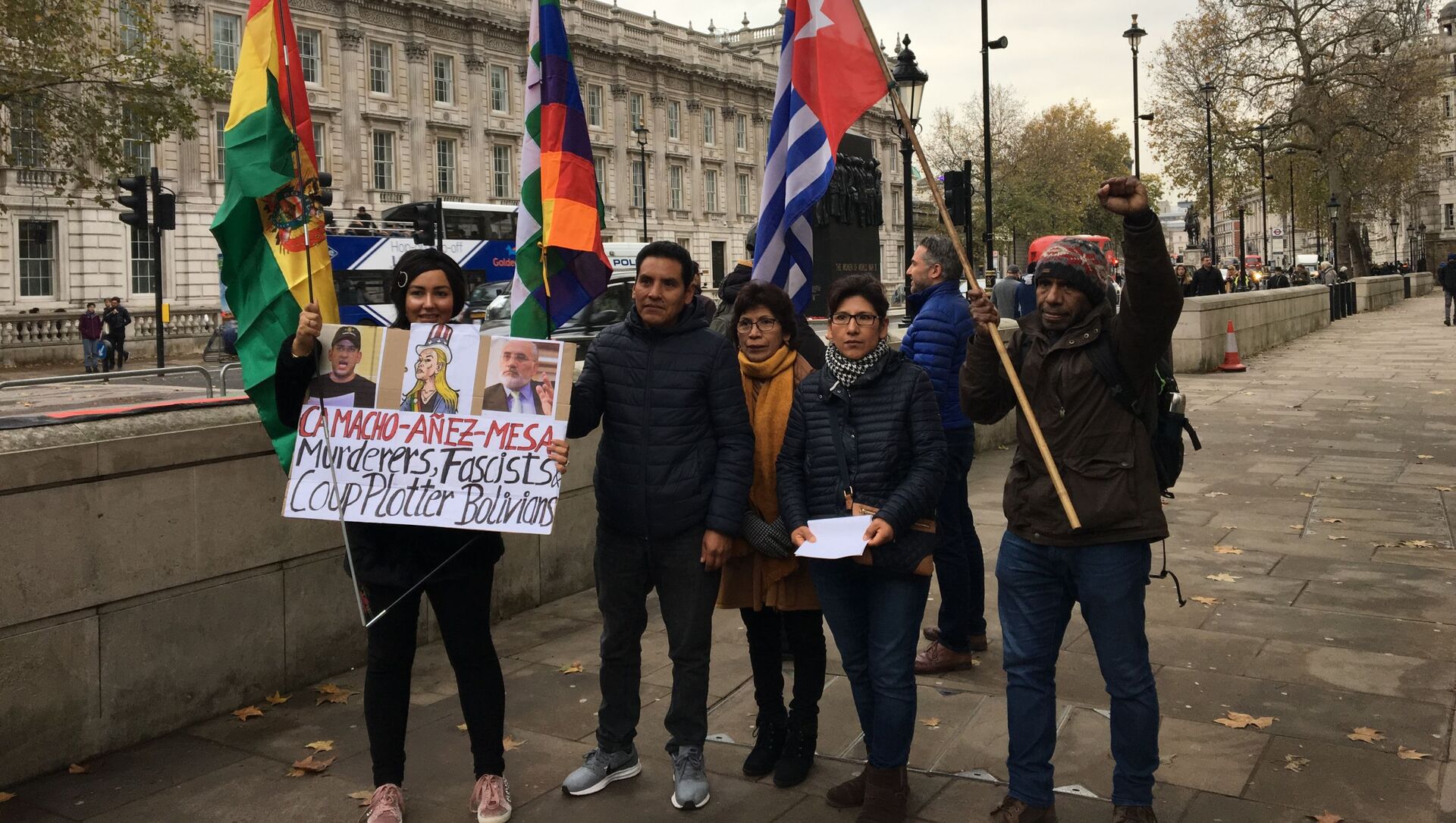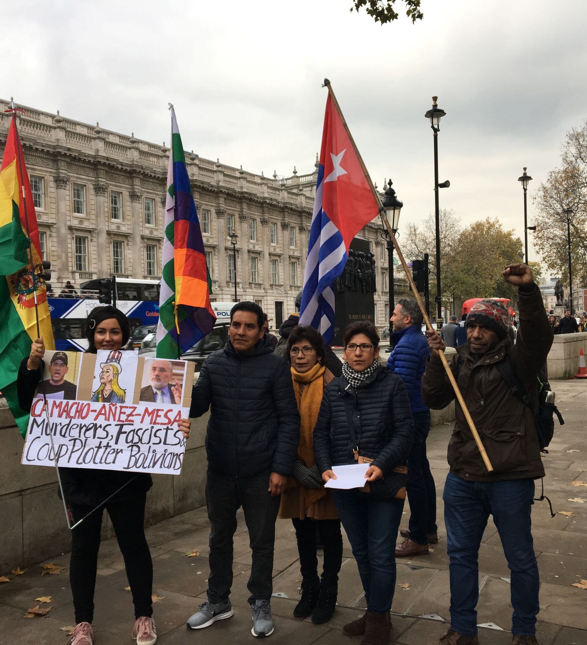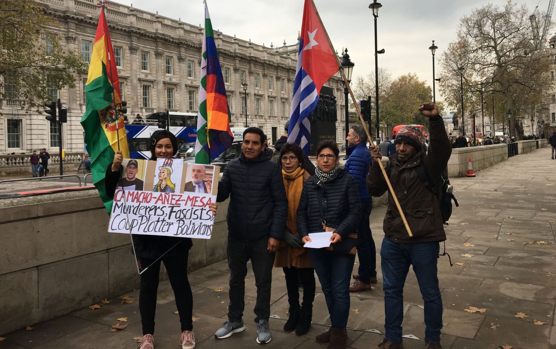 "Áñez fascista, golpista, queremos tu renuncia", clamaron frente a Downing Street, residencia oficial del primer ministro británico, Boris Johnson.