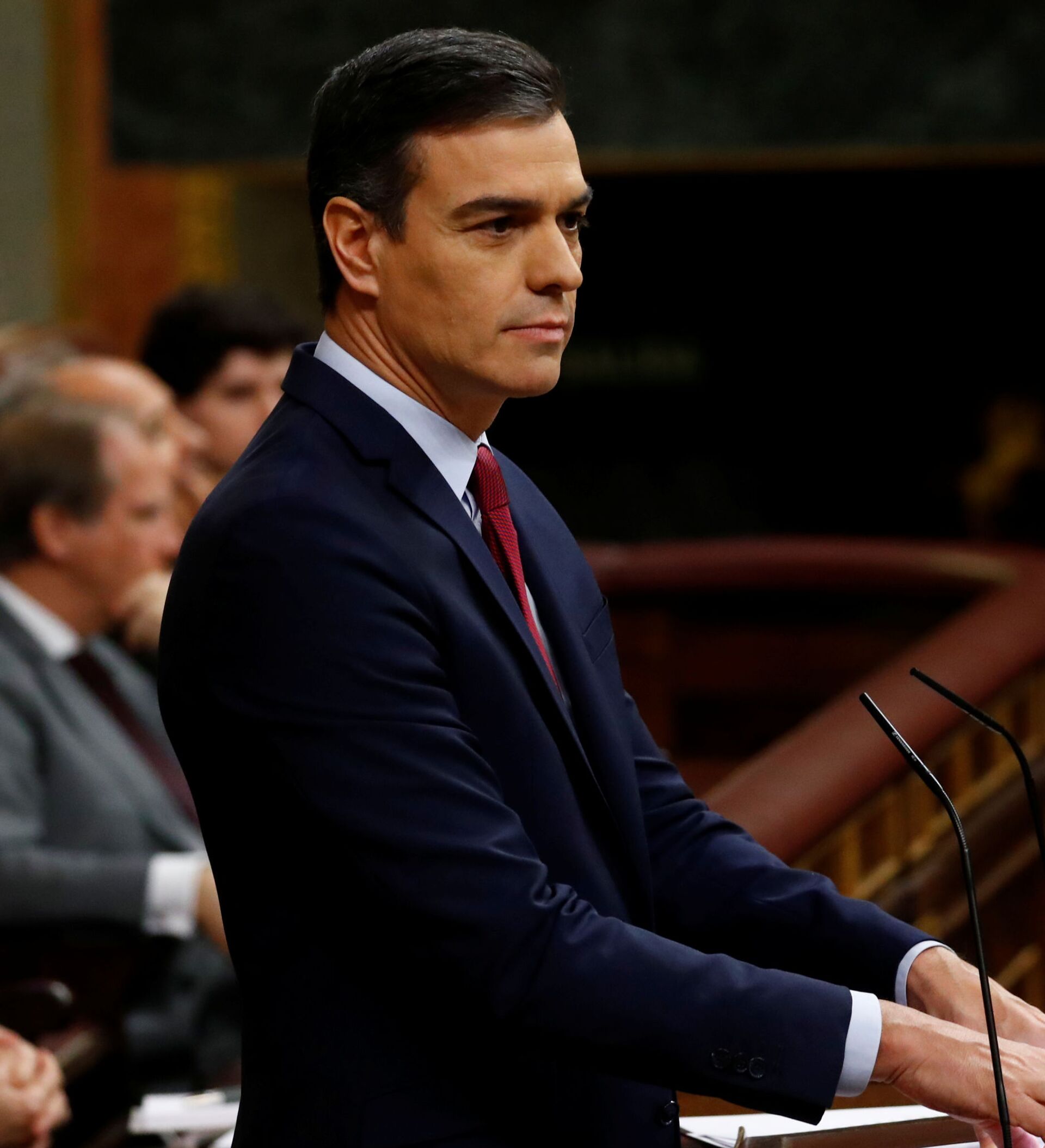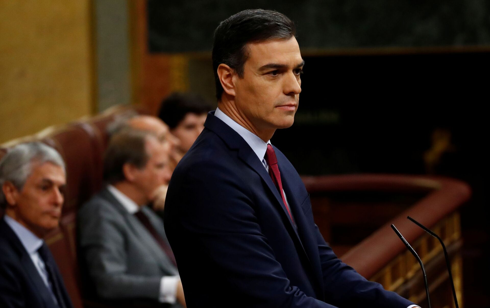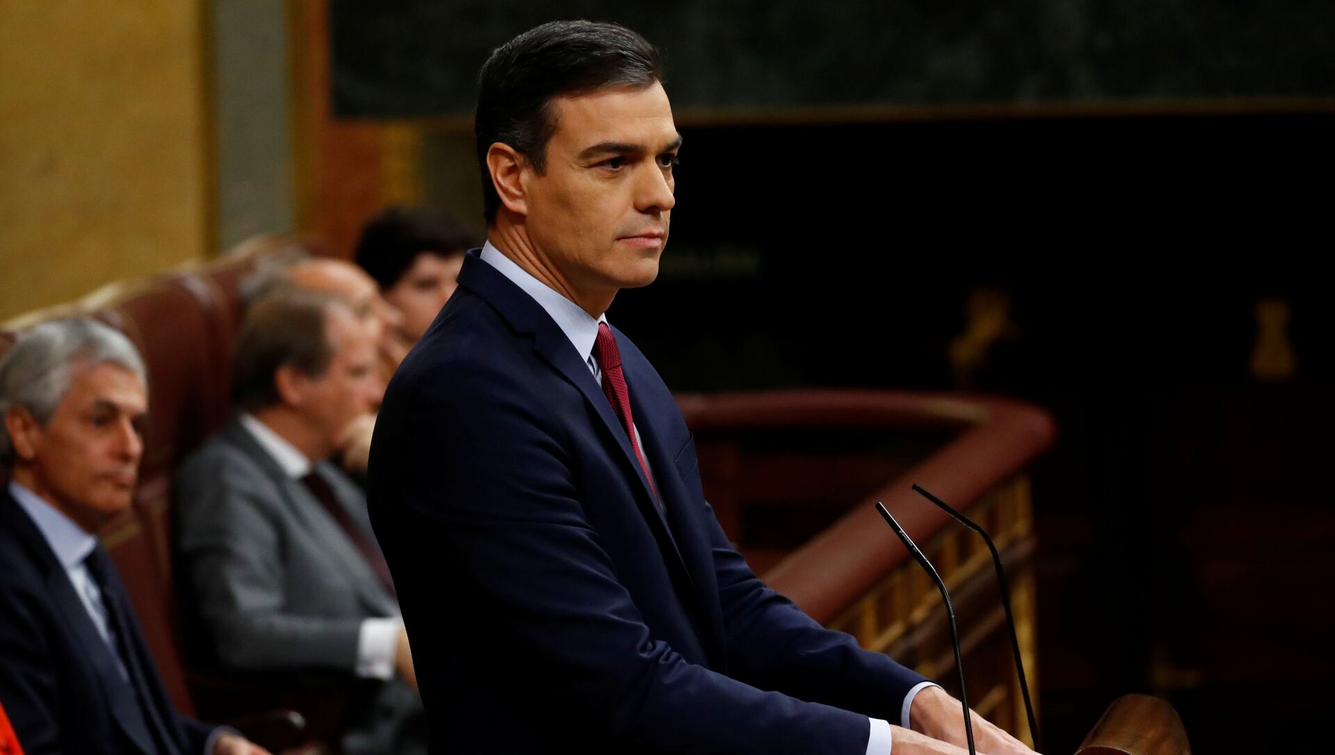 En la segunda parte de su discurso, ya centrado en la cuestión para la que se encuentra reunido el hemiciclo, Abascal acusó a Sánchez de formar un Gobierno "arrodillado" contra lo que él considera los enemigos de España.