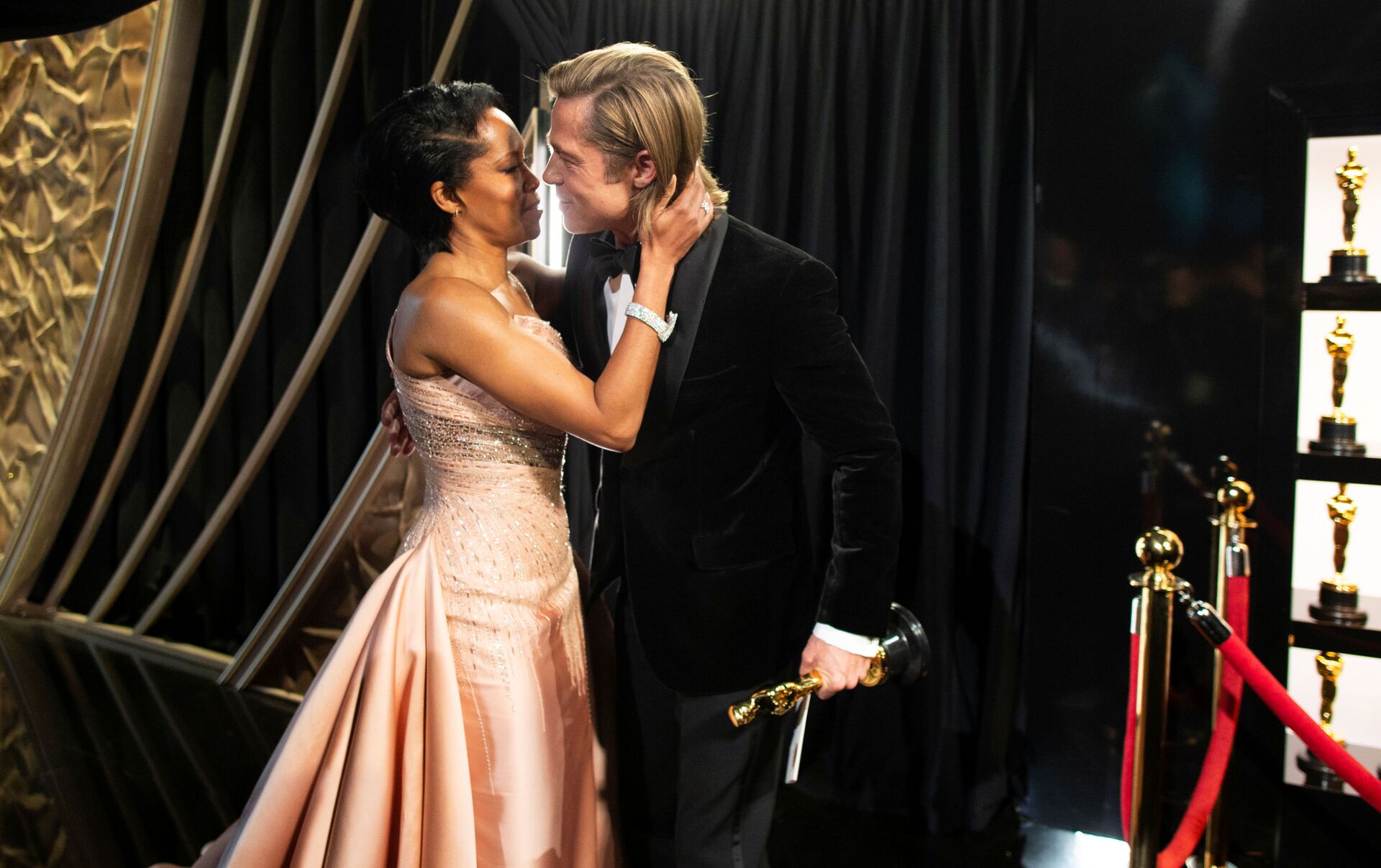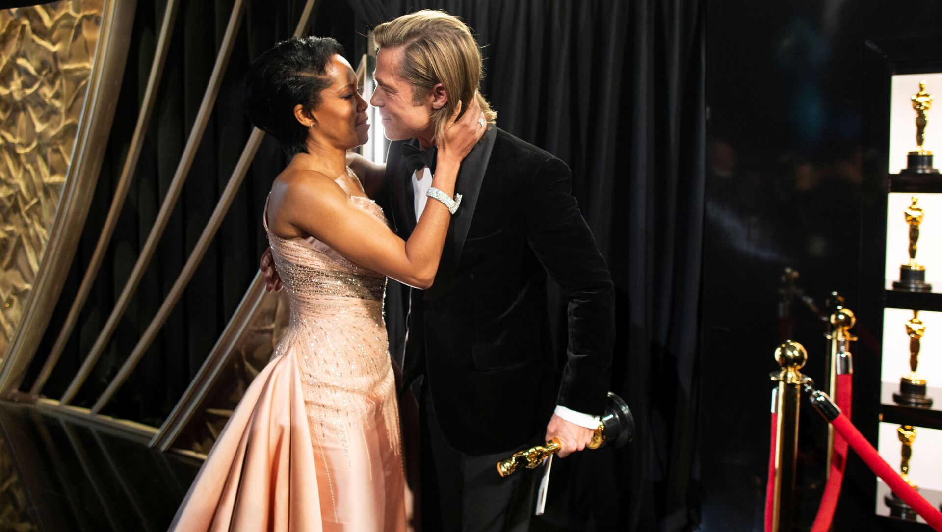 © REUTERS / Matt Petit/A.M.P.A.S.El mejor actor de reparto, Brad Pitt, abraza a la actriz Regina King mientras sostiene su estatuilla.