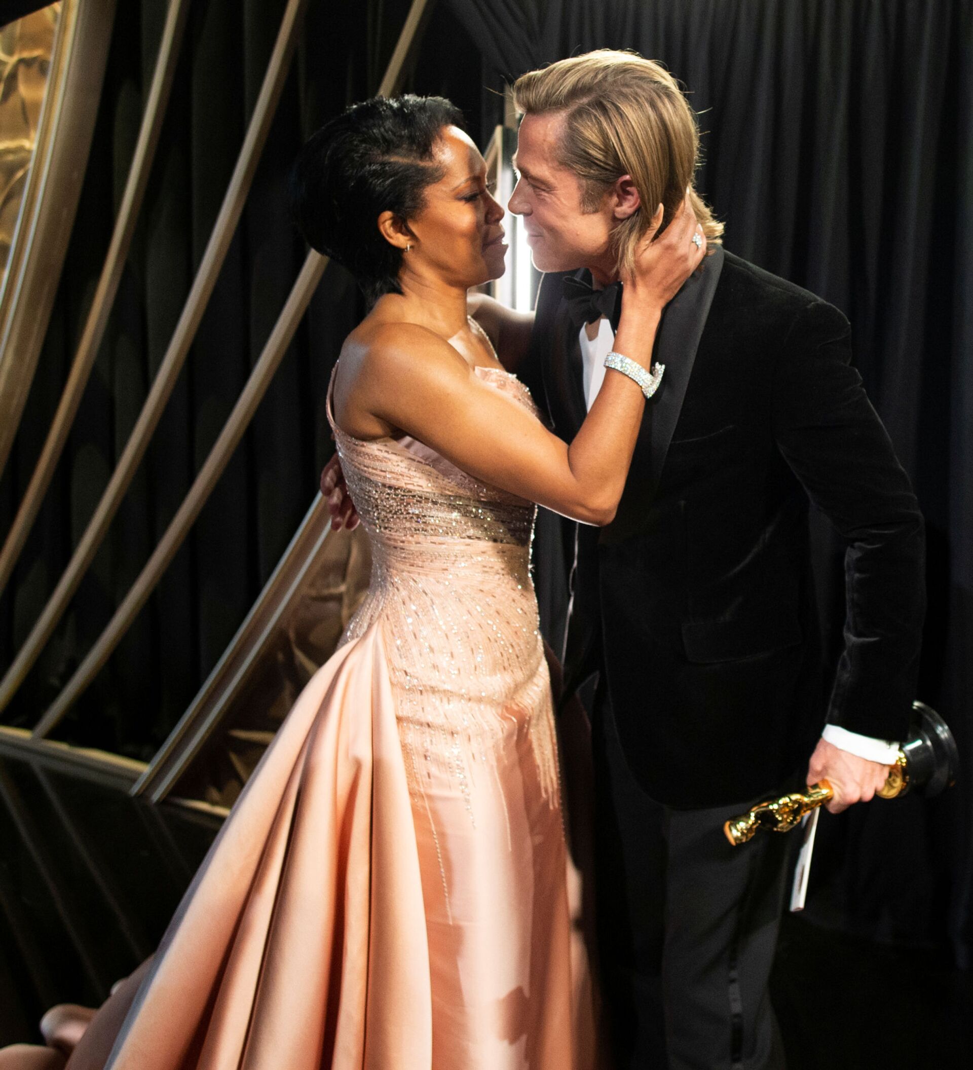 El mejor actor de reparto, Brad Pitt, abraza a la actriz Regina King mientras sostiene su estatuilla.