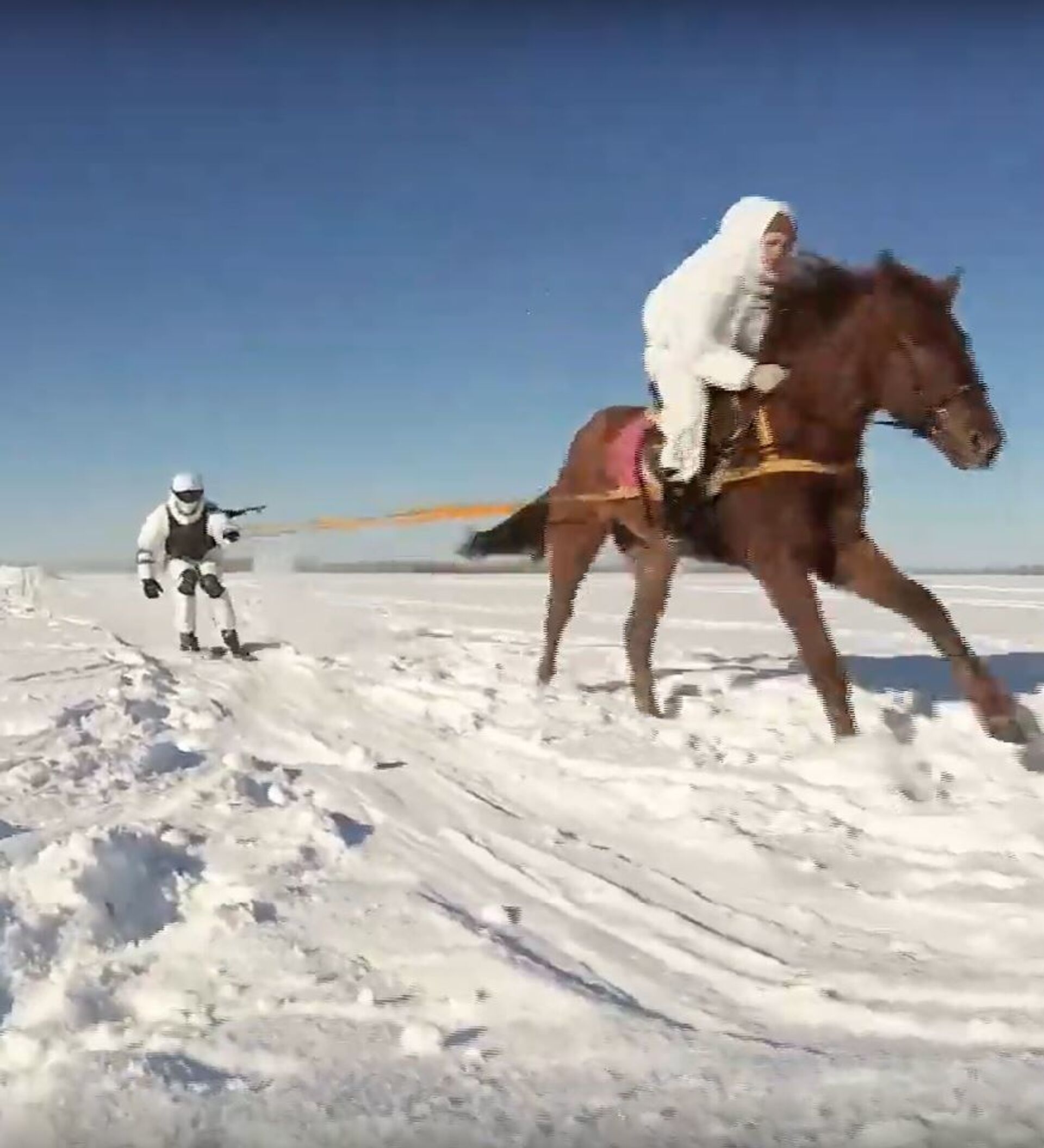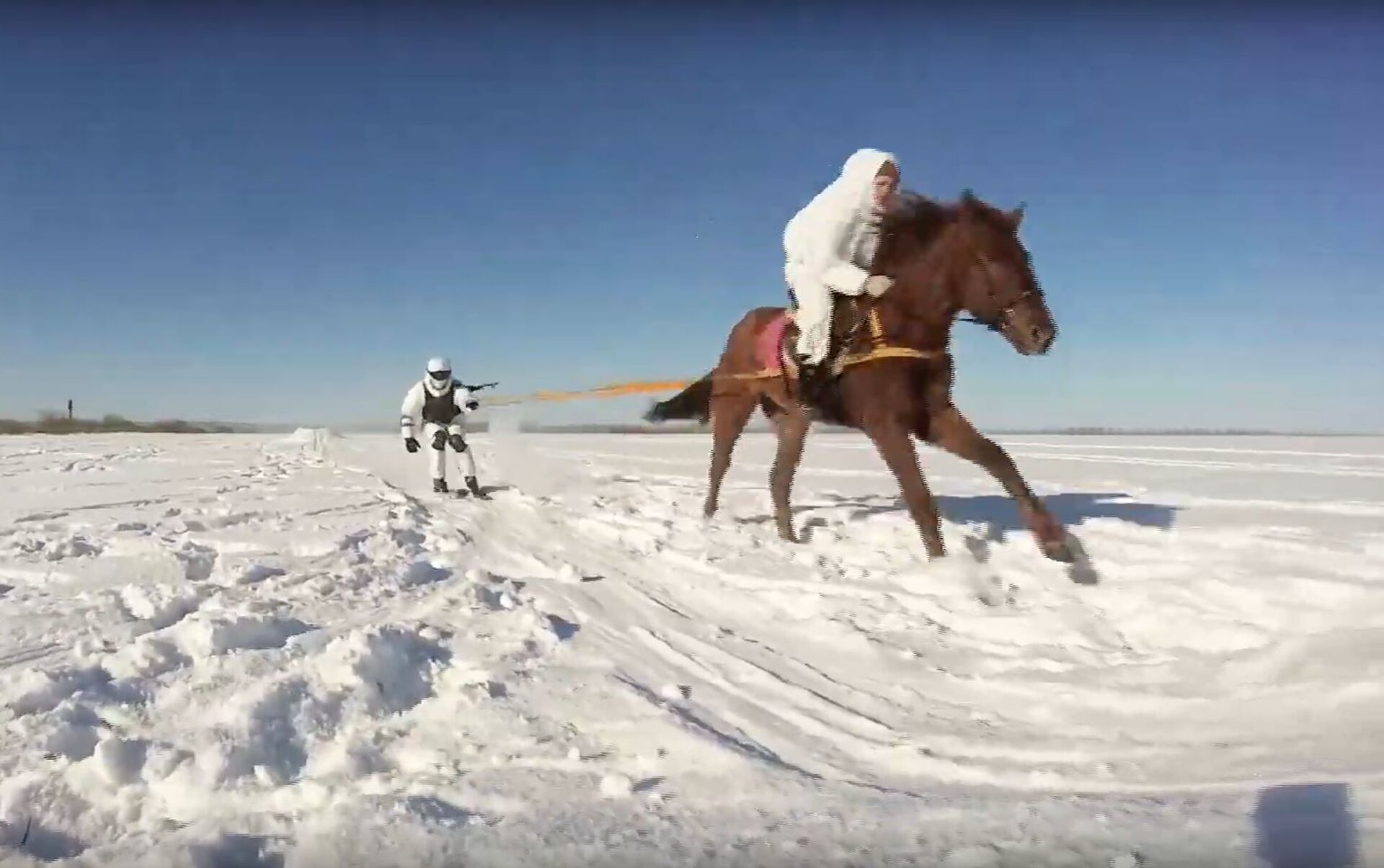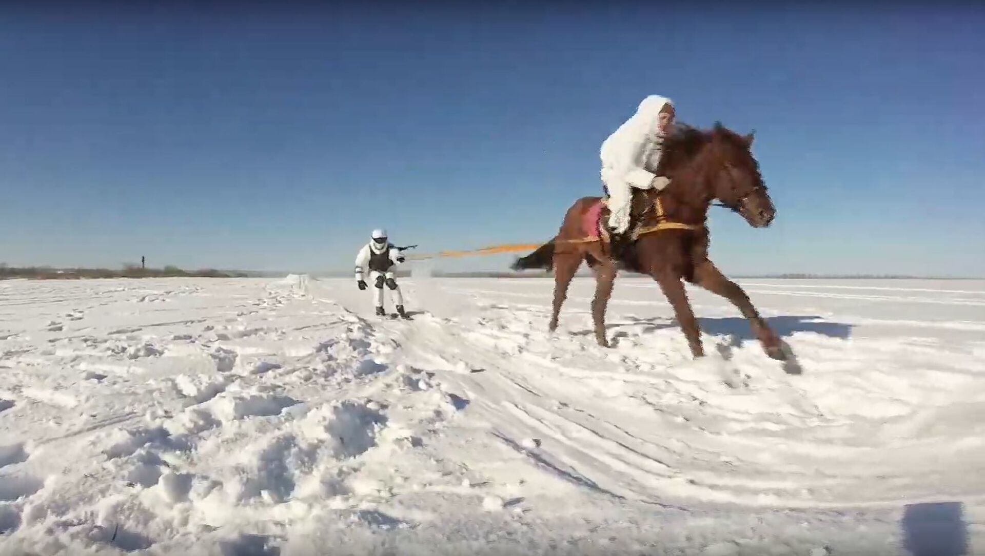 El skijoring es un deporte invernal donde un esquiador es arrastrado por perros, moto de nieve o, cómo es el caso de los militares rusos, por un caballo. Sin embargo, los soldados no practican este deporte para ganar en competiciones, sino como medio de transporte y desplazamiento rápido sobre la nieve.