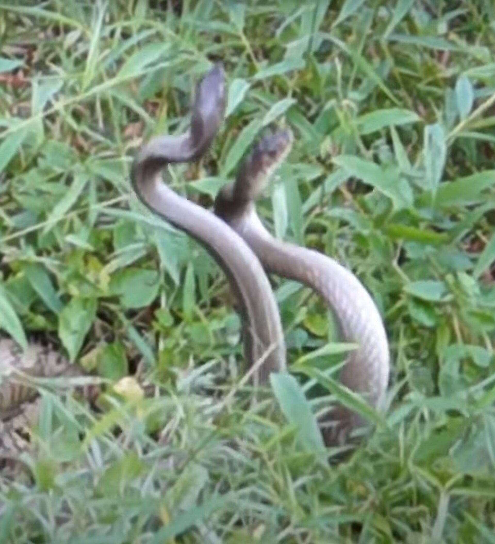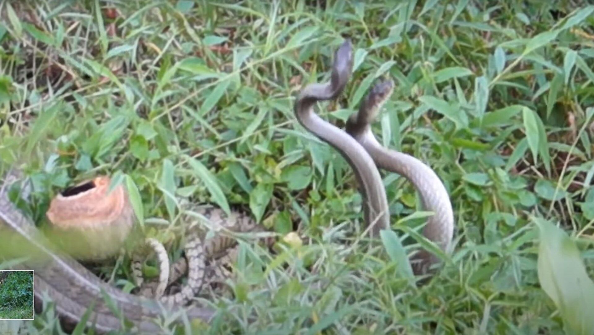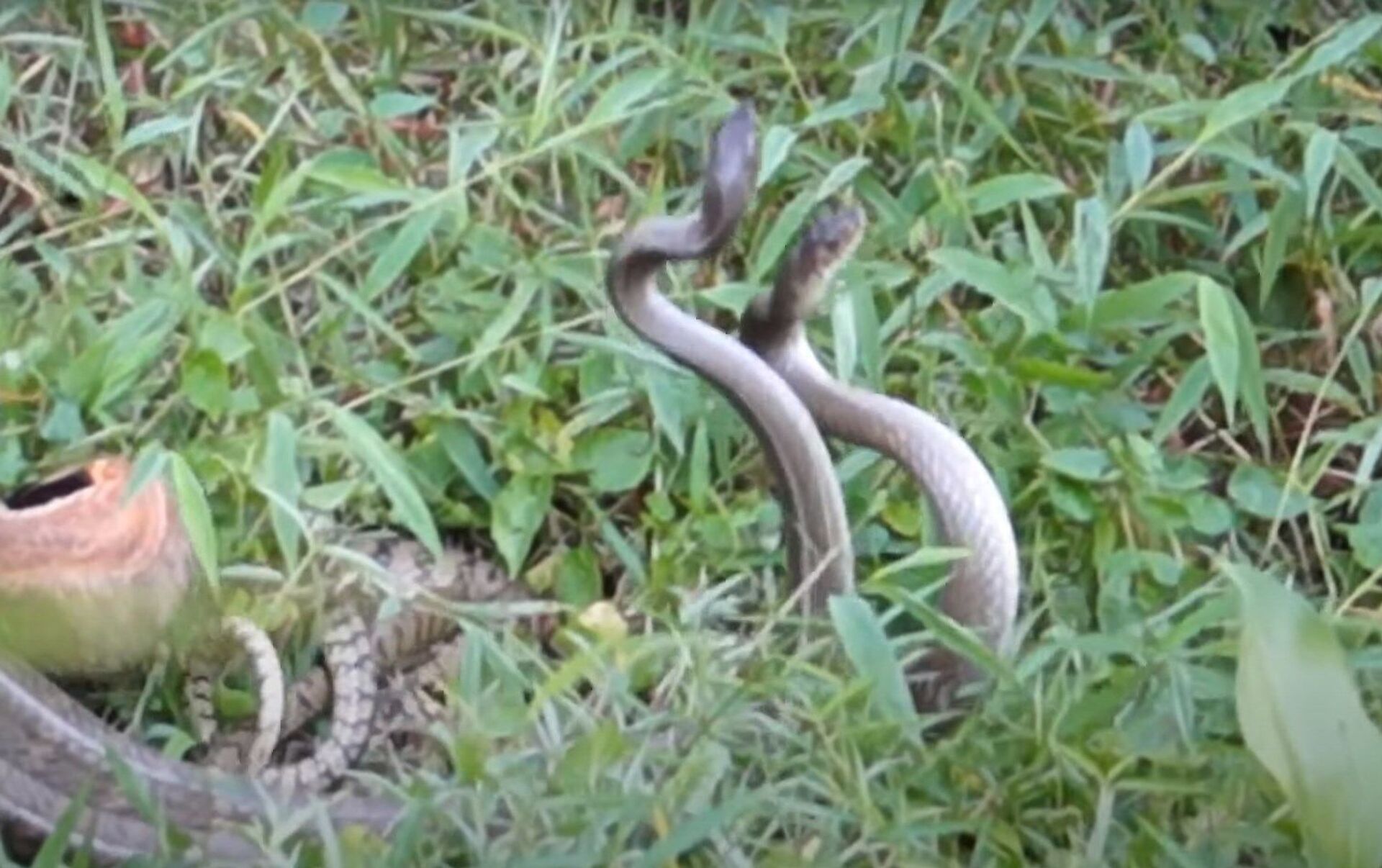 Una tailandesa grabó a dos cobras reales de tres metros bailando en su patio. las serpientes estaban inmersas en el apareamiento y no repararon en los espectadores.