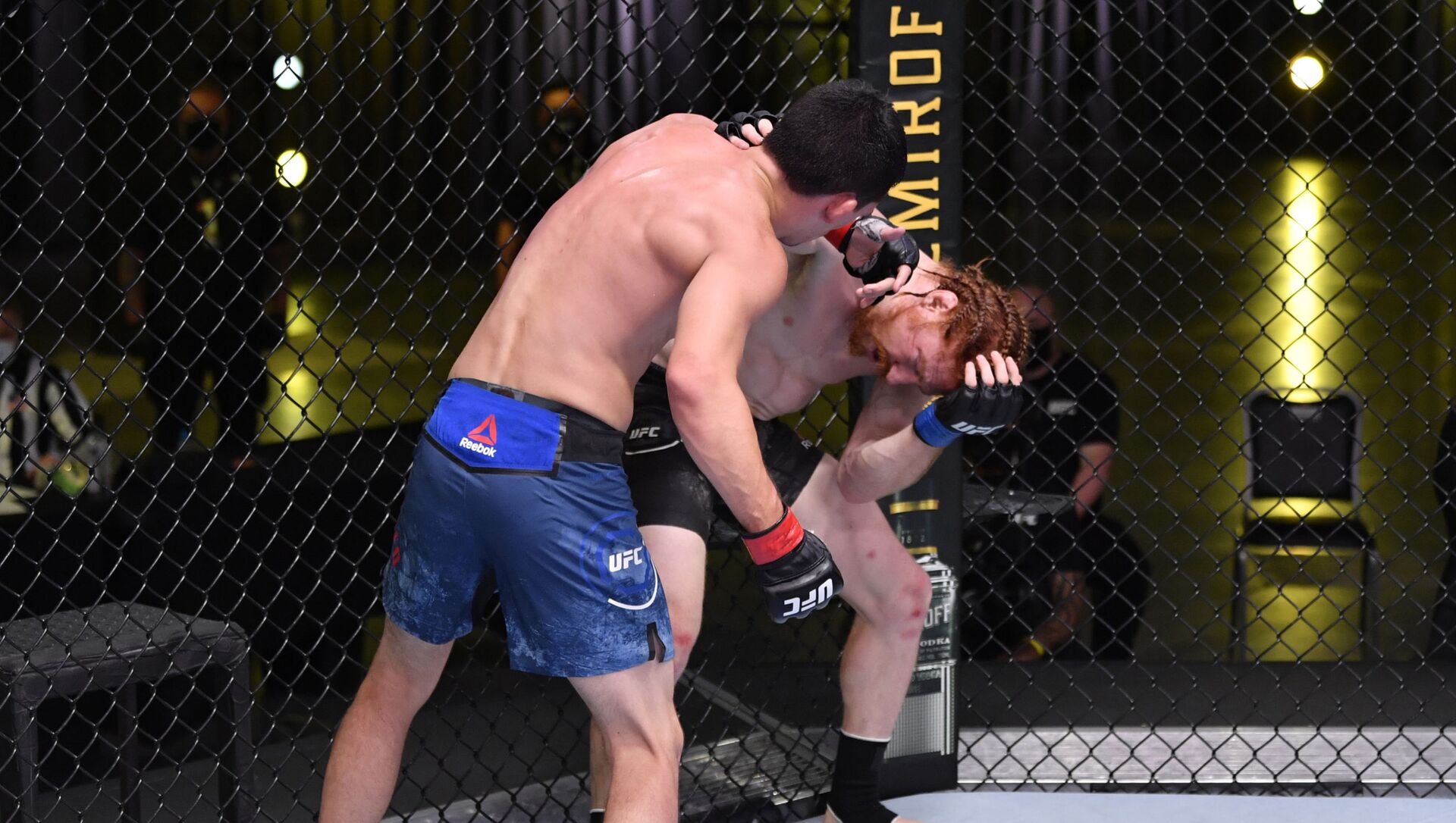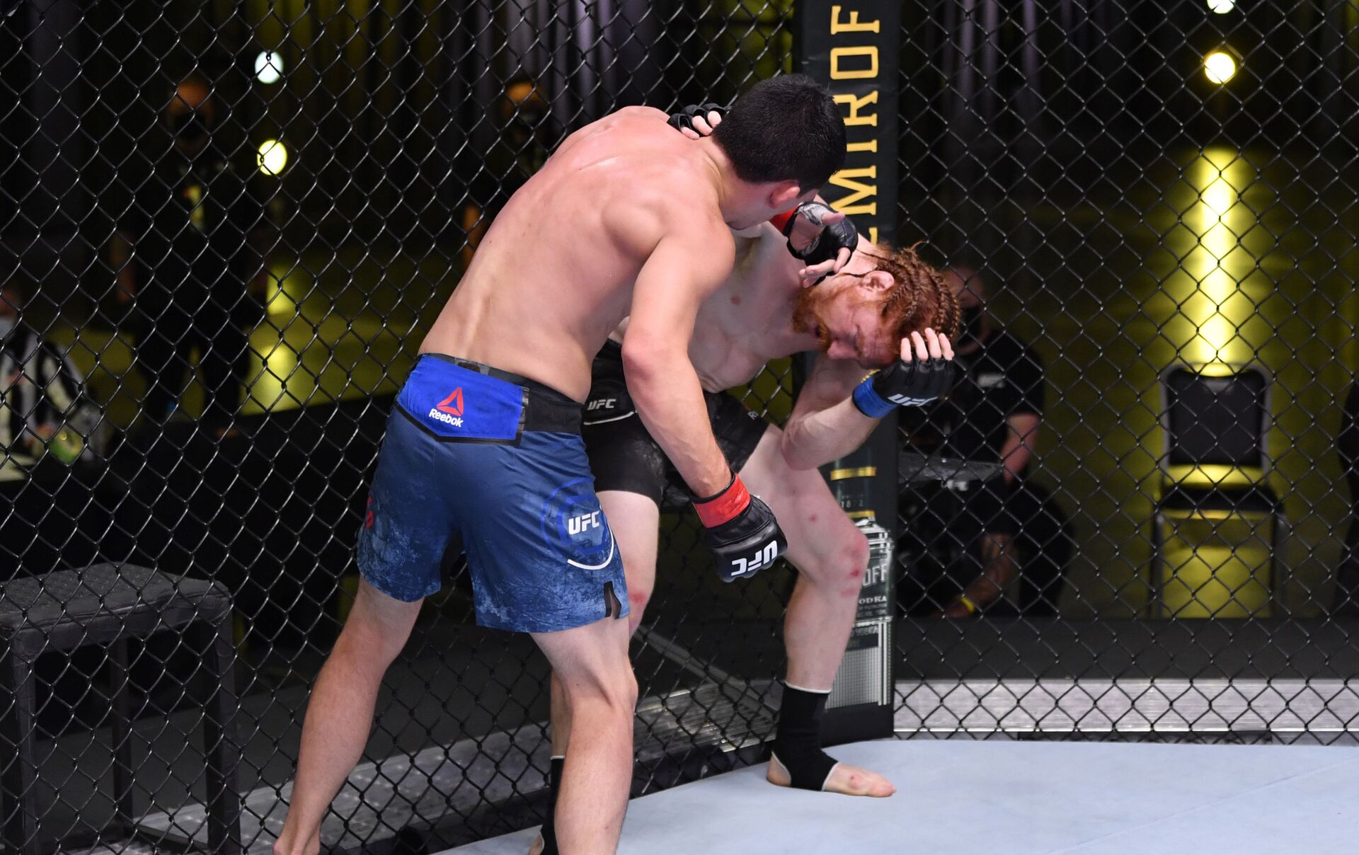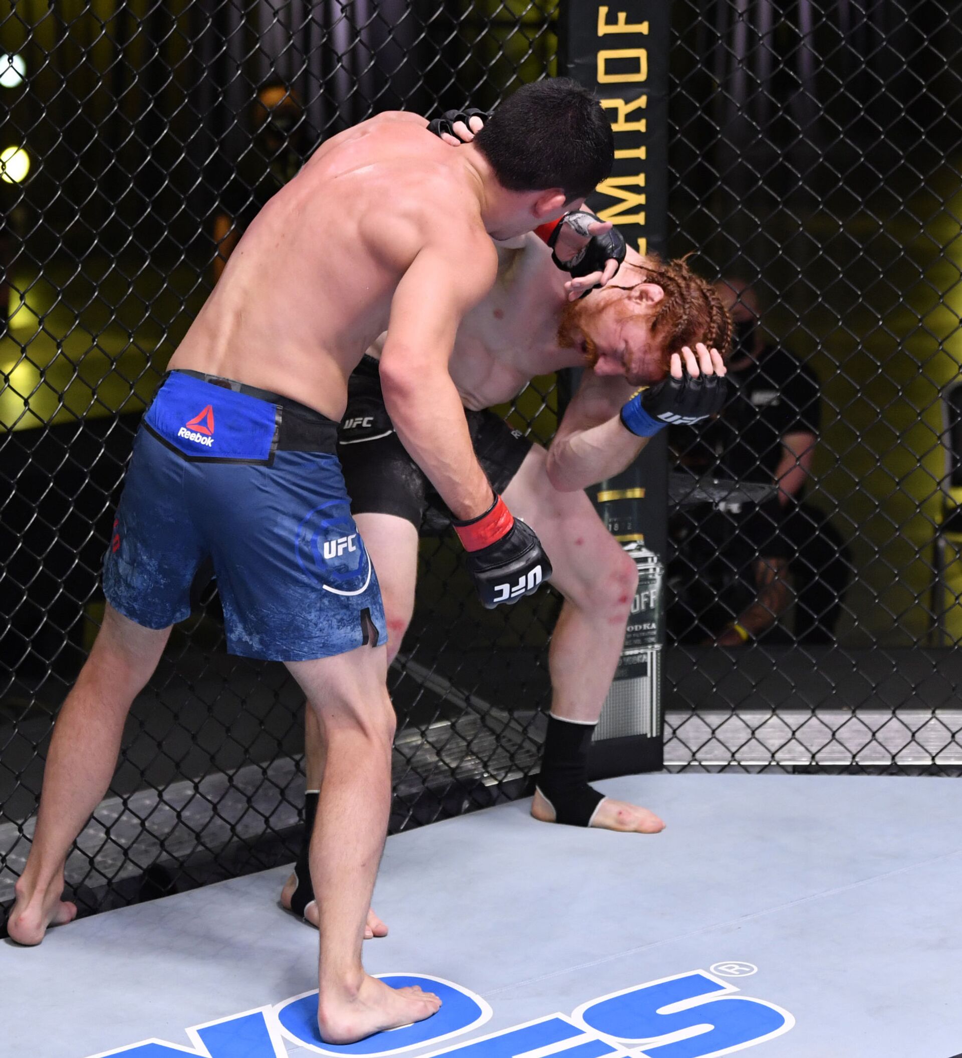 Quarantillo aprovechó la oportunidad inesperada y rápidamente se paró para atacar al oponente. Para suerte de Carlyle, el asalto acabó antes de que su rival lograra golpearlo.