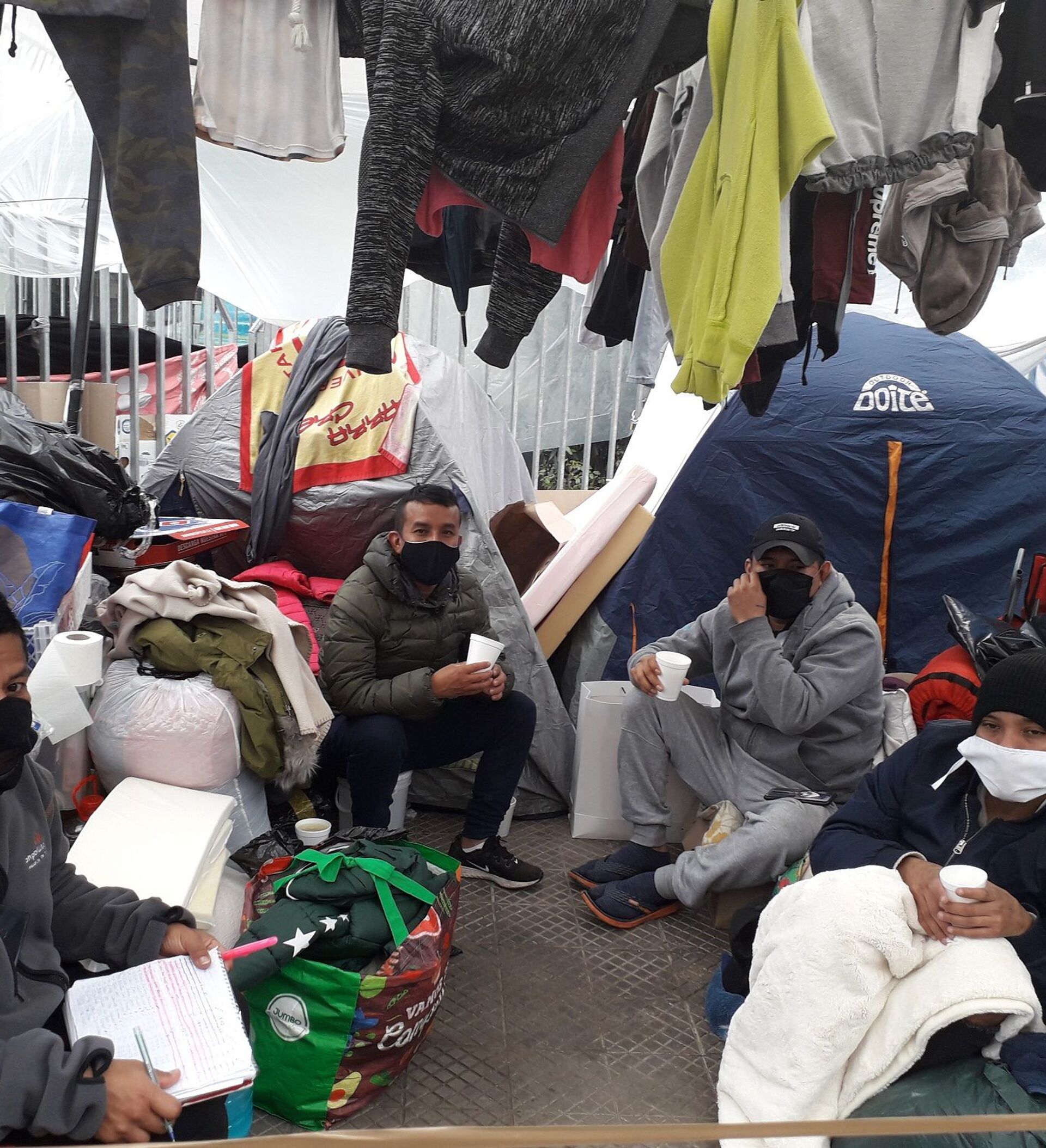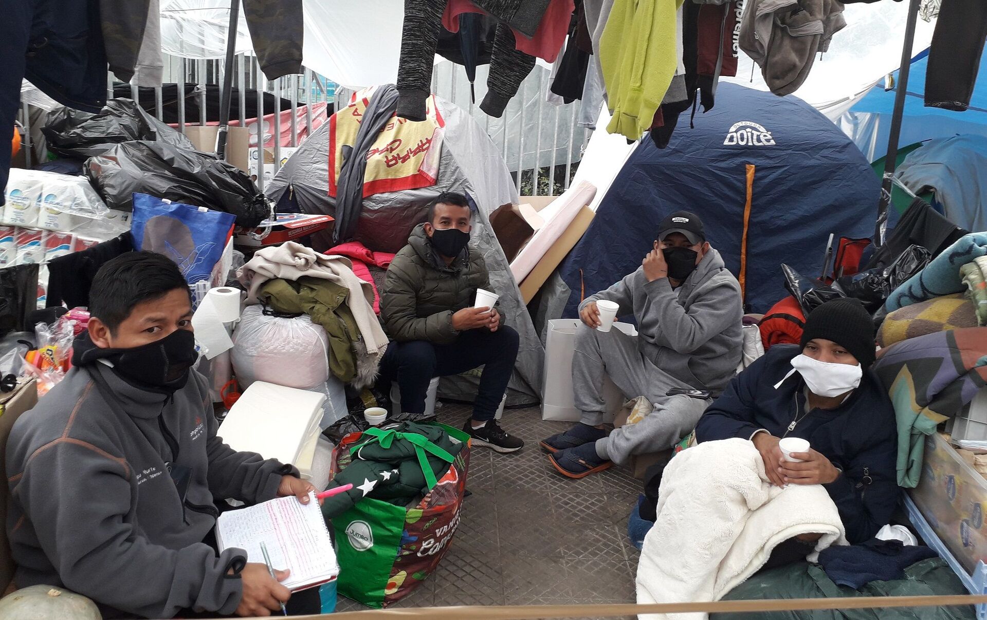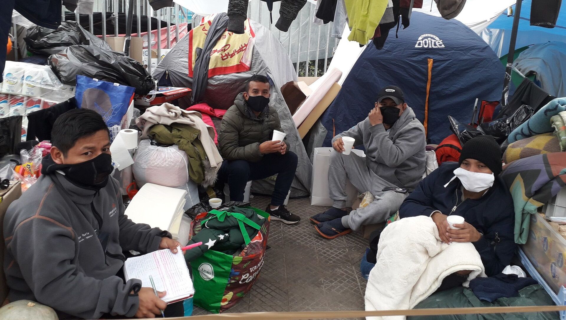 "El frío ha sido muy fuerte, la ropa se ha humedecido y el agua se filtra, pero no nos queda otra que esperar porque no hay donde vivir, y solo queremos regresar a Perú", señala Nilda, joven peruana en conversación con Sputnik, quien no quiere irse a un albergue, al igual que Silvia Verónica, quien prefiere estar en la calle hasta que repatrien, para así evitar el riesgo de contagiarse de COVID-19.