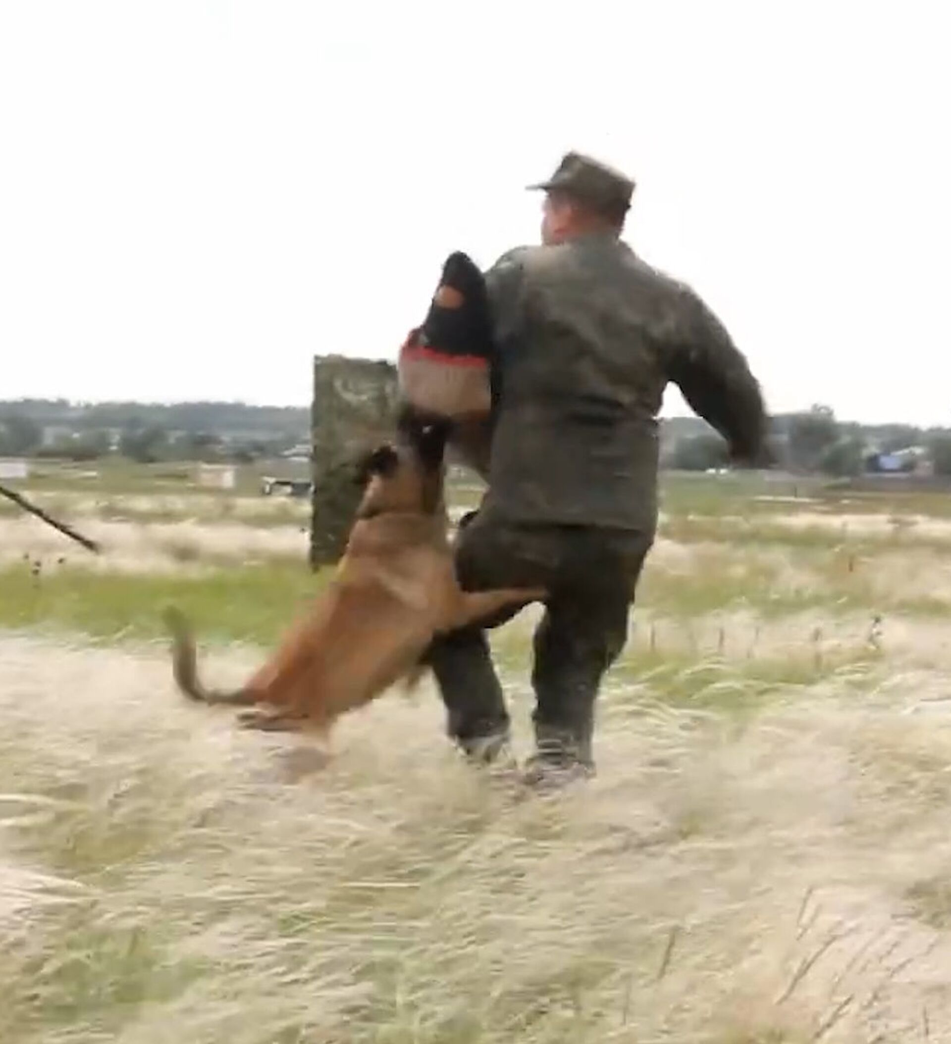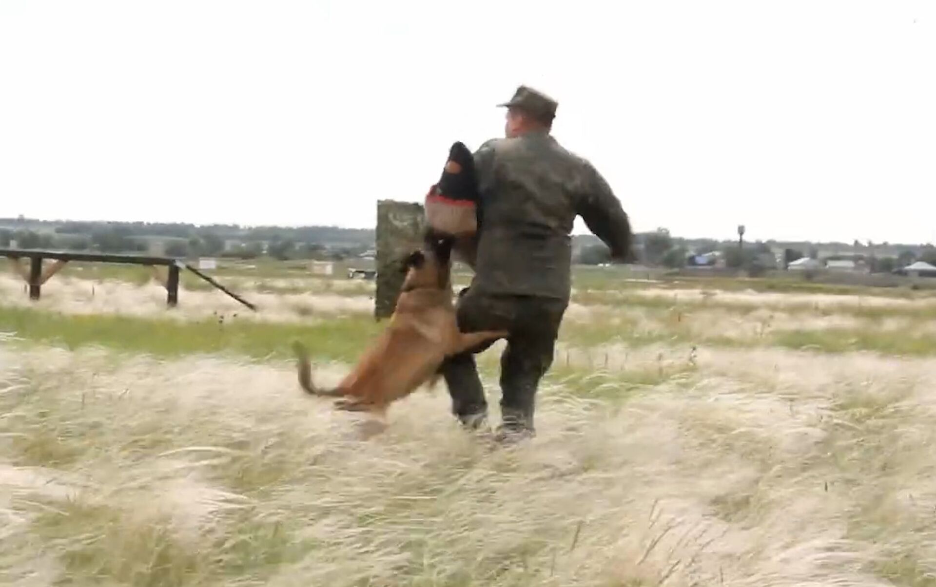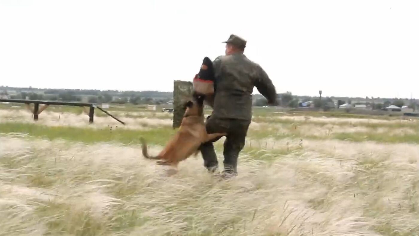 En la grabación publicada por el Ministerio de Defensa de Rusia se puede ver cómo un perro, acompañado por un adiestrador, atraviesa un circuito de obstáculos complicados y persigue a un militar en el papel de enemigo.