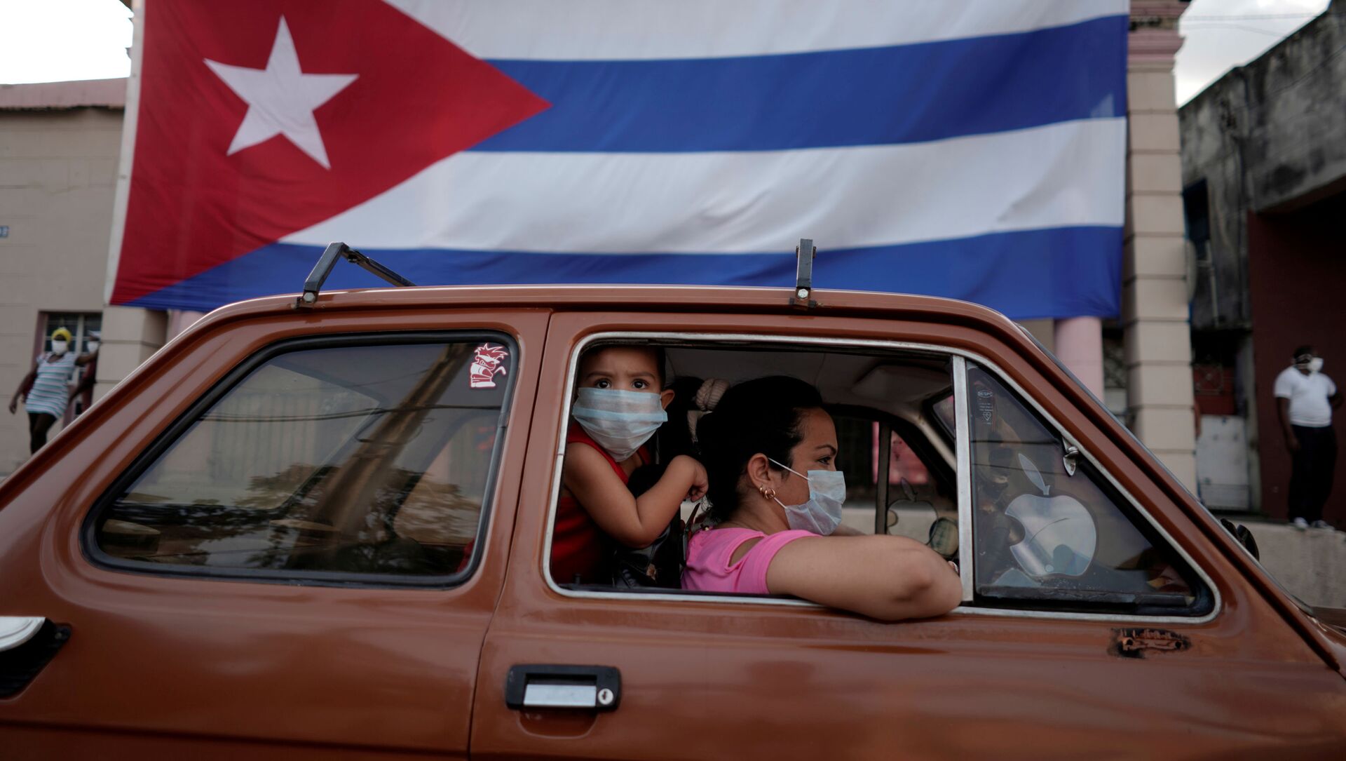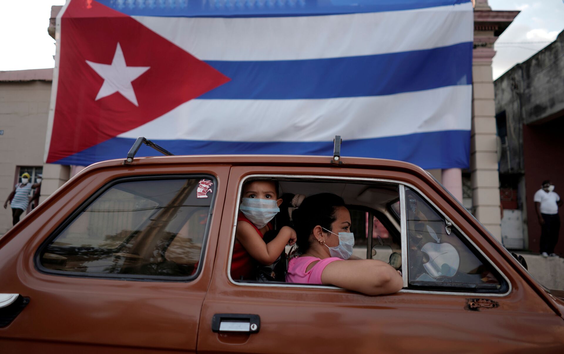 Dos persona el un coche y una bandera de Cuba - Sputnik Mundo